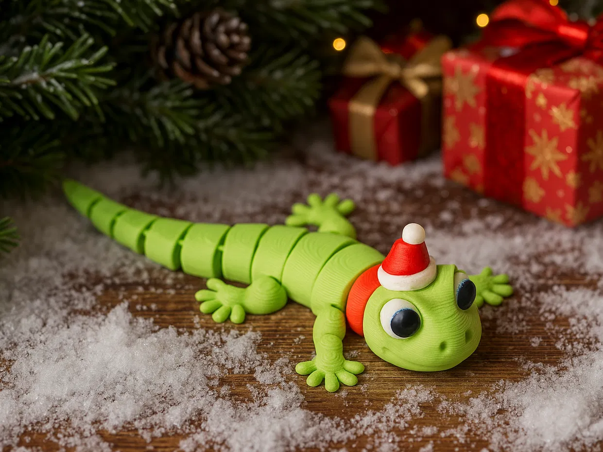 Mang không khí Giáng Sinh vui tươi về nhà với Thằn Lằn Giáng Sinh Flexi, món đồ chơi in 3D đáng yêu có thể tạo dáng dễ dàng. Với thiết kế mũ ông già Noel và khăn đỏ, chú thằn lằn linh hoạt này là quà tặng Giáng Sinh hoàn hảo, đồ trang trí hay bạn đồng hành thư giãn.