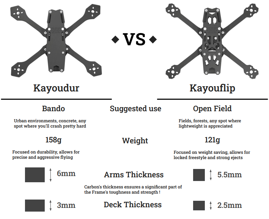 Chào mừng đến với hệ sinh thái Khung Kayou! Kayoudur 5" (KD) và Kayouflip 5" (KF) có cùng kích thước boong, vì vậy hầu hết các bản in tương thích 100% giữa hai loại. Hãy chọn khung phù hợp nhất với bạn… hoặc cả hai!