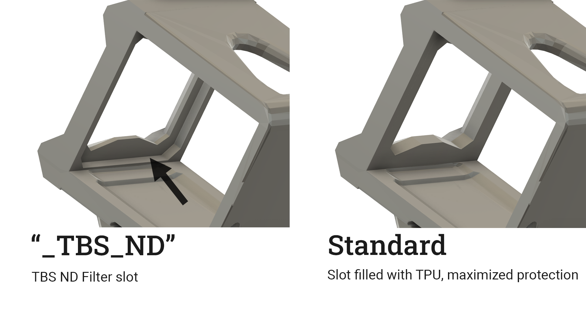 - "_TBS_ND": Bao gồm một khe cắm vừa với Bộ lọc TBS ND. Chúng là những miếng kính dày, nhưng vẫn là kính nên chúng sẽ bị vỡ. Nếu bạn không bay với chúng, các phiên bản tiêu chuẩn sẽ không có khe cắm đó và sẽ cung cấp sự bảo vệ tốt hơn.