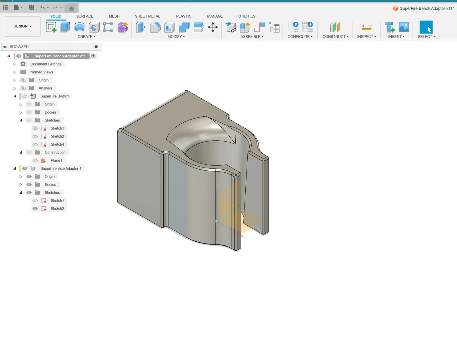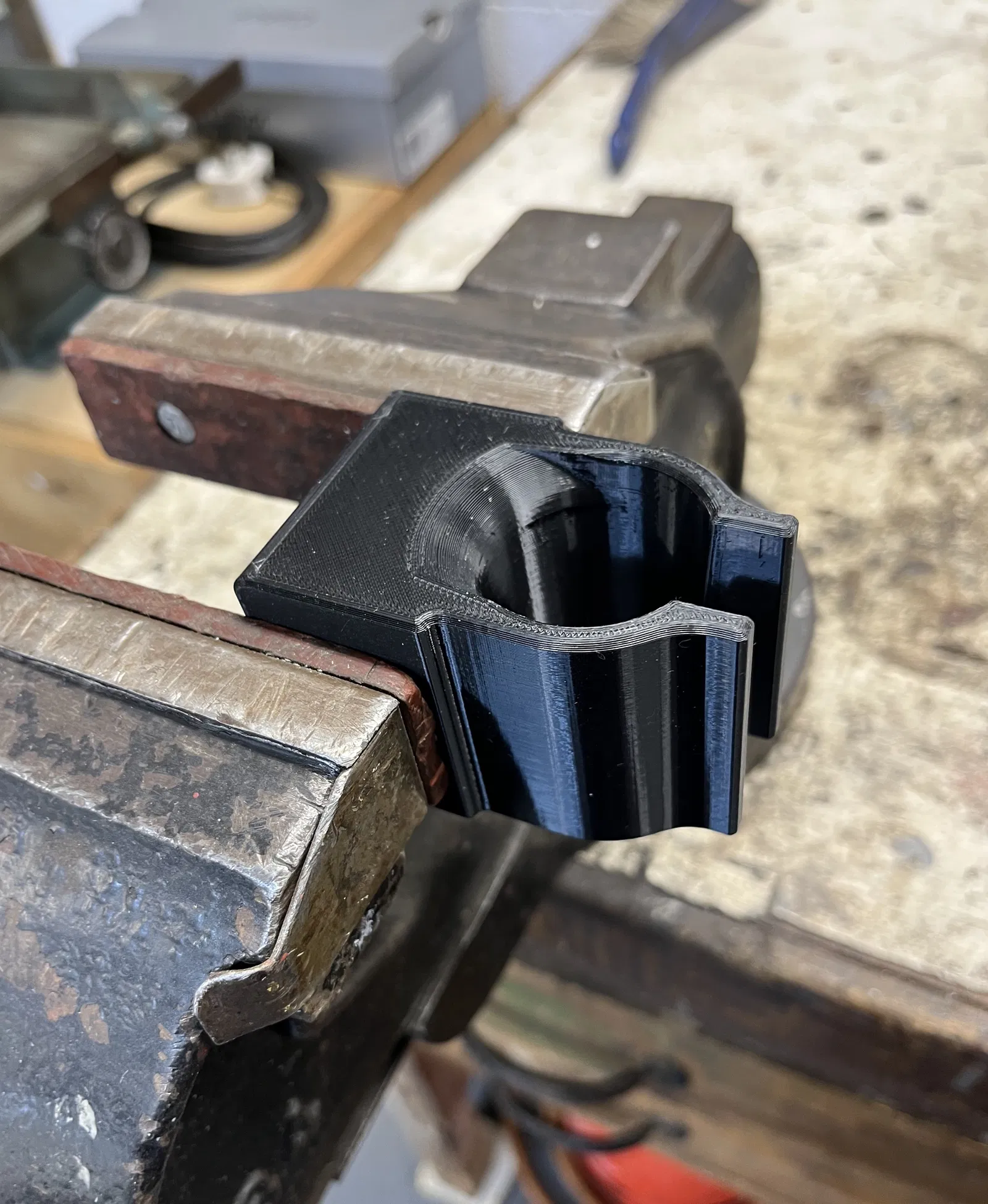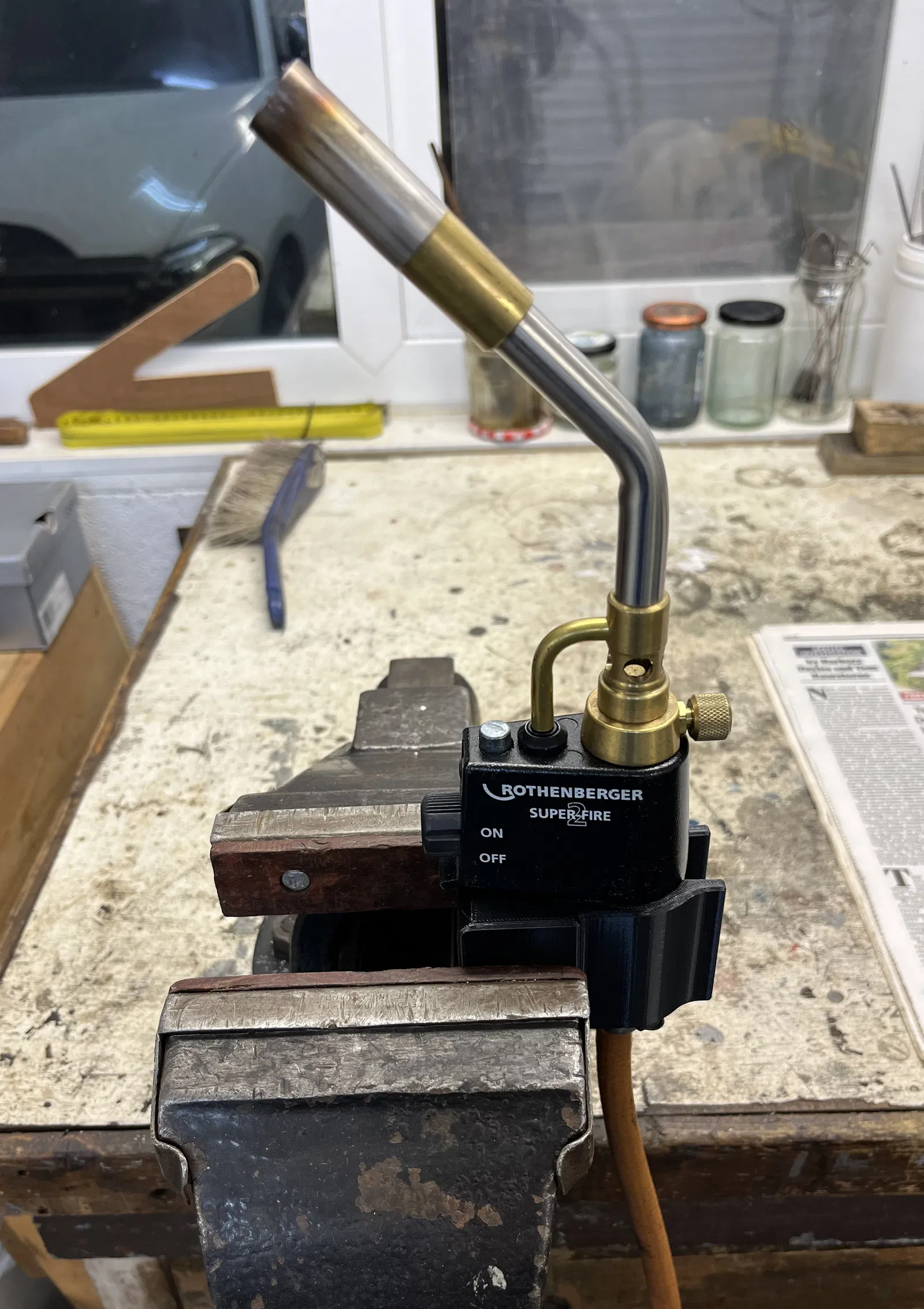 Khi xài với bình ga tích hợp sẵn, cái SuperFire có thể tự đứng vững trên đế bình, không cần cầm. Còn với bình ga rời thì anh em phải cầm nó khi xài, và ngay cả sau đó cũng cần một bề mặt an toàn để đặt nó xuống. Kẹp cái tay cầm đèn khò vô cái ê tô thì không an toàn (vâng, tui cũng từng làm vậy!) vì nó không có bề mặt phẳng/song song. Vì vậy, tui đã thiết kế một cái bao đơn giản có thể kẹp vô ê tô và giữ đèn khò chắc chắn khi nó đang cháy hoặc giữa các lần sử dụng.