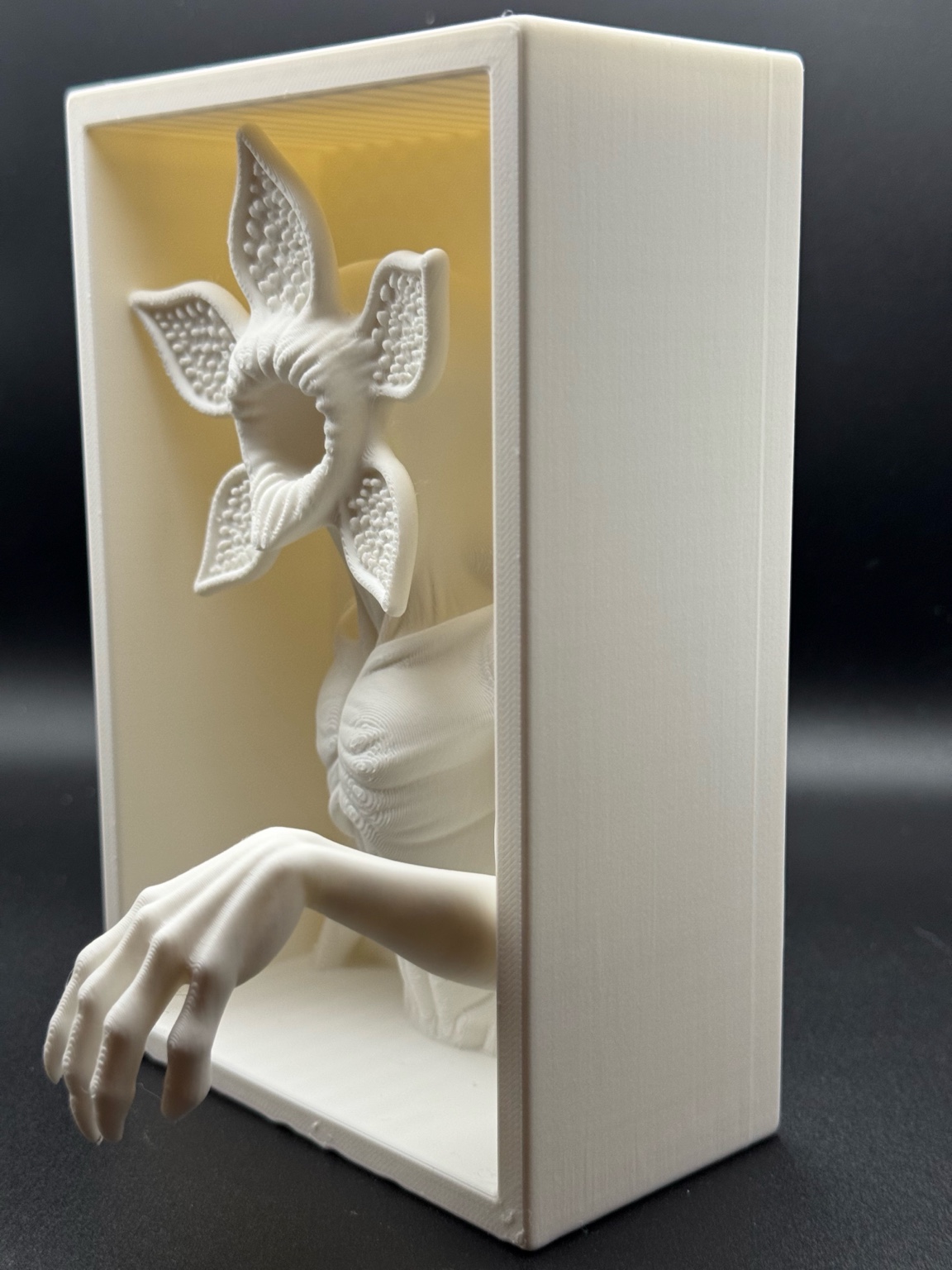 Shadowbox 3d hình Demagorgone.Chân đế chỉ có ở bên ngoài hộp, rất dễ tháo. In bằng PLA Polymaker Polyterra Cotton White. Chúc bạn in tốt và vui vẻ.