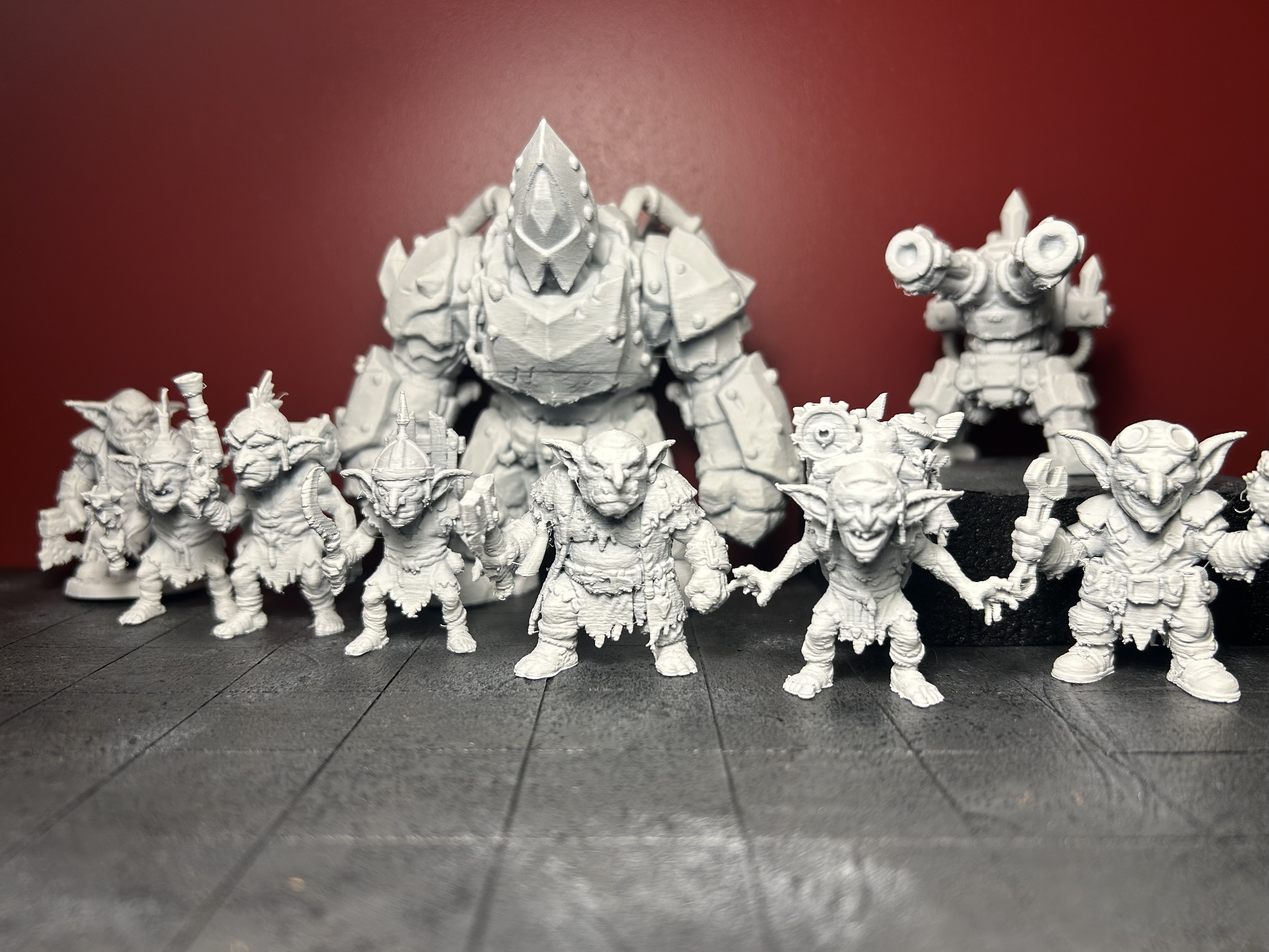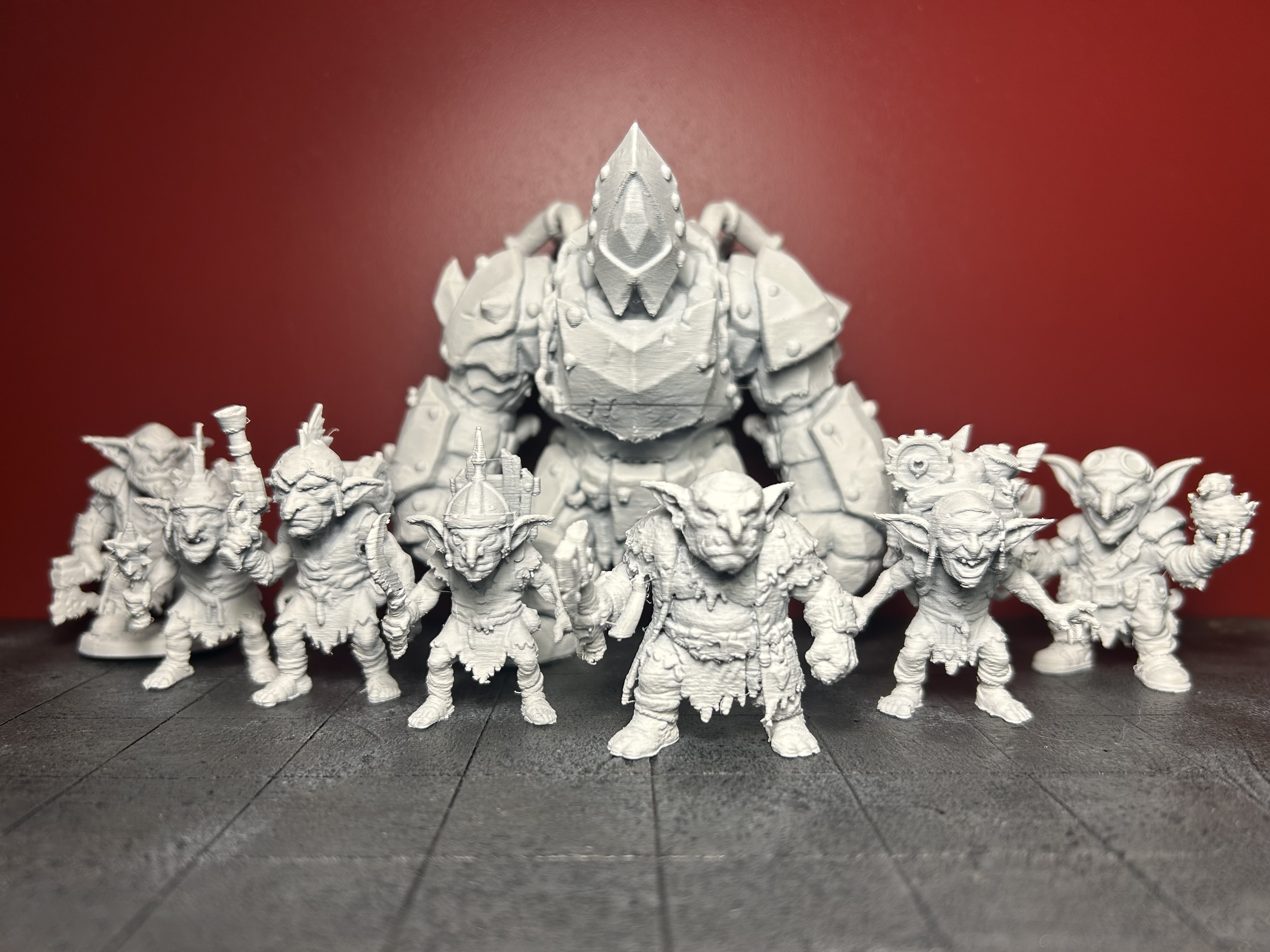 Bộ gồm 15 STL - Một bộ giáp máy khổng lồ làm trung tâm, đóng vai trò trùm cuối trong một nhiệm vụ one-shot, cùng với 11 NPC goblin và một đế theo chủ đề riêng của bộ!