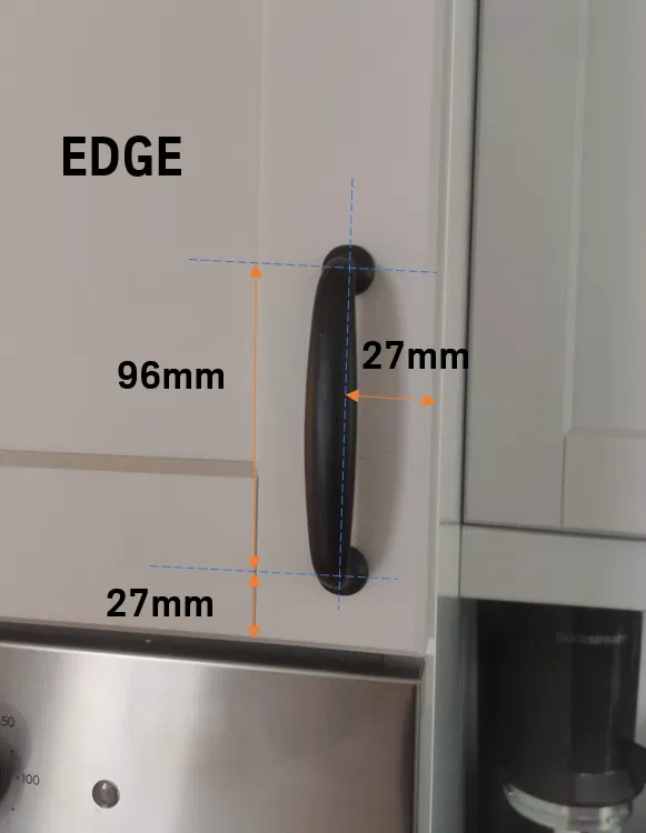 Bohrschablone für IKEA METHOD Küchen mit LERHYTTAN Front und ENERYDA Griffen. Der Lochabstand beträgt 96 mm (für 112 mm Griffe) und die Griffe sitzen 27 mm von der Außenkante des umlaufenden Rahmens.
