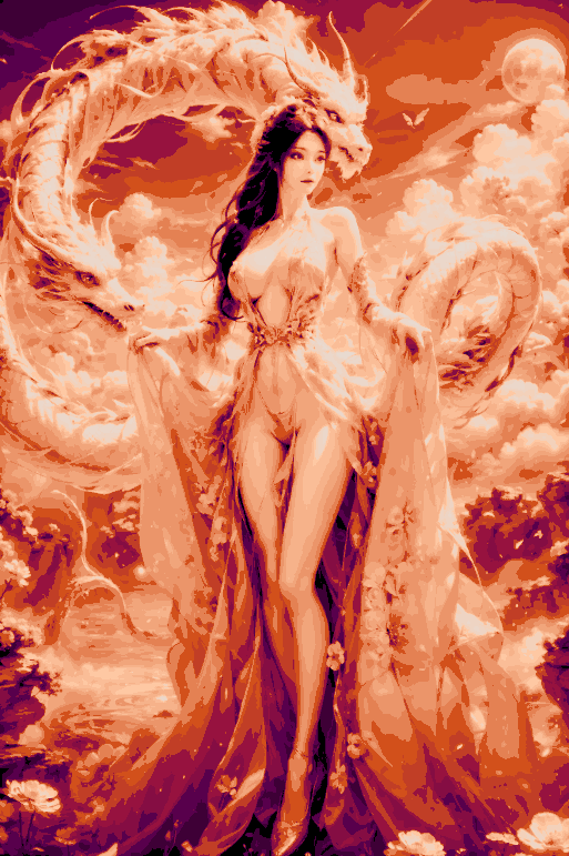 Mô hình Yun Yun bên Rồng này được in với độ cao lớp 0.08mm và 100% infill. Kích thước 133.33x200mm, sử dụng 6 màu filament khác nhau bao gồm Black, Fuschia, Red, Orange, Skin và White.