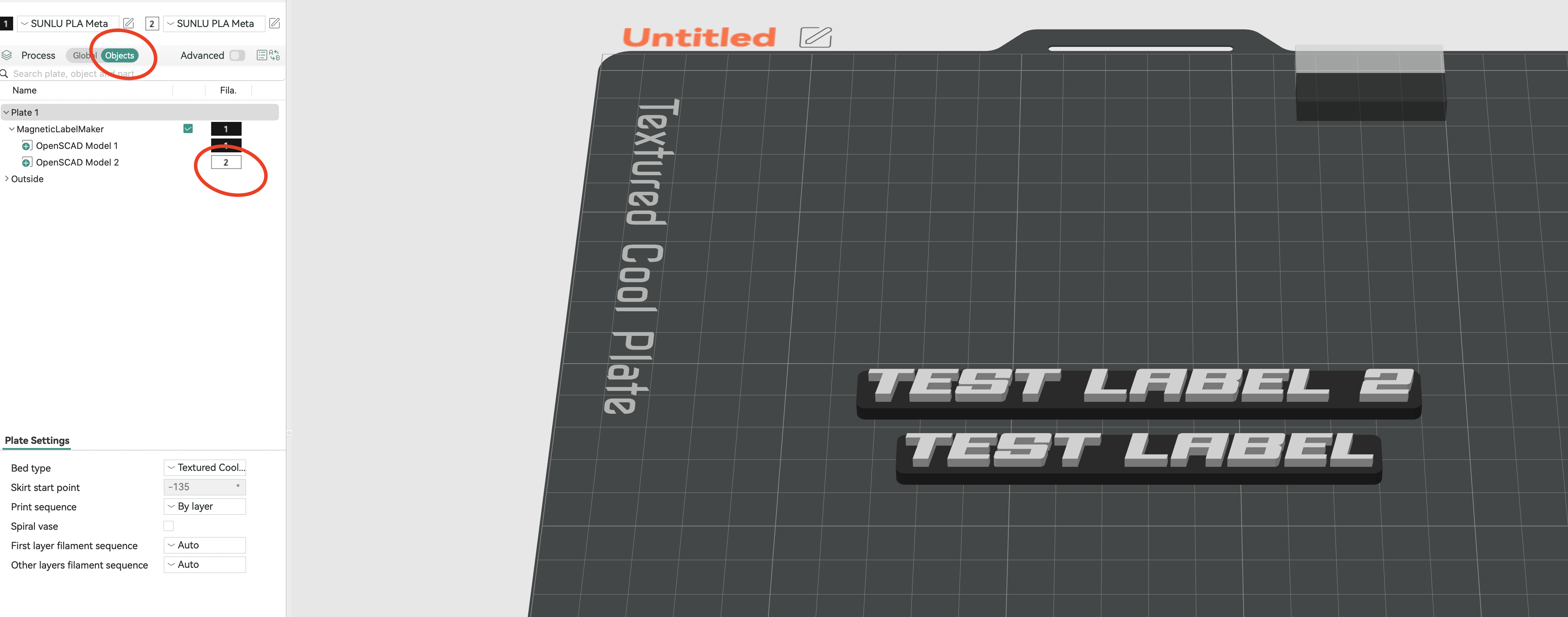 - Vào menu Objects, “OpenSCAD Model 1” đại diện cho tất cả các đế, “OpenSCAD Model 2” là tất cả các bộ phận chữ. Đặt màu sắc hoặc filament mong muốn cho mỗi loại.