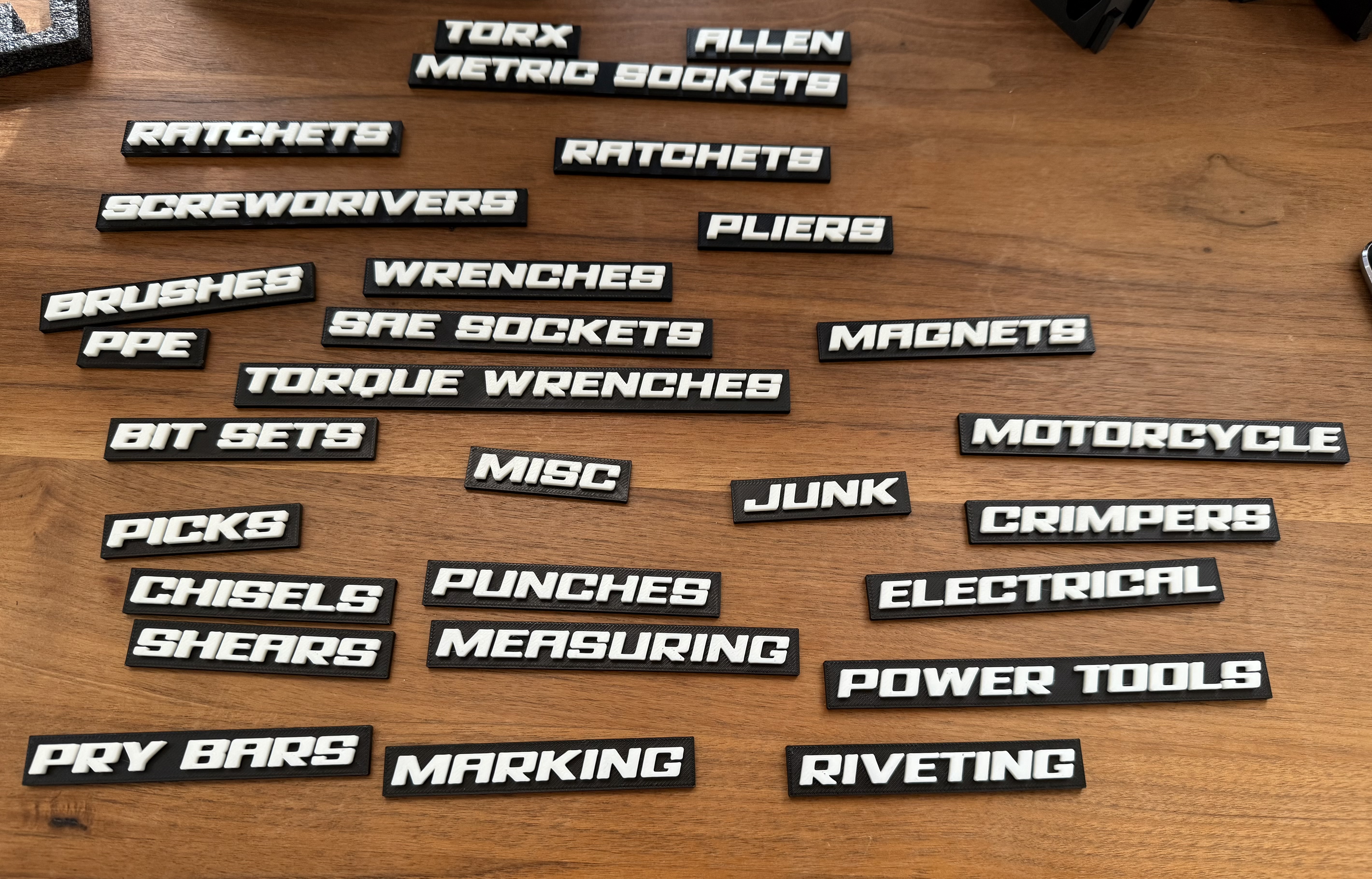 Tổ chức và dán nhãn cho ngăn kéo tủ đồ nghề (hoặc bất cứ thứ gì) của bạn bằng những chiếc nhãn nam châm đẹp mắt. Công cụ này được viết bằng OpenSCAD, cho phép bạn tùy chỉnh kích thước, độ sâu, và khoảng hở nam châm. Dễ dàng tạo nhãn hàng loạt cho tủ đồ nghề và xe đẩy.