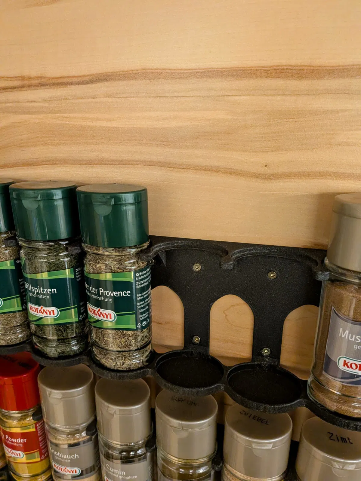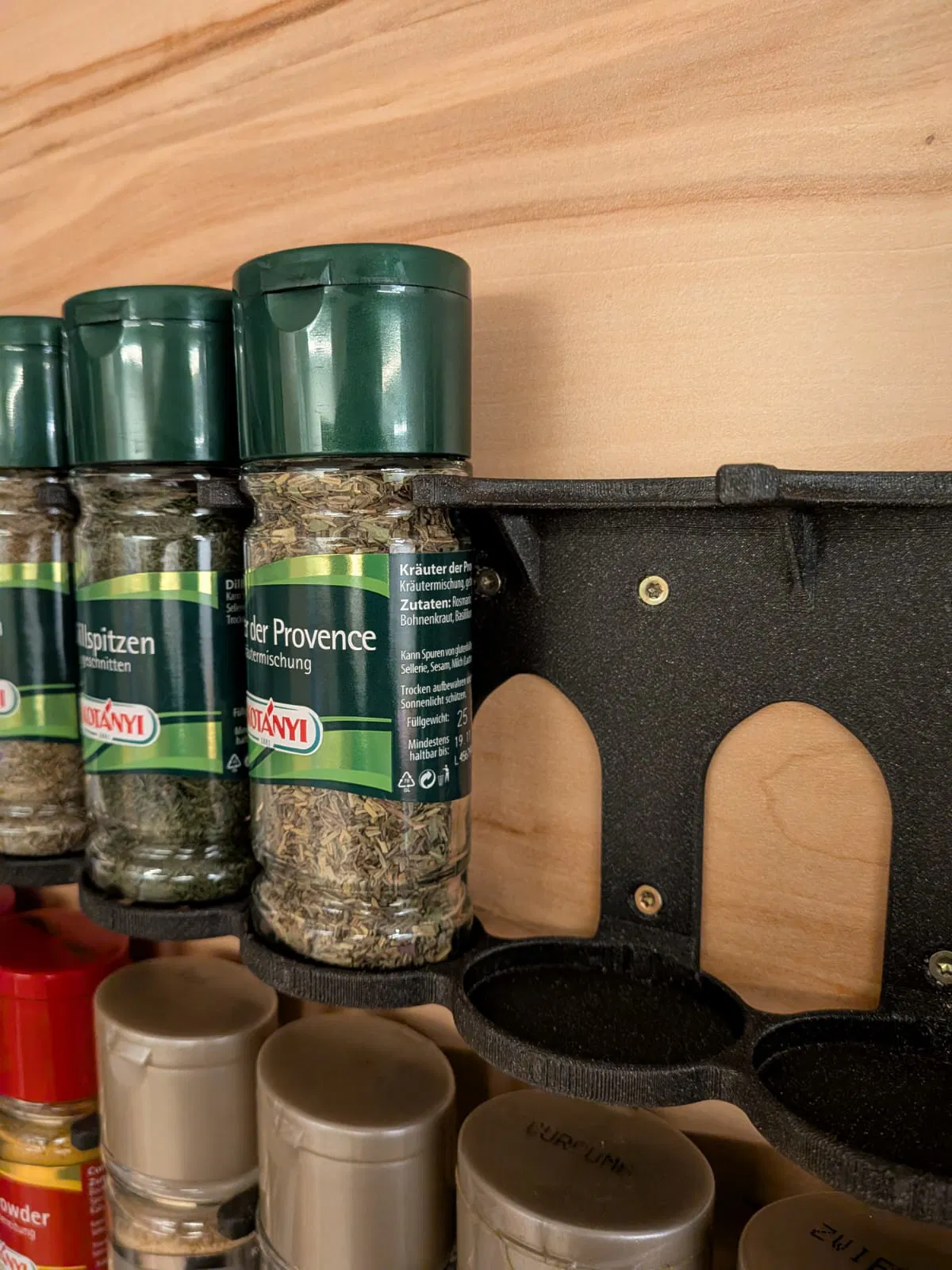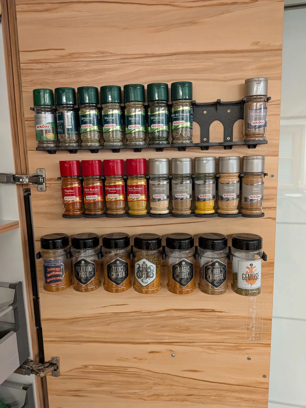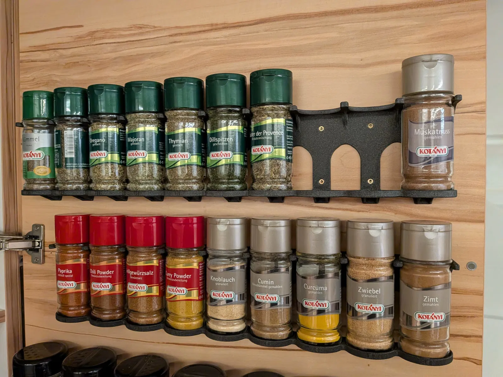 Cái giá đỡ thực tế cho hũ gia vị Kotanyi trên cửa tủ.