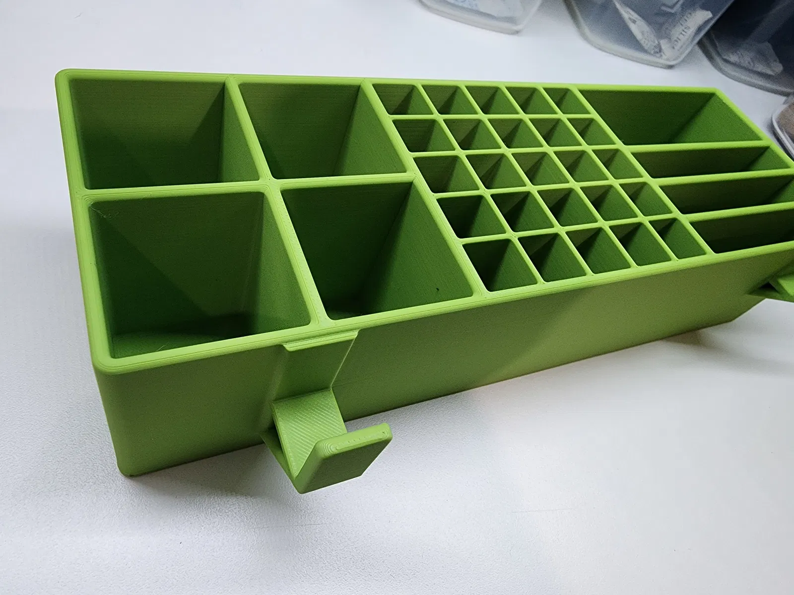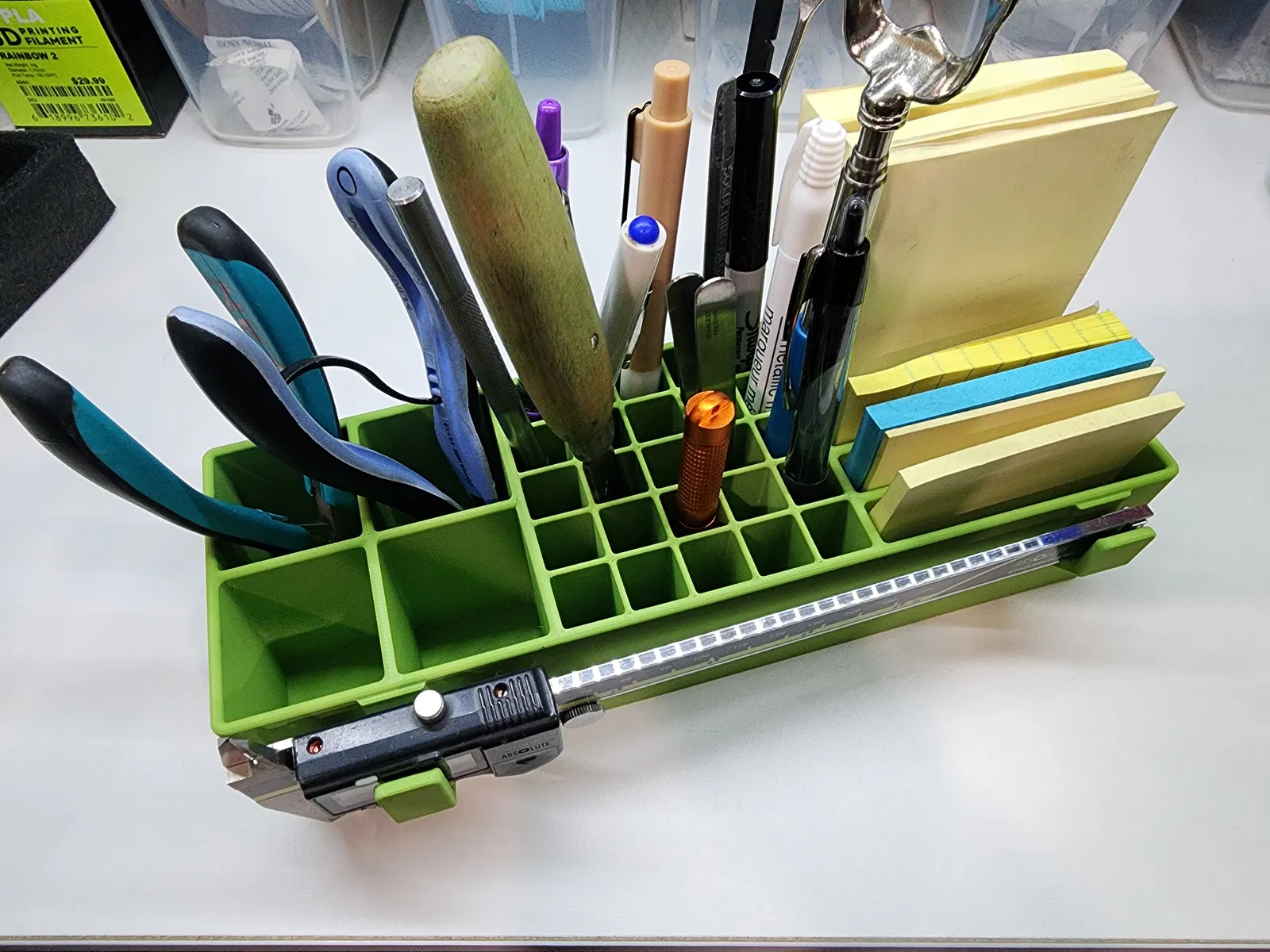 Cái này là cái hộp đựng đồ để bàn có tích hợp Gridfinity và chỗ cắm thước cặp, có chỗ đựng giấy Post-It, bút viết và mấy dụng cụ bự hơn.