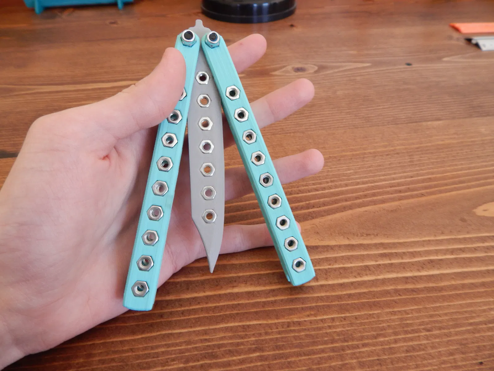 Mô hình balisong dễ in với các lỗ gắn đai ốc M4 để tăng trọng lượng. Bản in này dài hơn bản gốc một chút, có thể tùy chỉnh với lưỡi dao một cạnh hoặc hai cạnh. Cần 2 ốc M4-16mm, 2 đai ốc khóa M4, 4 vòng đệm M4 và 43 đai ốc M4 để tạo trọng lượng tối đa 70g.