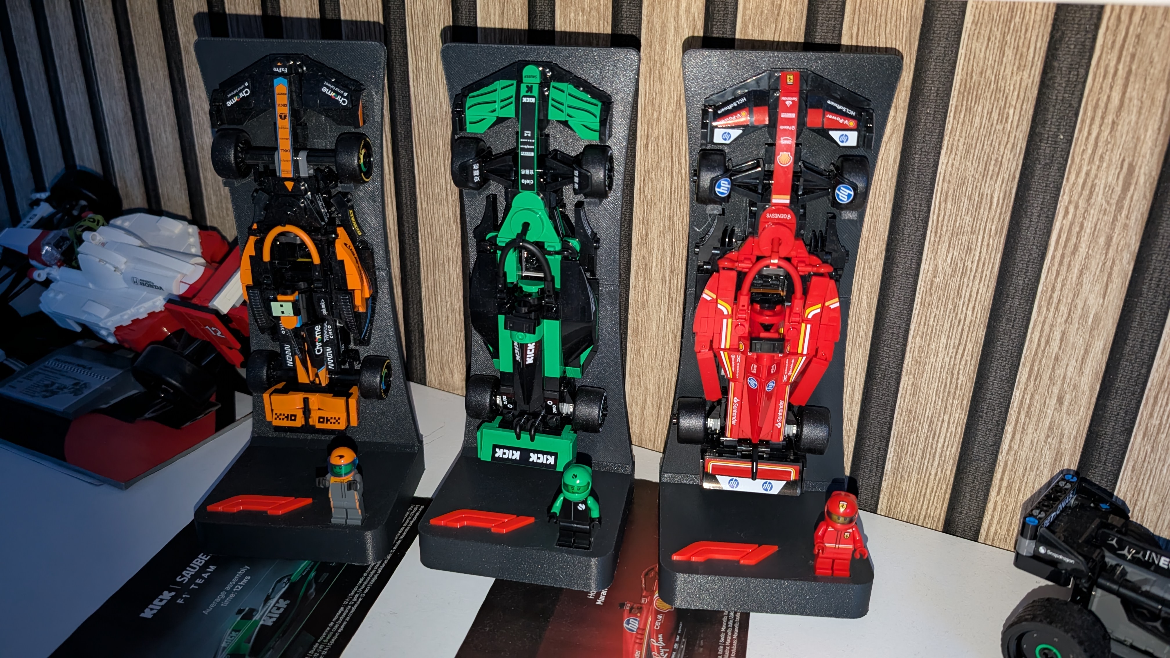 Giá đỡ độc đáo cho mô hình Lego Speed Champions F1, có logo F1 và khe cắm nhân vật. Không cần keo, chỉ cần in ra và sử dụng. Có phiên bản ghép cho máy in nhỏ.