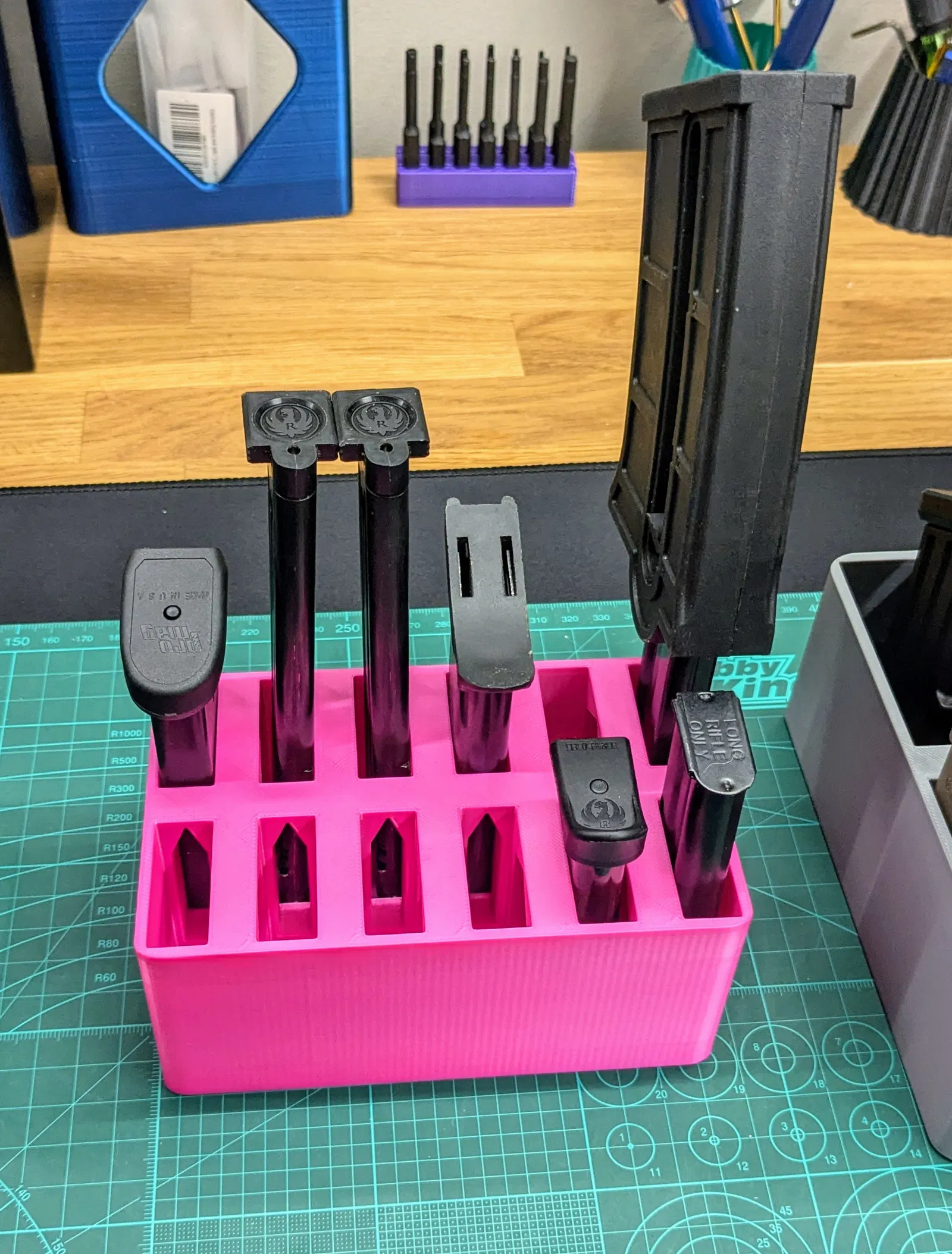 Phiên bản băng đạn đơn nên vừa với mọi băng đạn đơn 9mm trở xuống. Một loạt các băng đạn 9mm, 380 và 22LR được hiển thị.