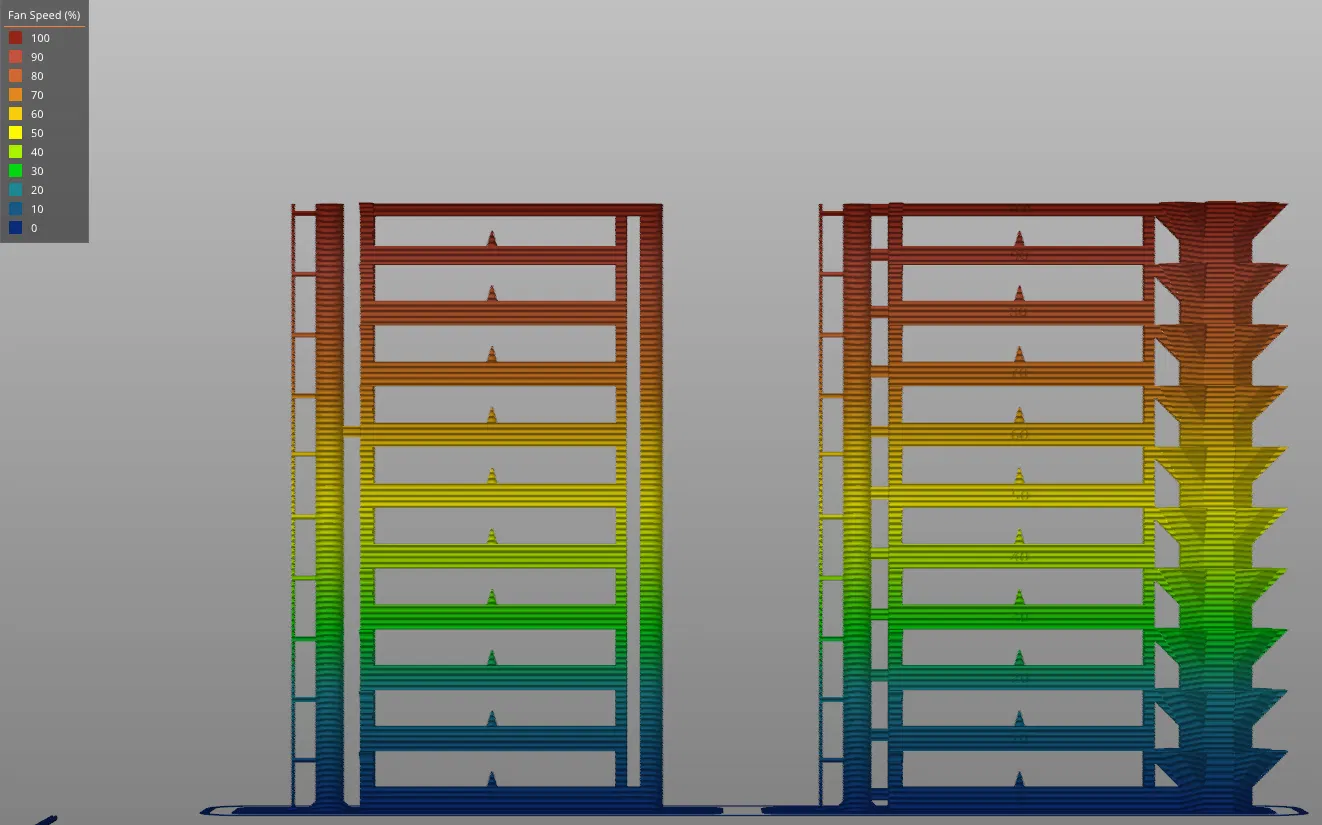 Bạn muốn gì: Bạn muốn chọn tốc độ quạt mang lại khả năng bắc cầu tốt, chi tiết tốt, chất lượng bề mặt tốt và có ít sợi nhựa thừa nhất. Đôi khi, bạn có thể đang sử dụng tốc độ quạt quá cao dẫn đến nhiều sợi nhựa thừa hơn và độ bám dính lớp / độ bền bộ phận kém hơn. Vì vậy, hãy bắt đầu từ dưới cùng và chọn cái nào trông đẹp nhất, và có thể thêm 5% tốc độ quạt để đảm bảo an toàn.