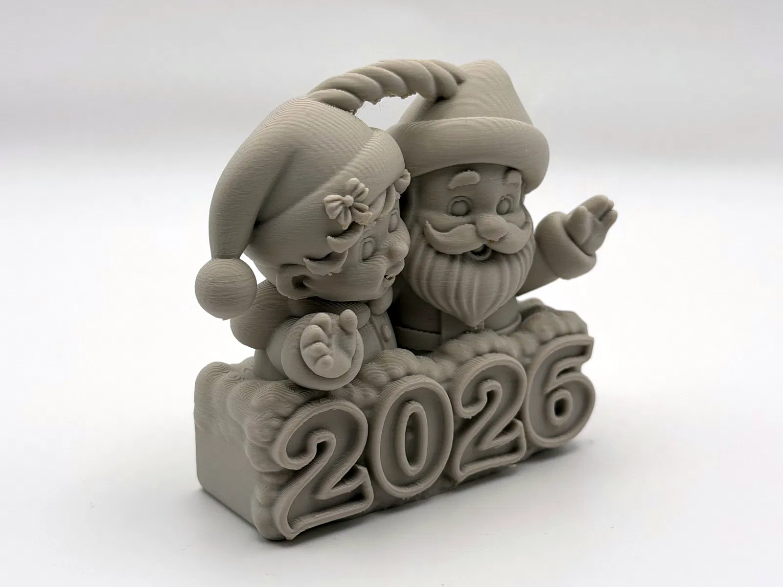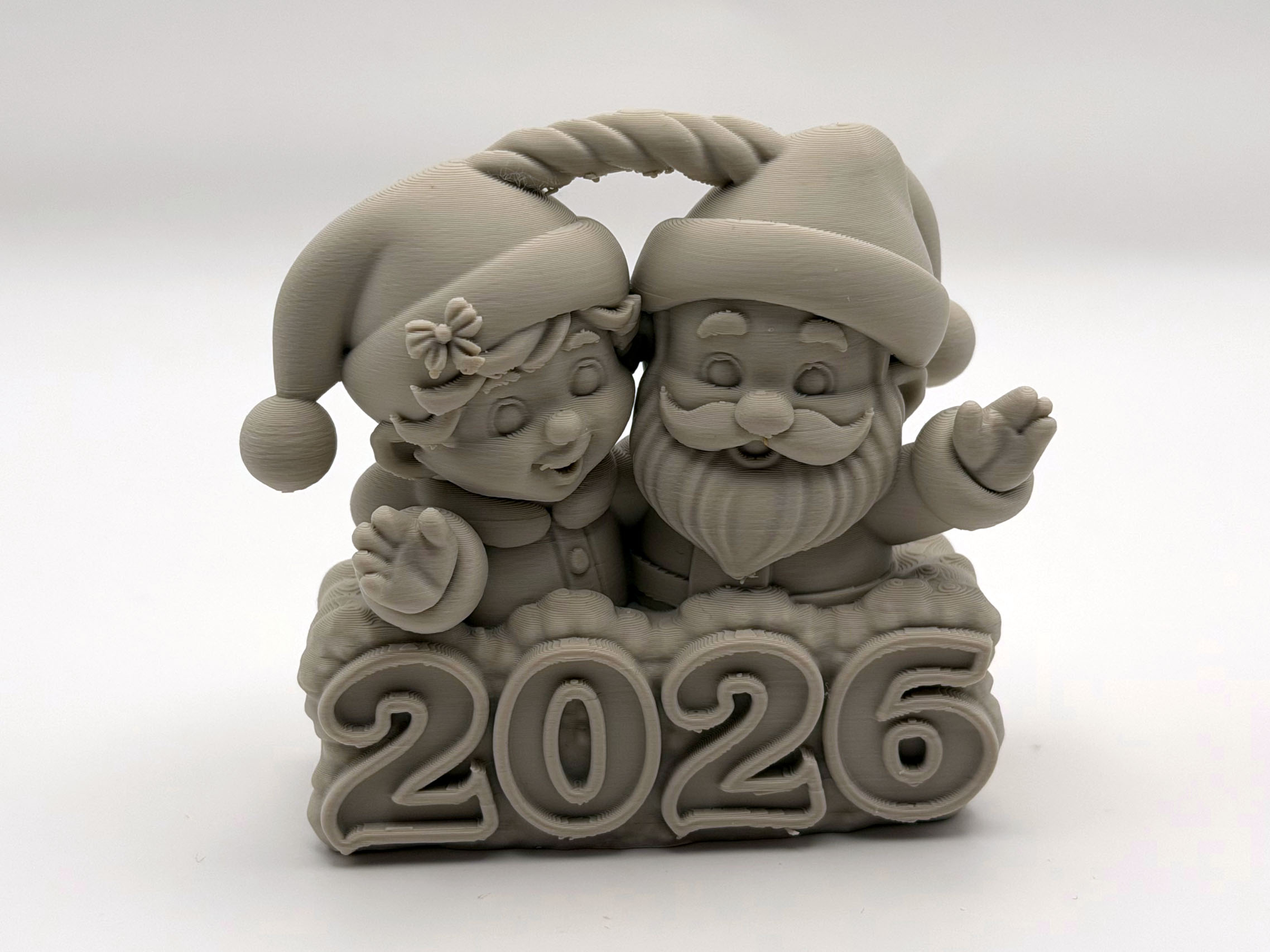 Thêm chút không khí lễ hội vui tươi cho trang trí nhà cửa của bạn với món đồ trang trí 3D xinh xắn này, có hình ảnh đôi Ông Già và Yêu Tinh đáng yêu đang vui mừng đón mùa lễ 2026! Kích thước hoàn hảo cho cây thông Giáng Sinh của bạn, thiết kế này nắm bắt được sự kỳ diệu và ấm áp của những ngày lễ.