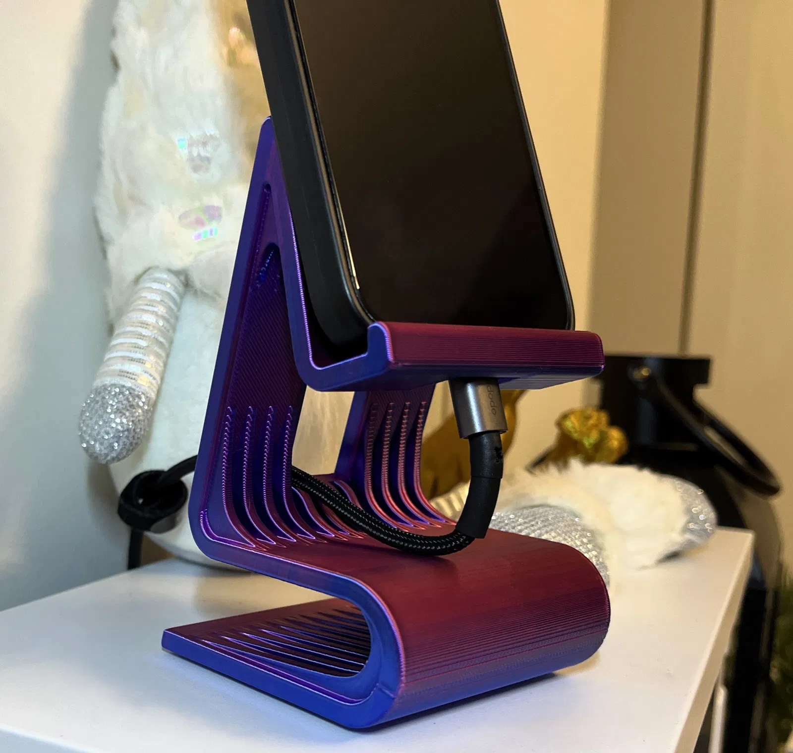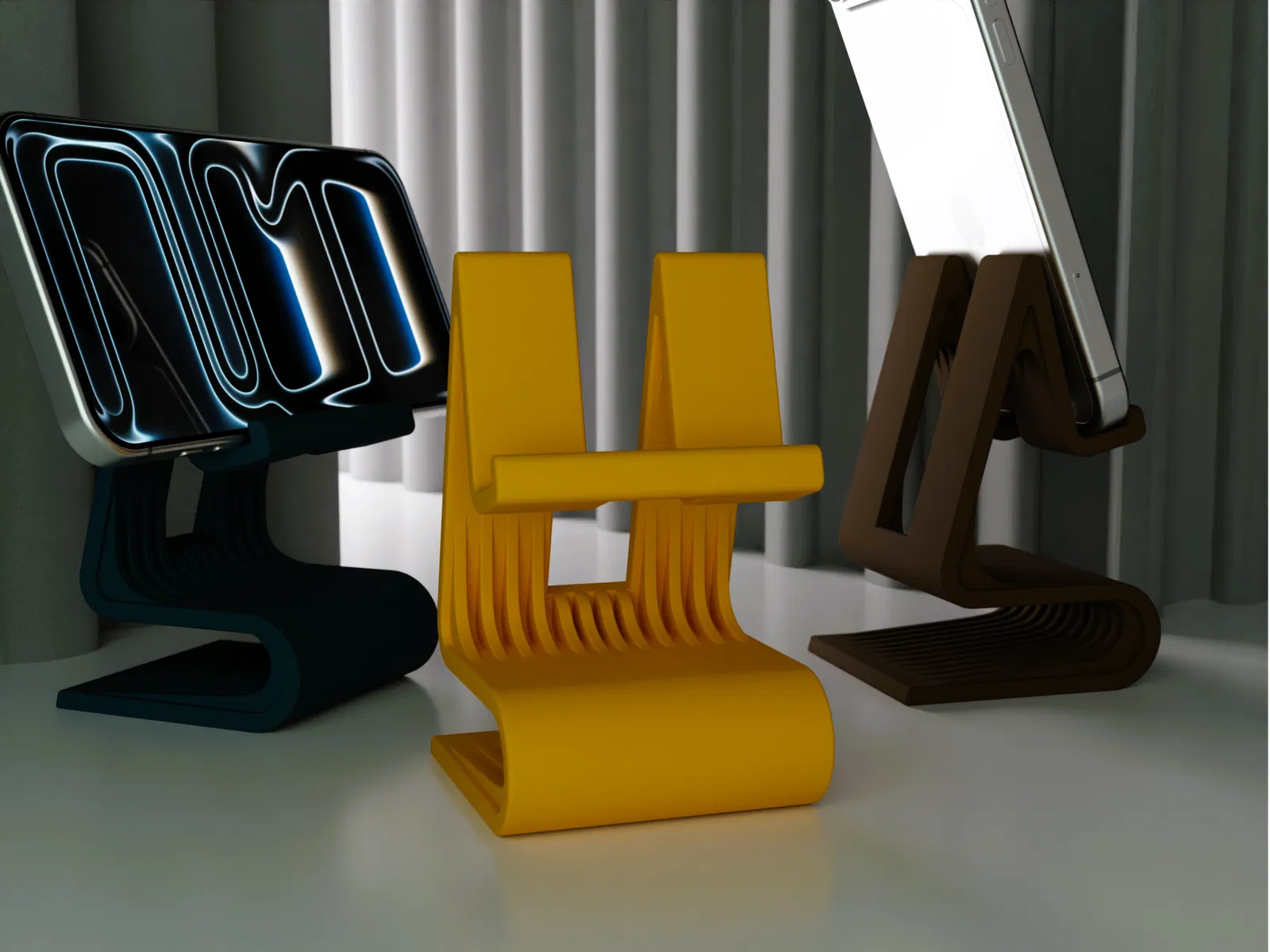 Một chân đế điện thoại thông minh tối giản được thiết kế tập trung vào thẩm mỹ, sự ổn định và tính ứng dụng thực tế. Các đường nét mượt mà và hình khối phân lớp mang lại vẻ ngoài hiện đại, đồng thời tạo ra độ cứng tuyệt vời trong một hình dáng gọn gàng.
