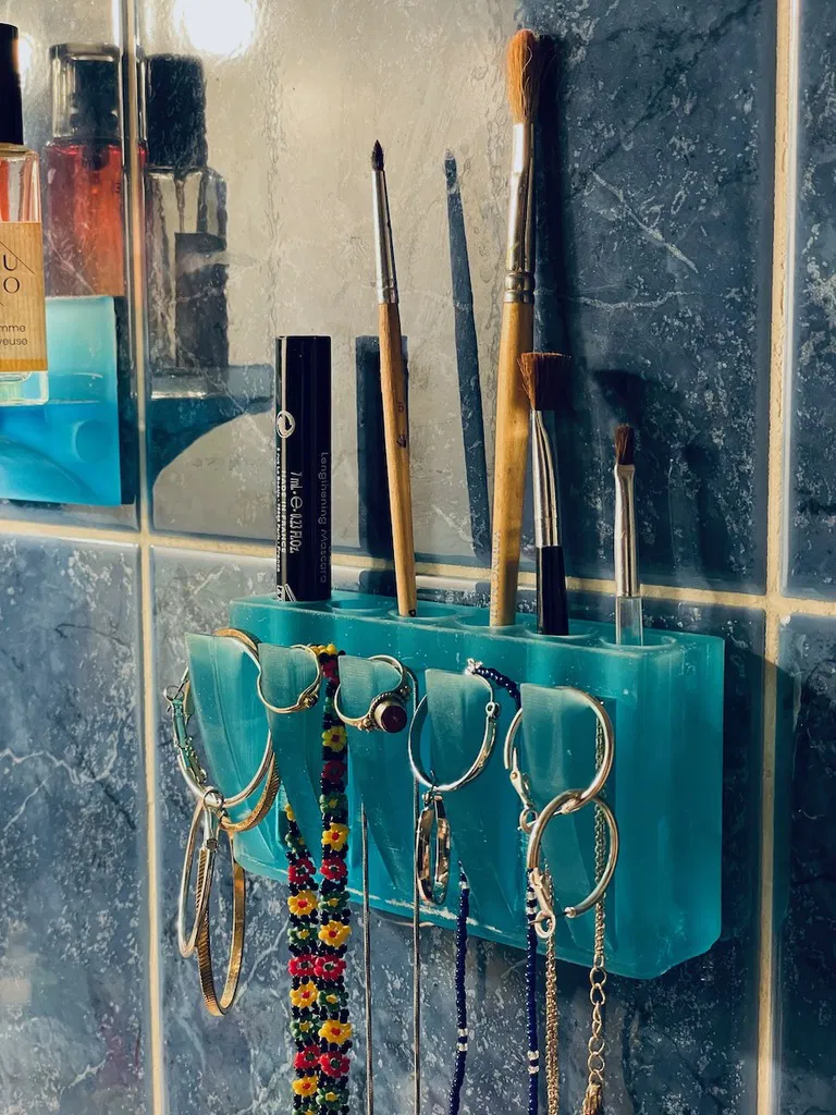 Con gái tôi cần chỗ để cọ trang điểm và mấy món dây chuyền, vòng cổ linh tinh trong phòng tắm. Thiết kế này in bằng vật liệu trong suốt nhìn rất đẹp, không cần supports, in trực tiếp trên khay máy Elegoo Mars 2.