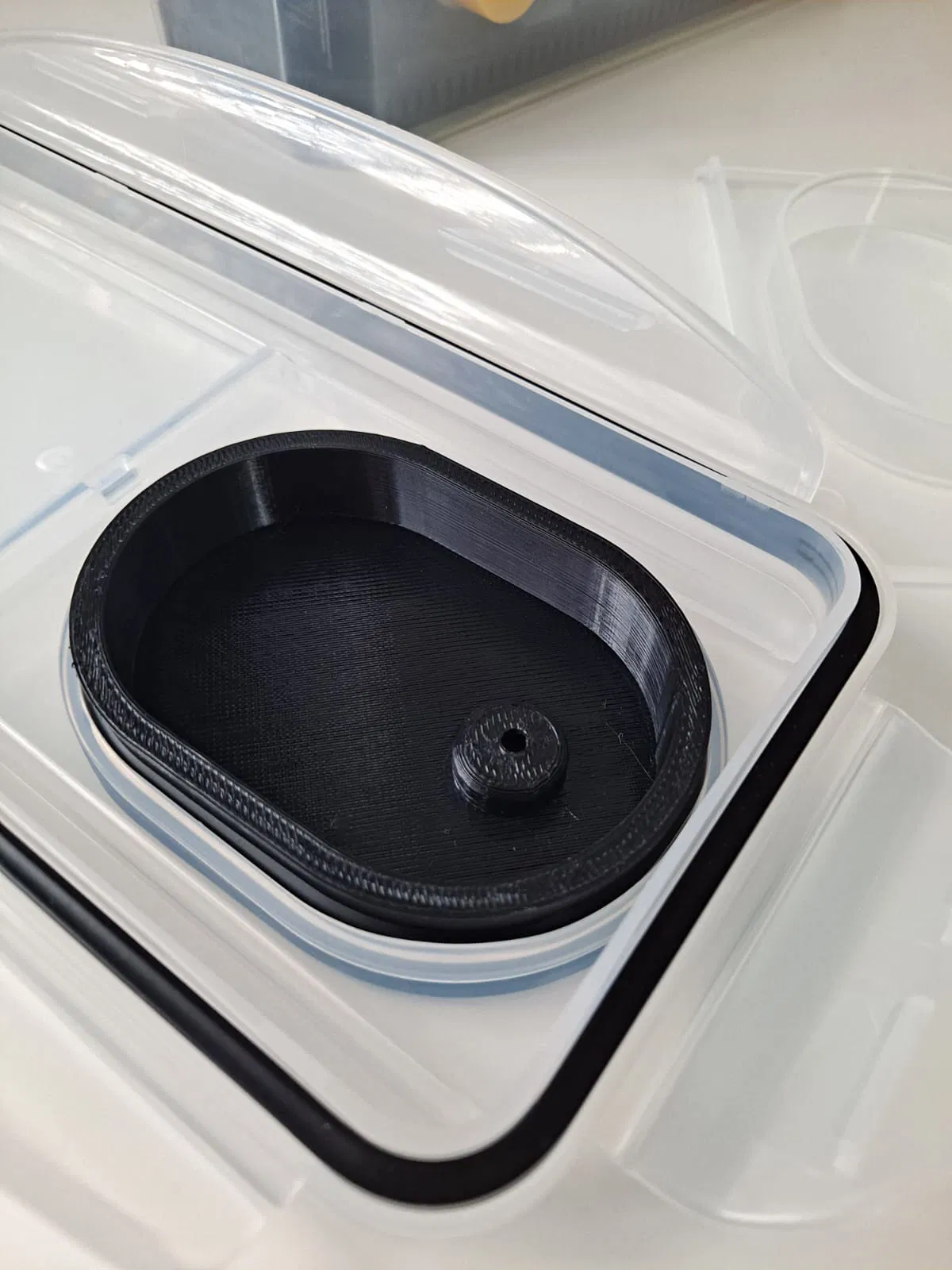 Lấy cảm hứng từ @AleksandrRybn_399649 và , tui cũng tự thiết kế cái hộp cho riêng mình. Dự án này không cần khoan đục gì hết trơn. Nó vừa khít với mấy cái hộp đựng thực phẩm của Amazon có nắp hình oval. Cái đế có con lăn cũng là chỗ để chứa gel hút ẩm, đựng được khoảng 60g đó nha.