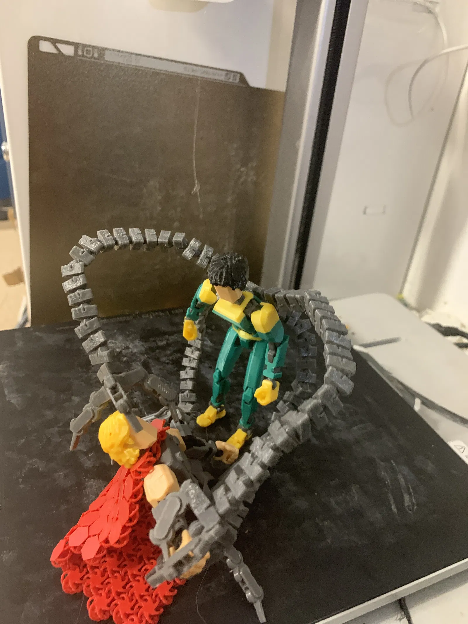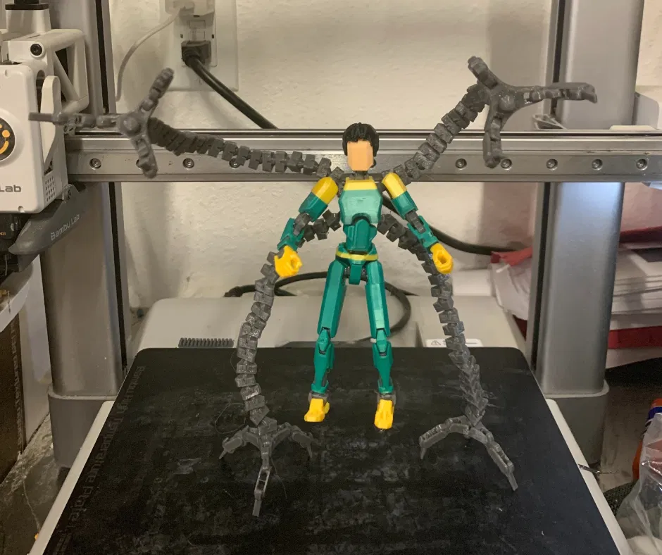 In ấn: Để có "vibe" Doc Ock đầy đủ, hãy dùng file AMS-MMU. Nếu không có AMS hoặc MMU, dùng phiên bản một màu. In khung và các tay bằng PETG. Giáp có thể in bằng bất kỳ vật liệu nào.
