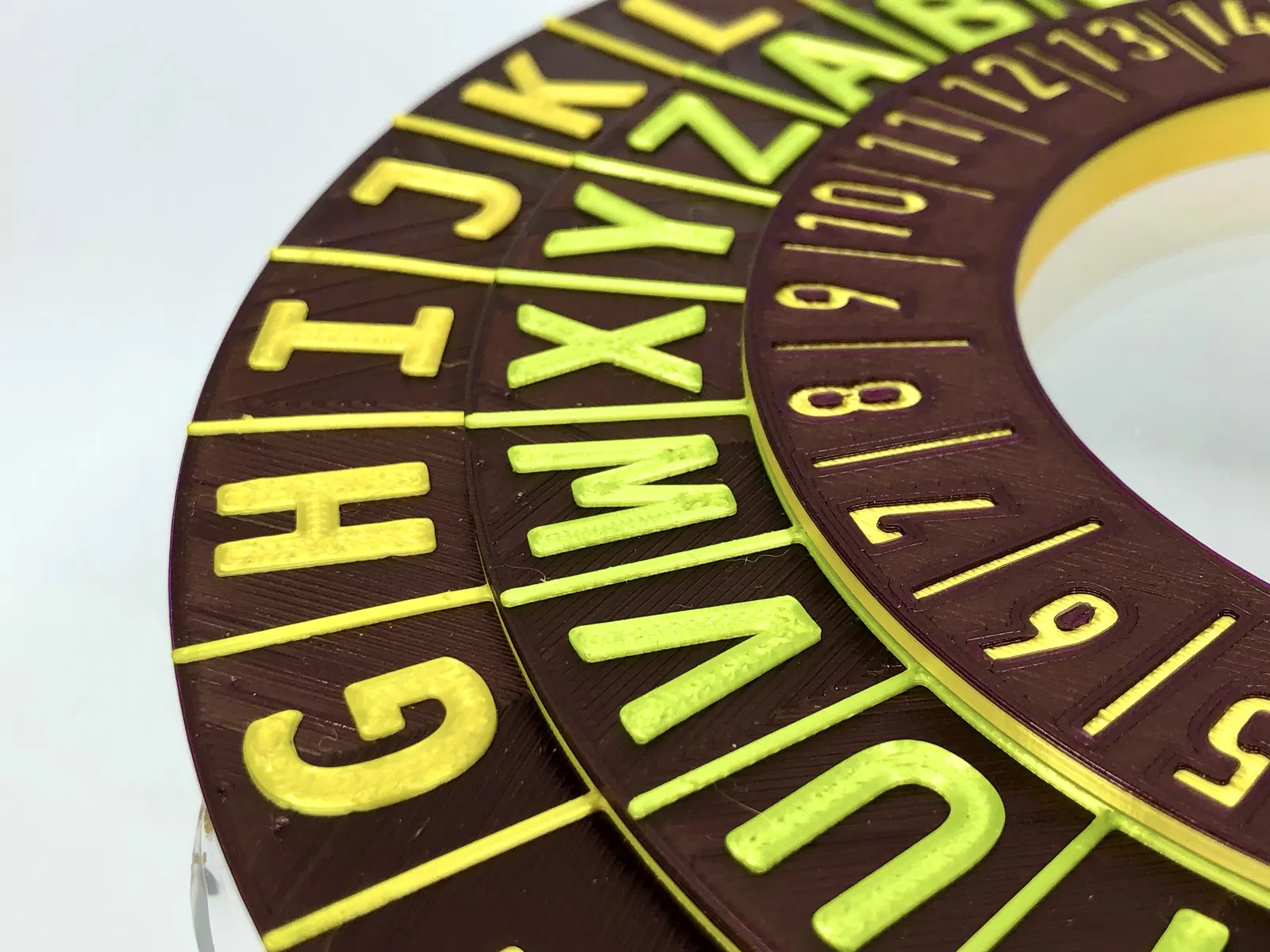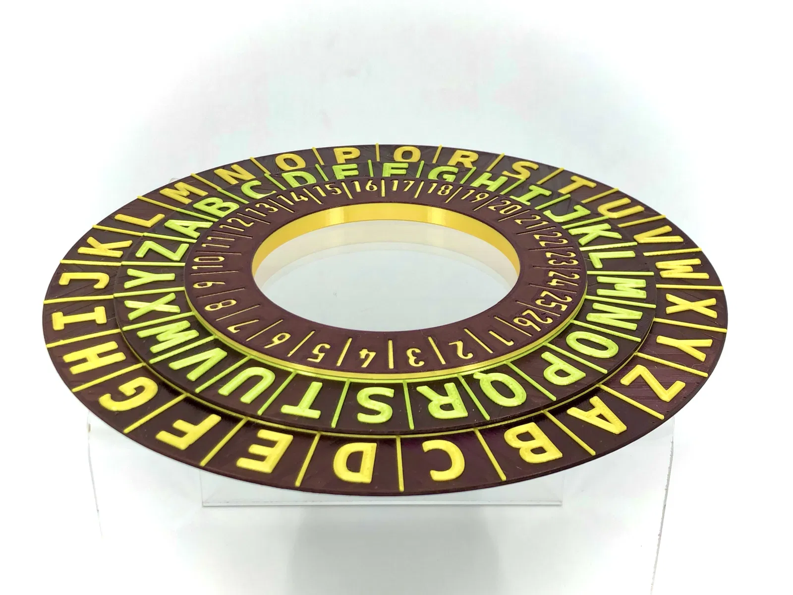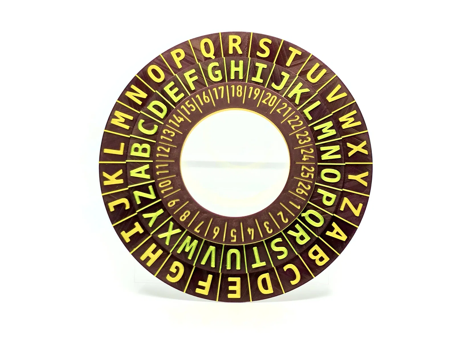 Chiếc nhẫn này là công cụ đơn giản để mã hóa hoặc giải mã văn bản bằng mật mã Caesar. Có thêm vòng xoay với số chữ cái để dễ dàng thay đổi vị trí dịch chuyển. Rất thích hợp để dạy trẻ em về mật mã học cơ bản. Các bộ phận in cần 2 màu, không cần supports. Lắp ráp đơn giản, có thể tùy chỉnh khả năng xoay.