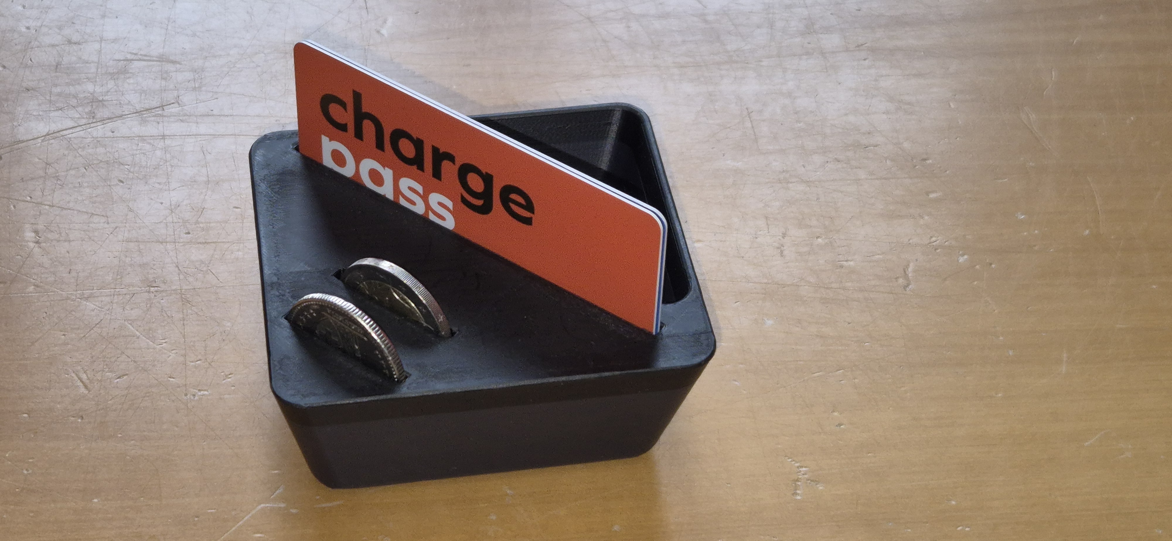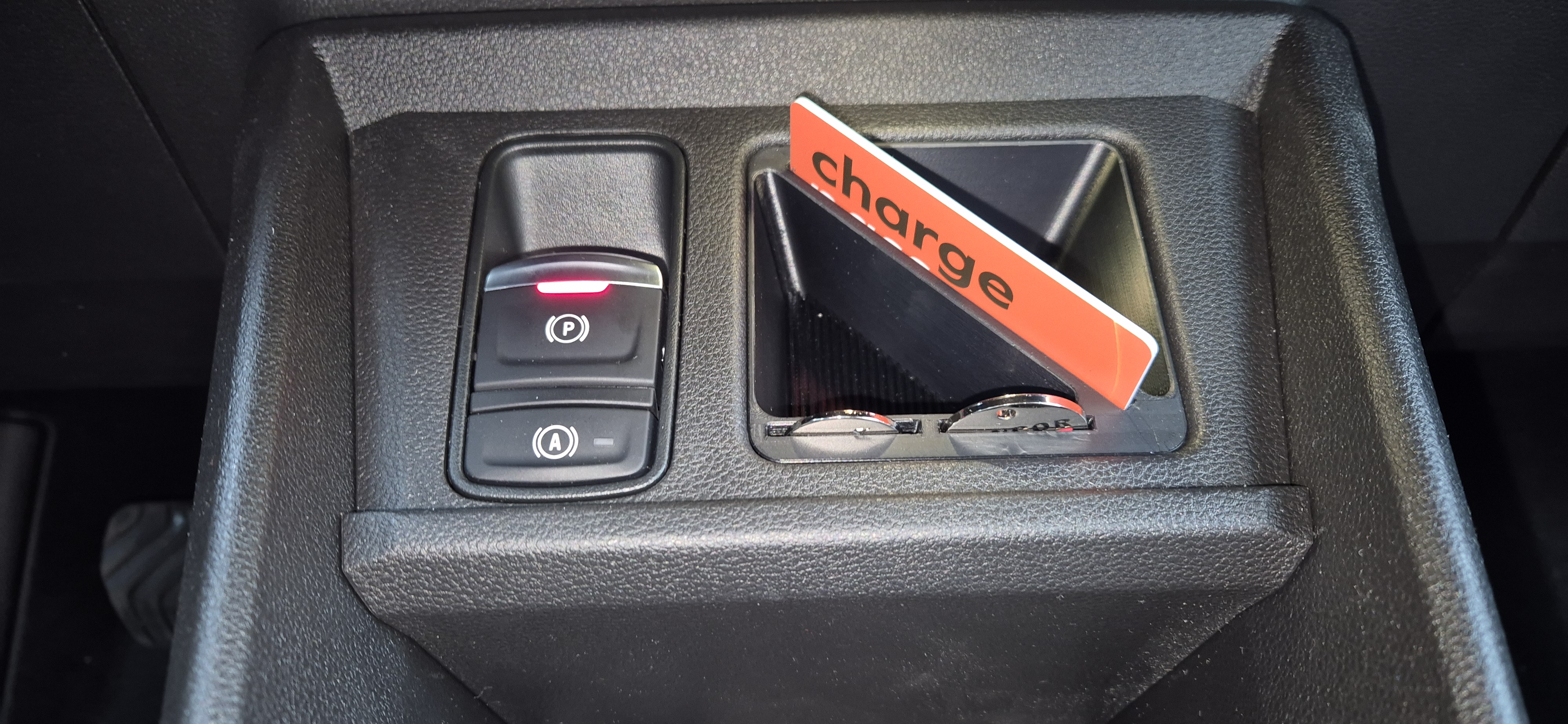Vì chiếc Renault 5 e-tech không có chỗ để thẻ sạc và thẻ đậu xe, tôi đã tạo ra một bộ phận chèn vào hộc nhỏ bên cạnh phanh tay. Ngoài việc chứa được tối đa ba thẻ, nó còn có thể đựng hai đồng xu 2 franc hoặc 2 euro.