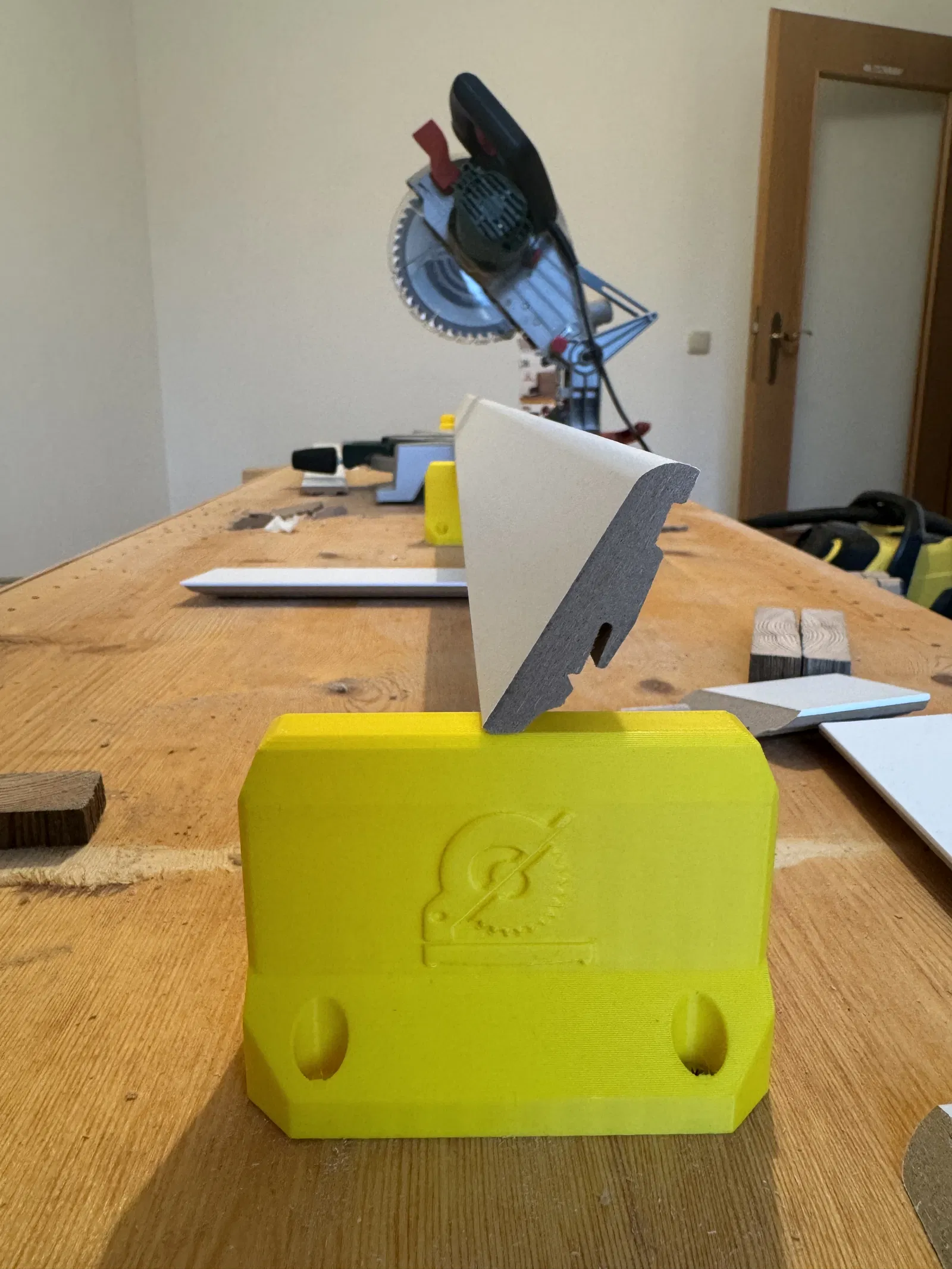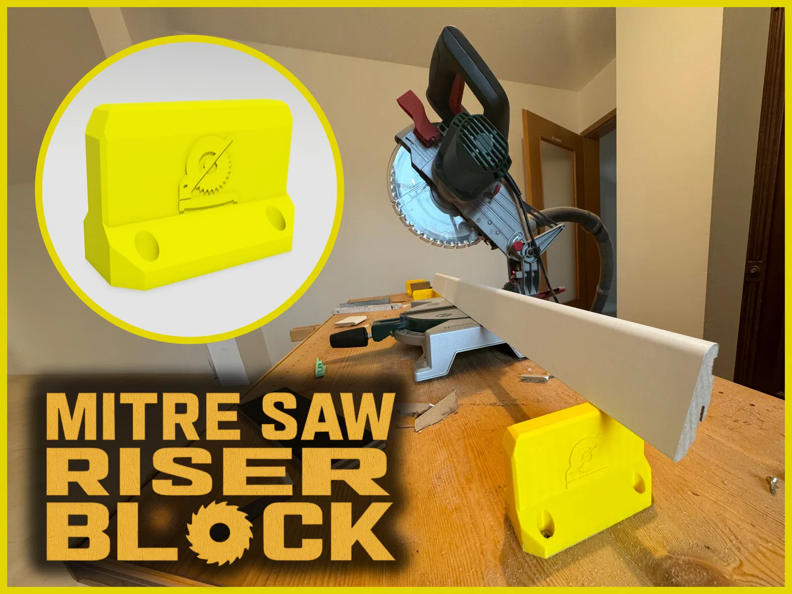 Tui chế cái đế nâng cho máy cưa mitre để chống rớt đồ dài như nẹp chân tường, giúp cắt ngọt hơn. Mô hình cao 70mm, có lỗ bắt vít, in bằng PLA. Có thể điều chỉnh độ cao tùy máy. Rất hữu ích cho công trình và xưởng làm việc.