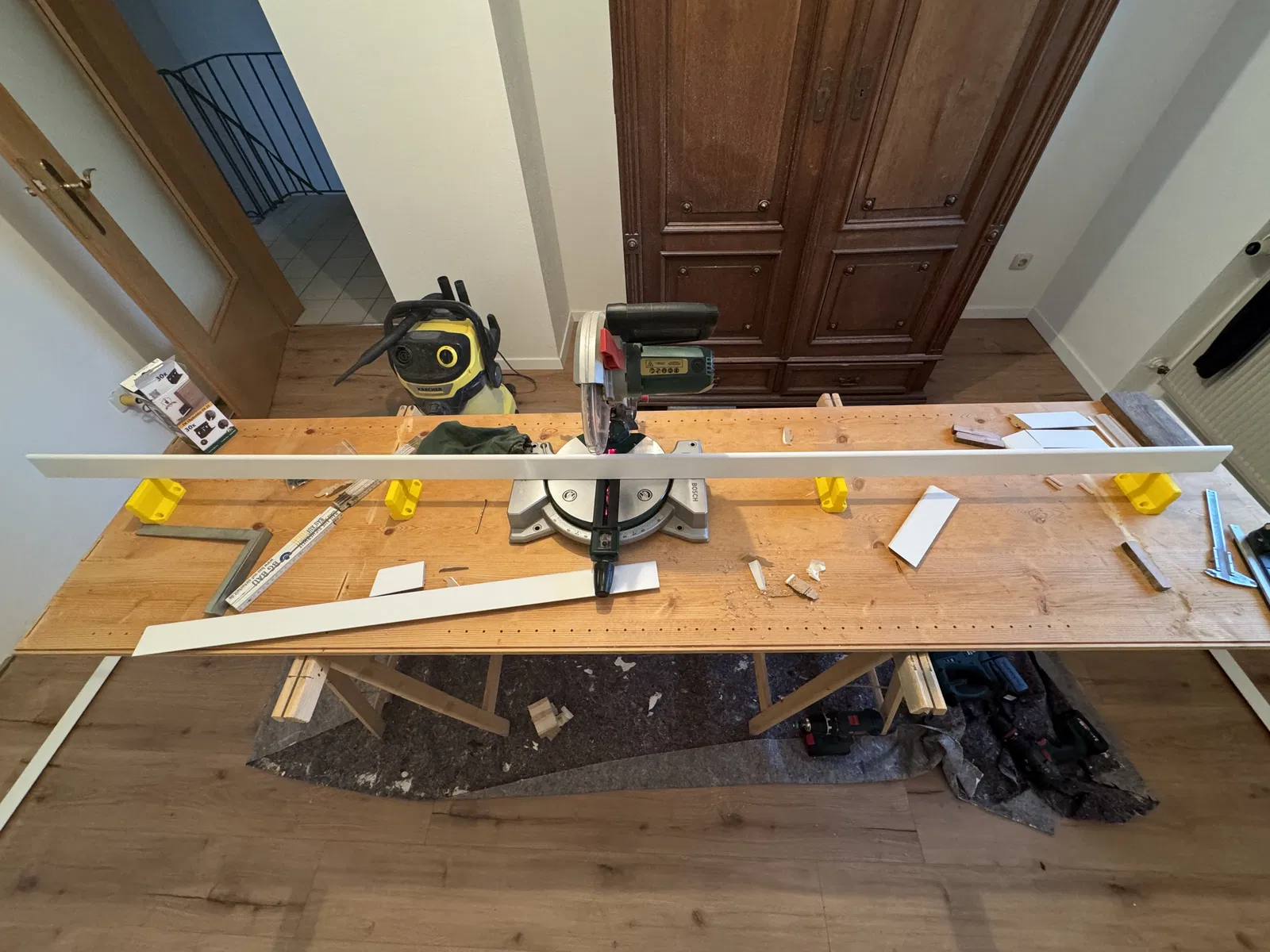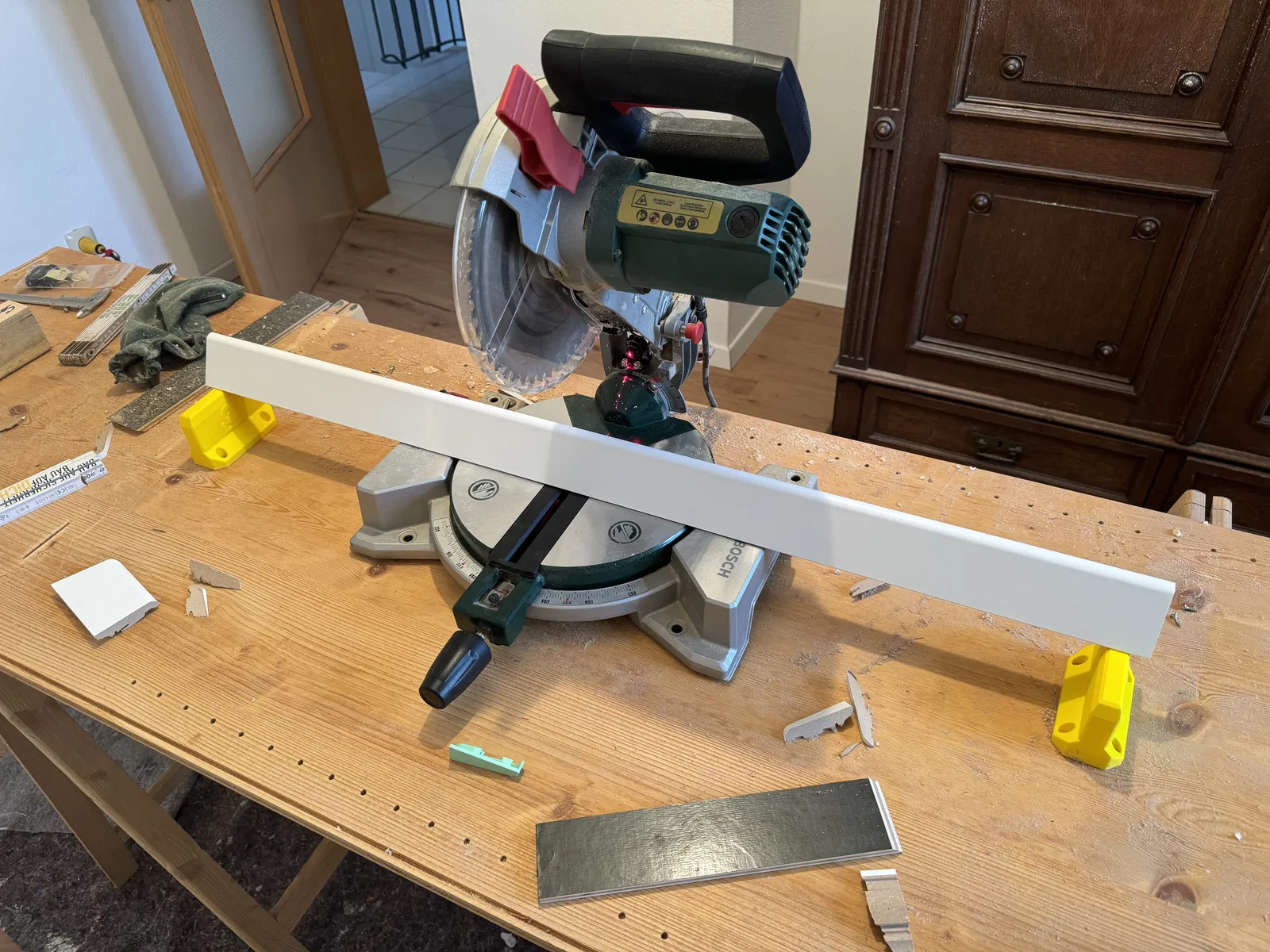 Tui có làm một cái đế nâng cho máy cưa mitre của tui để khỏi bị mấy vật dài như nẹp chân tường bị rớt xuống sau khi cắt hoặc bị nghiêng làm hư mặt cắt. Thông thường mấy loại cưa này có bàn mở rộng hai bên nhưng máy của tui (Bosch PCM 8) thì không có, mà có thì một cái nẹp chân tường dài 2,4 m nó cũng rớt thôi.