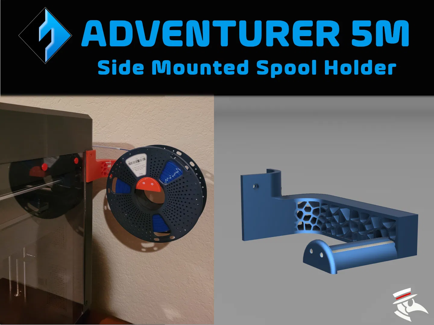 Giá đỡ cuộn chỉ gắn bên hông cho Flashforge Adventurer 5M, được thiết kế với đường đi sợi filament trực tiếp nhất và vẻ ngoài voronoi. Có thể in không cần hỗ trợ, với tùy chọn ống PTFE để giảm ma sát. Bao gồm các gợi ý in ấn và liên kết đến các phụ kiện khác.
