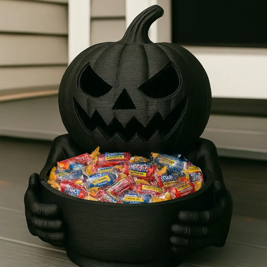 Mùa Halloween này, hãy thu hút mọi ánh nhìn với chiếc bát kẹo màu đen tuyền ấn tượng, được giữ bởi đôi bàn tay xương xẩu và đội trên đầu là quả bí ngô