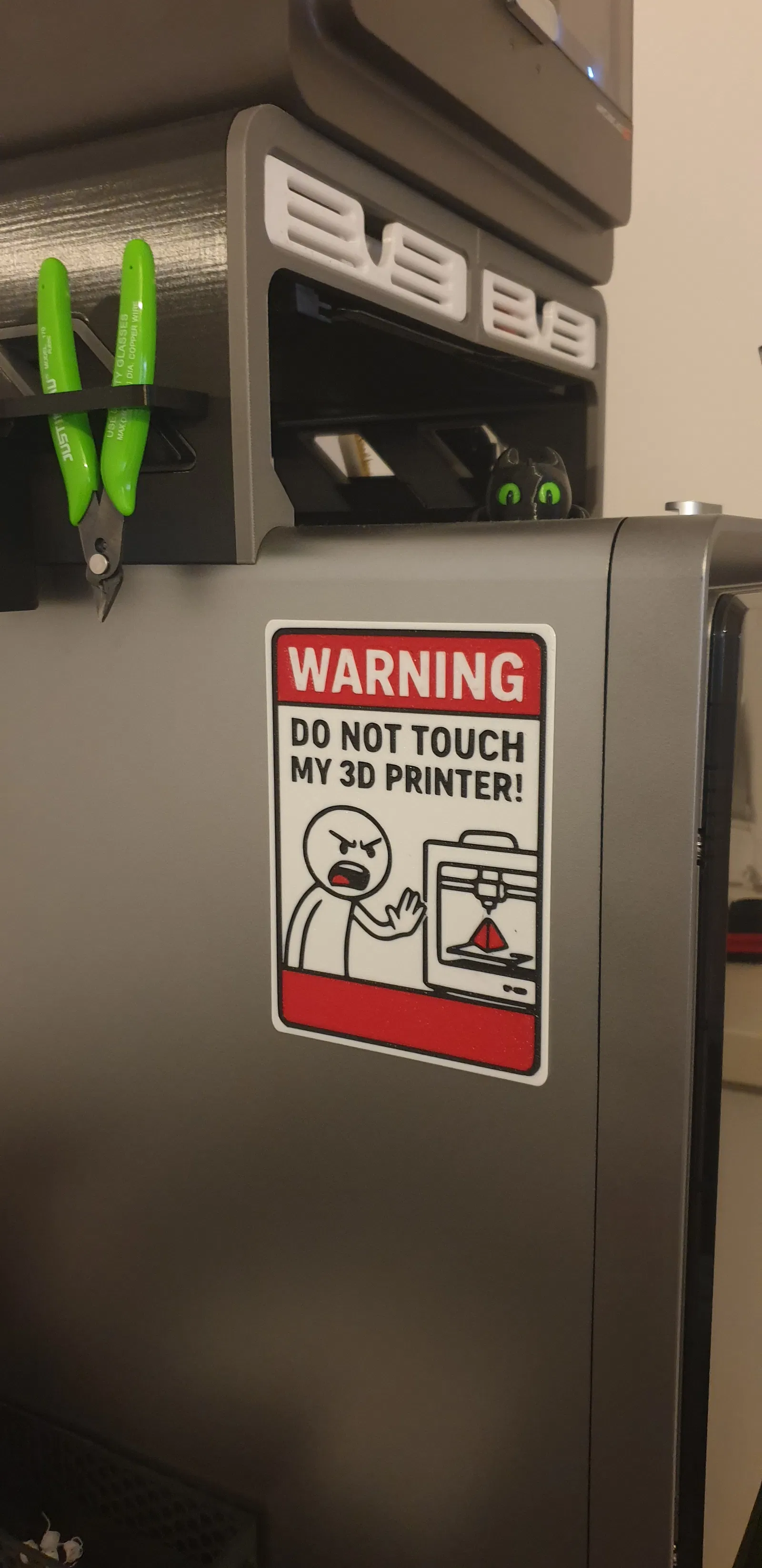 Biển cảnh báo "Đừng đụng vào máy in 3D của tôi" sẵn sàng để in. Hướng dẫn xử lý file 3mf đơn giản, chỉ cần cắt lát và chỉnh dây tóc. Màu sắc đã được gán sẵn, file hoàn chỉnh.