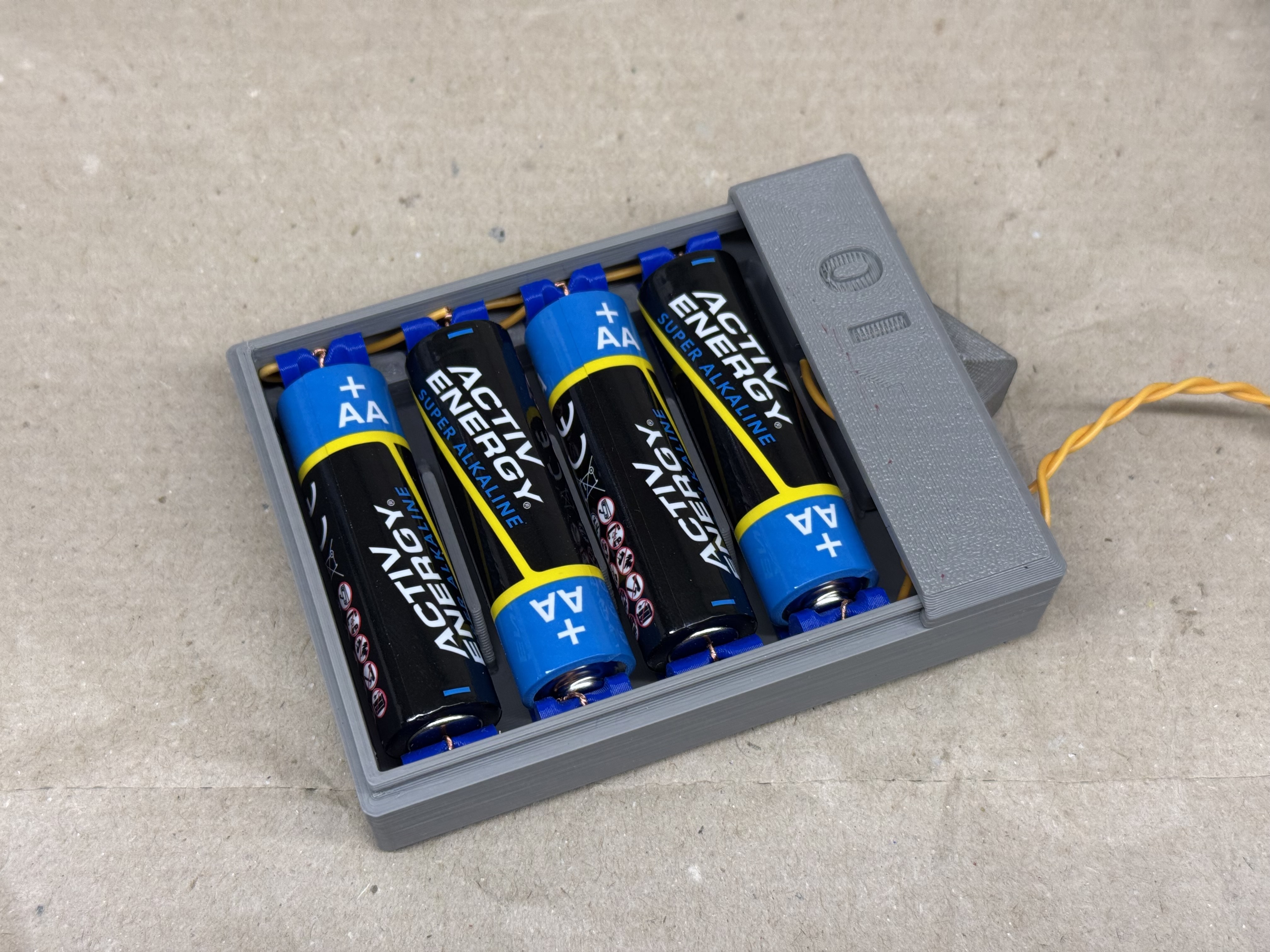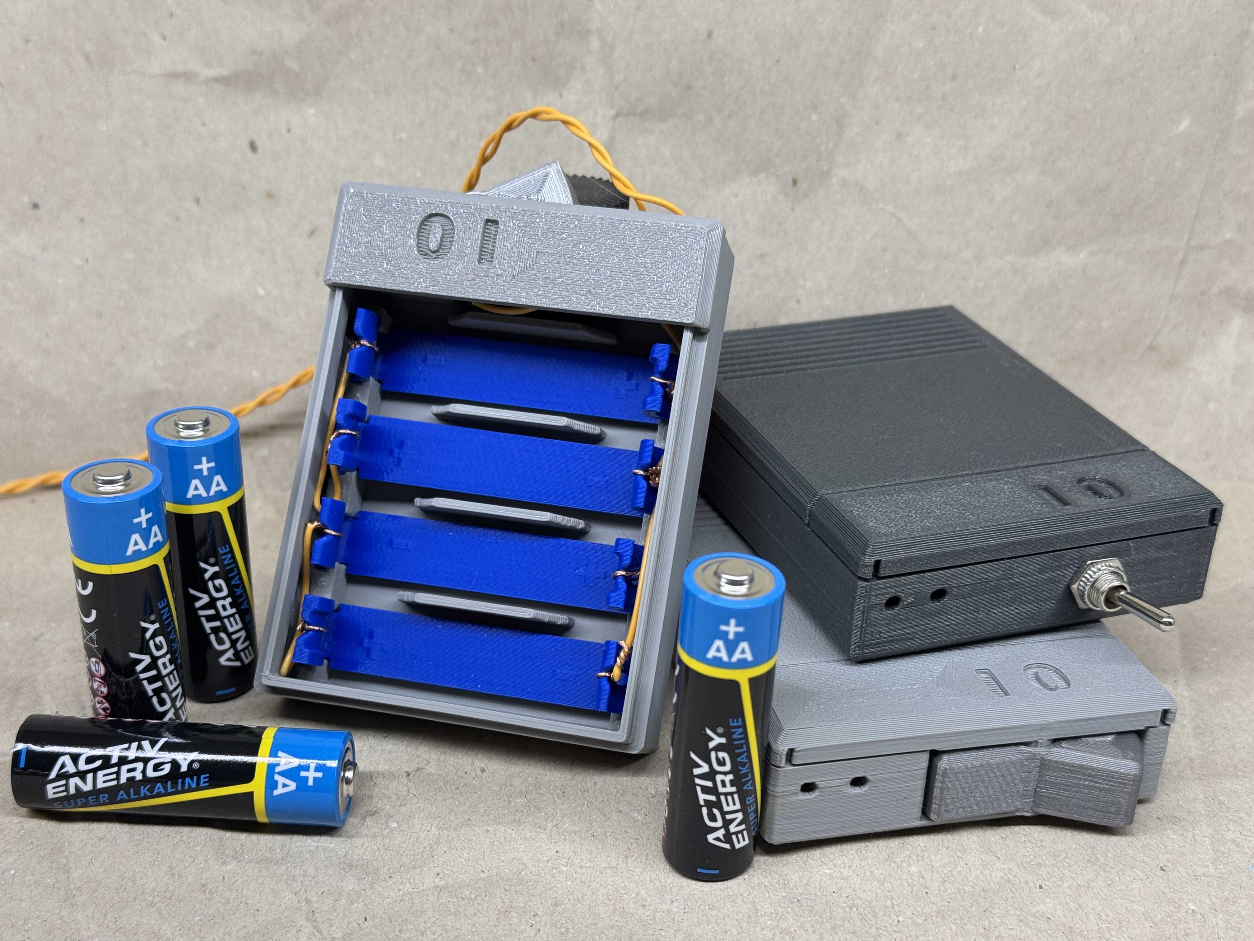 Hộp đựng pin AA hoàn toàn in được, có sẵn phiên bản cho 2, 3 và 4 viên. Không cần thêm phụ kiện. Hướng dẫn in chi tiết, không cần support. Có phiên bản có hoặc không có công tắc, kèm file .step để tùy chỉnh. Phù hợp cho các ứng dụng dòng điện thấp.