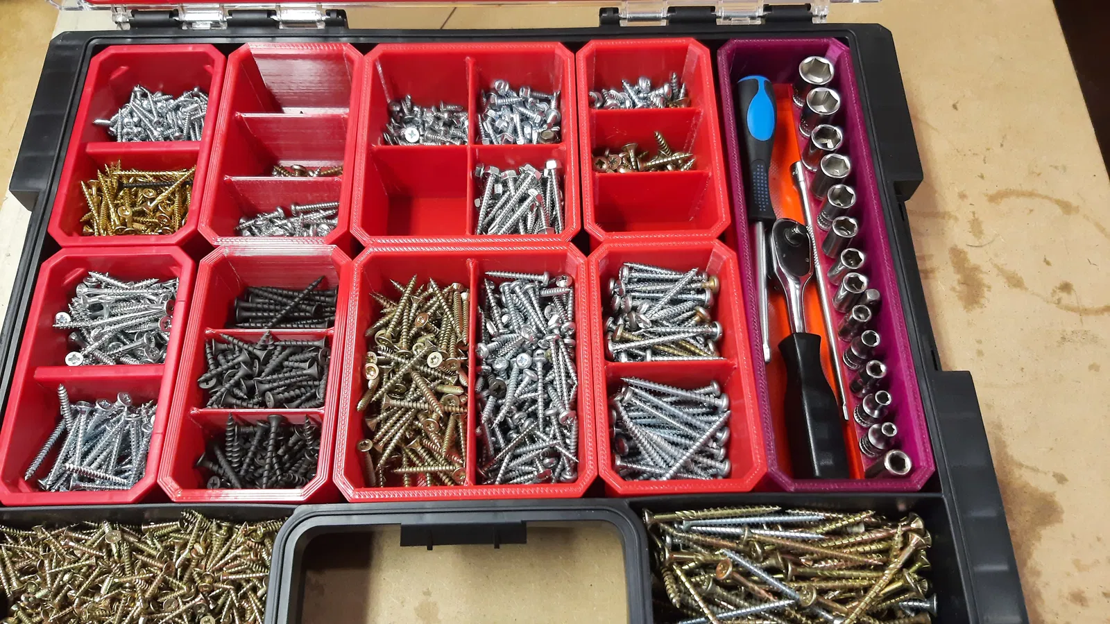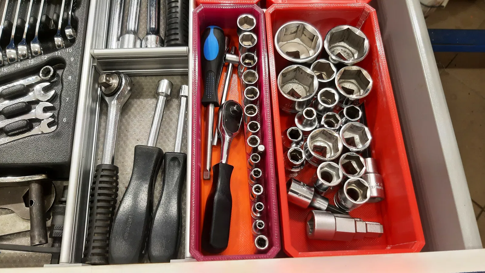 Trong thùng có 13 vị trí cho bộ tuýp drive hoàn chỉnh (từ 4 đến 14) cộng thêm một vị trí cho bộ chuyển đổi sang đầu lục giác ¼". Tất cả các tuýp drive phải có chiều cao tối đa 25mm. Vị trí tuýp drive được thiết kế để giữ cố định bằng nắp organiser.