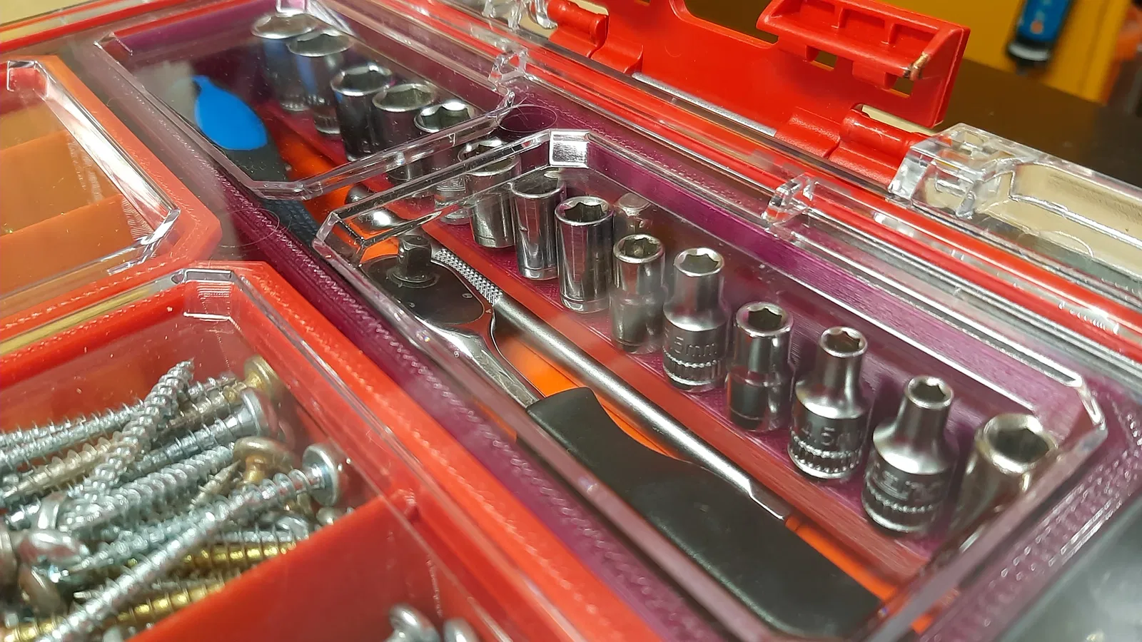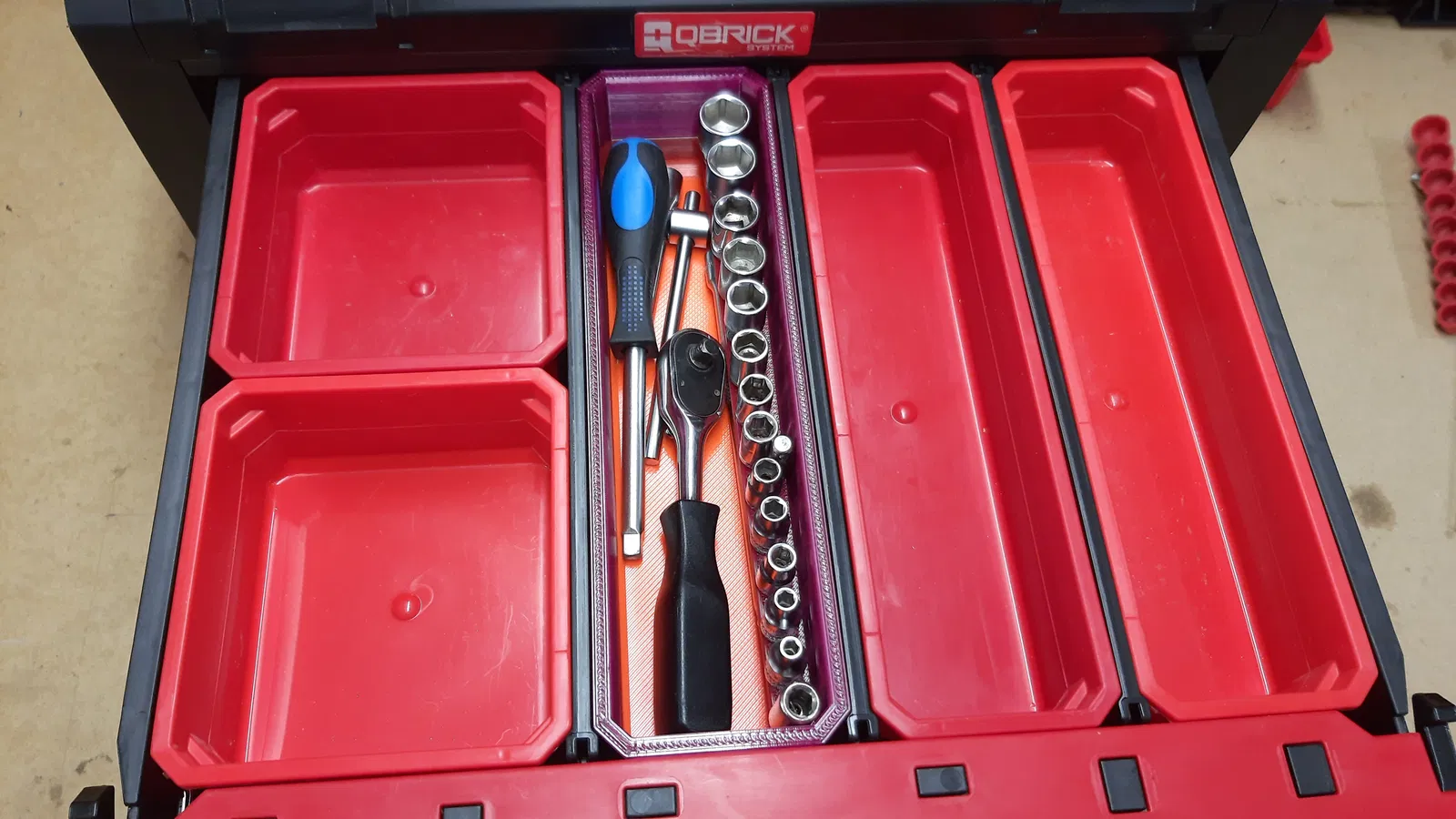 Thùng đựng cho Qbrick One/Pro, có khay tổ chức tuýp drive 1/4" đầu vuông. Bên trong thùng có 13 vị trí cho bộ tuýp drive (từ 4-14) và 1 vị trí cho đầu chuyển ¼" lục giác. Tuýp drive cao tối đa 25mm. Khay giữ tuýp bằng nắp organiser. In bằng PETG cho độ bền cao.