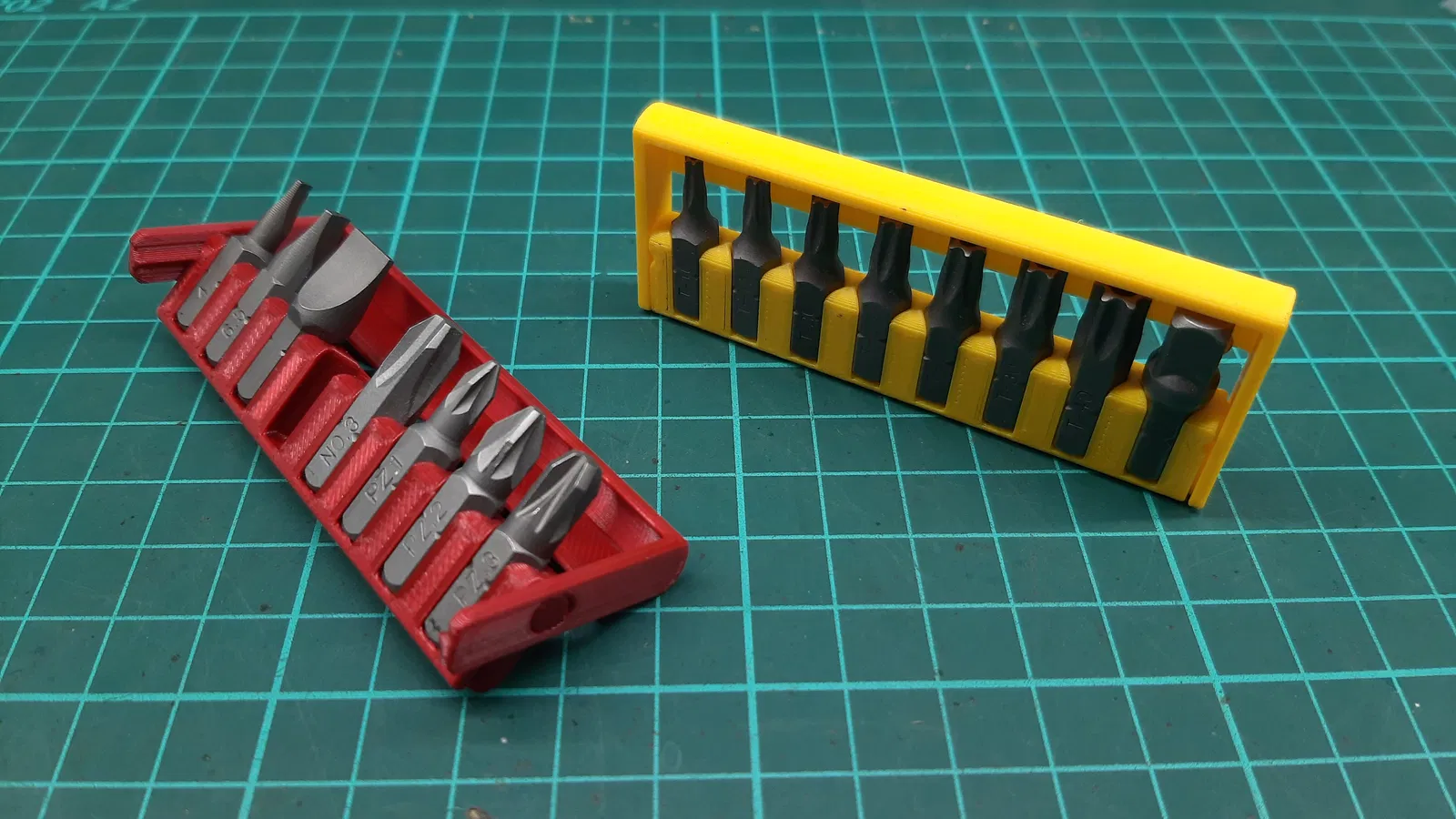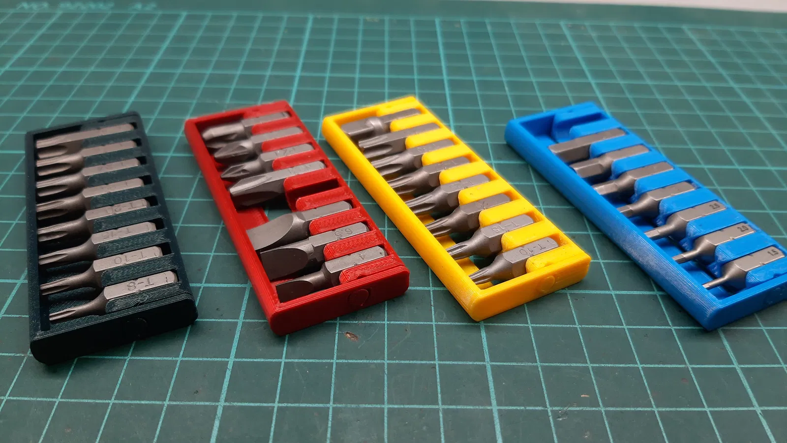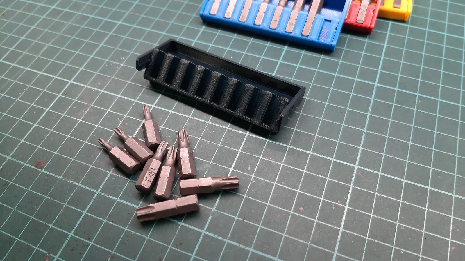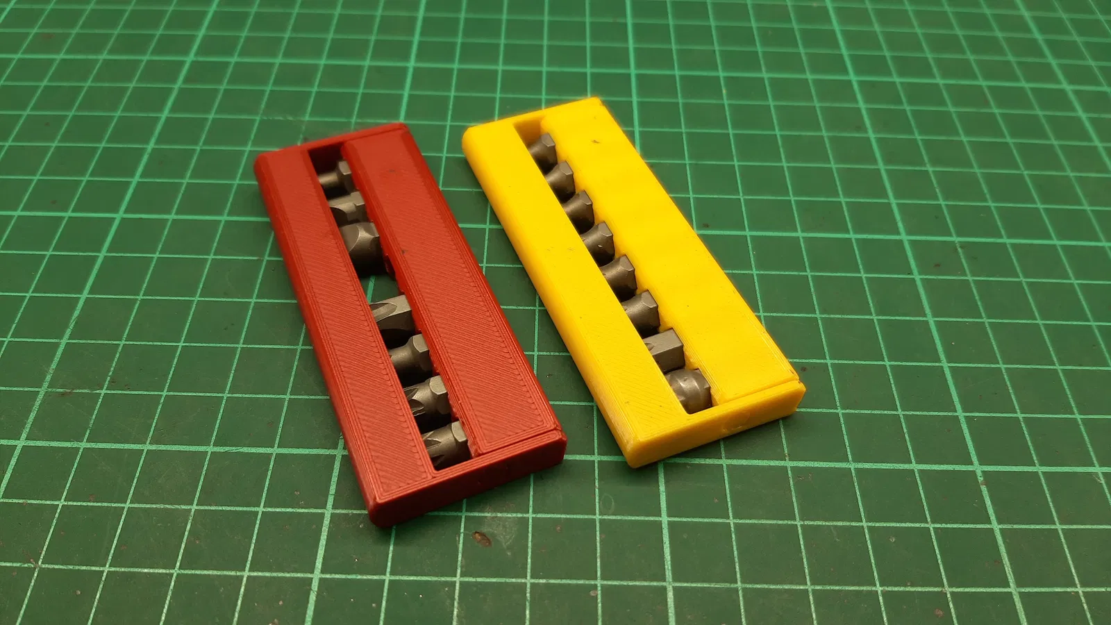 Chỗ giữ mũi khoan lục giác 1/4 inch có chức năng giá đỡ. In từ PLA, lớp dày 0,2mm. Cần bộ phận đùn được cân chỉnh tốt. Khớp nối có thể bị dính sau khi in, cần sửa bằng cách mở đóng nắp lại.