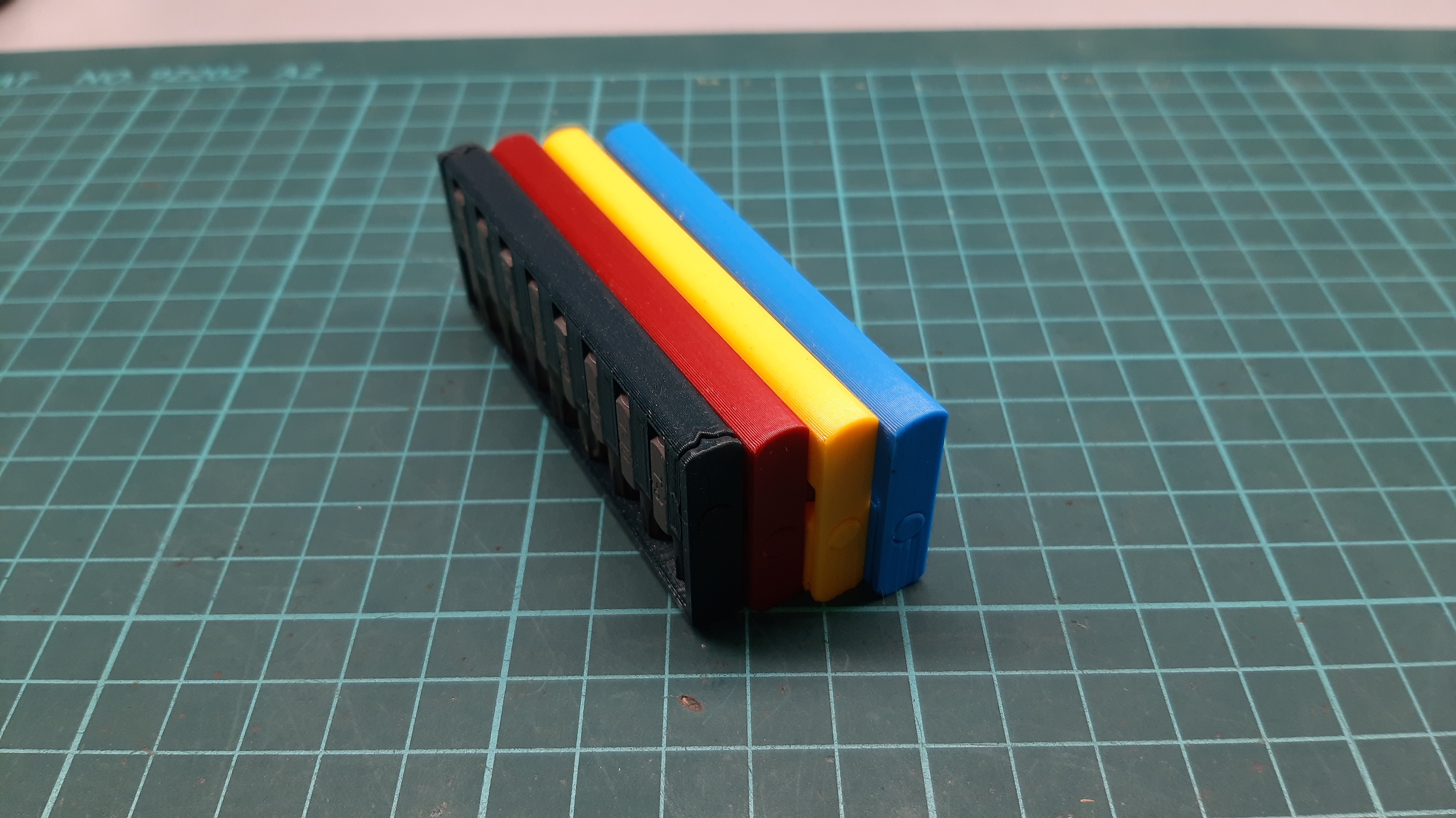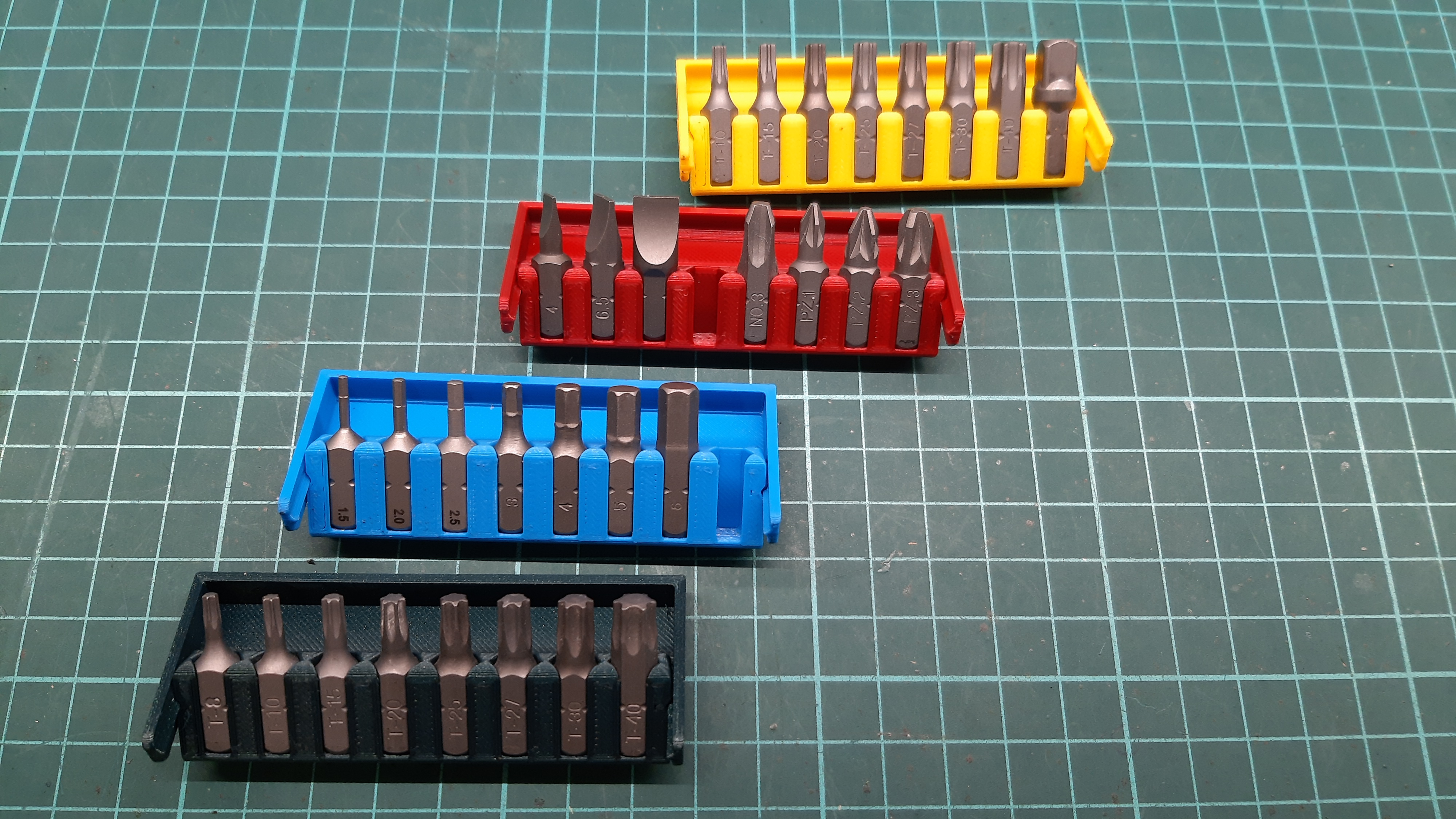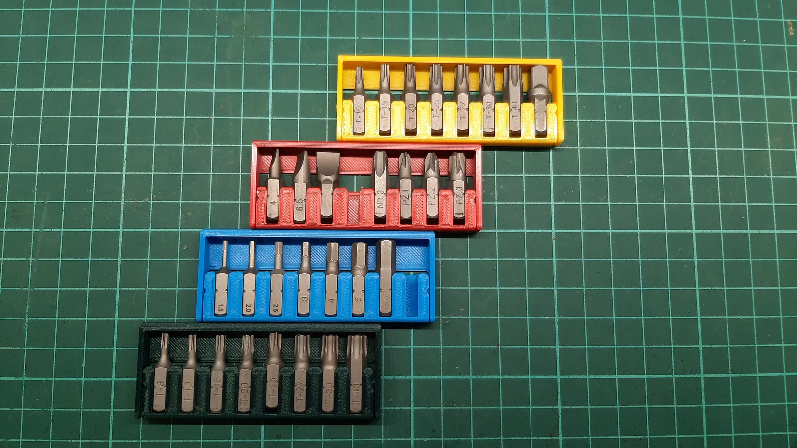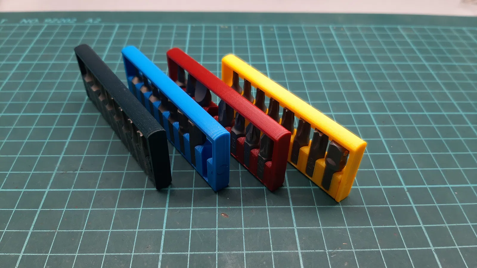 Chỗ giữ mũi khoan lục giác 1/4 inch có chức năng giá đỡ. In từ PLA, lớp dày 0,2mm. Cần bộ phận đùn được cân chỉnh tốt. Khớp nối có thể bị dính sau khi in, cần sửa bằng cách mở đóng nắp lại.