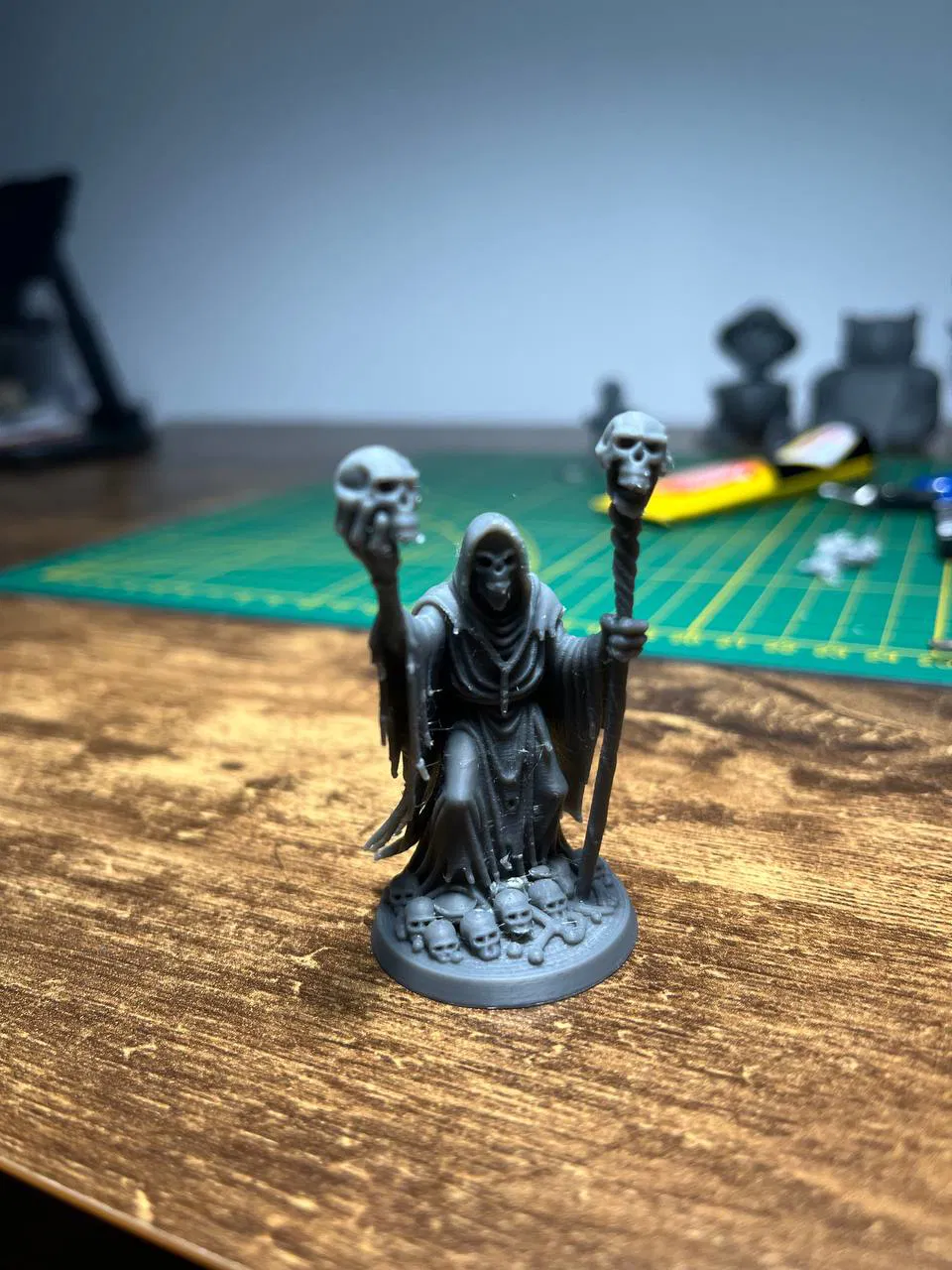 Mô hình miniature phù thủy xương với chi tiết cao, hoàn hảo cho các bàn game, trang trí bàn làm việc hoặc làm vật phẩm sưu tập fantasy. Phù hợp cho người yêu thích boardgame, anime, manga và thế giới giả tưởng.