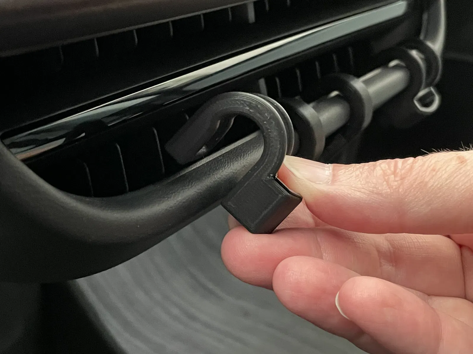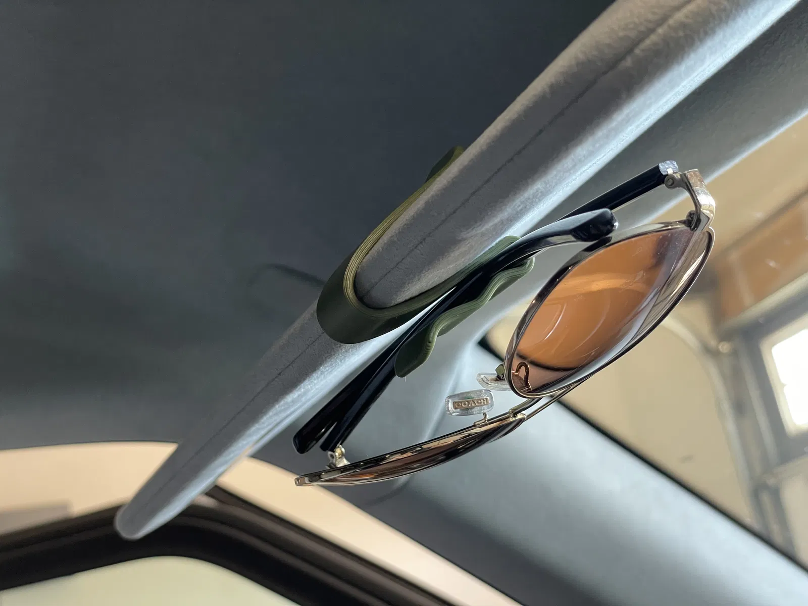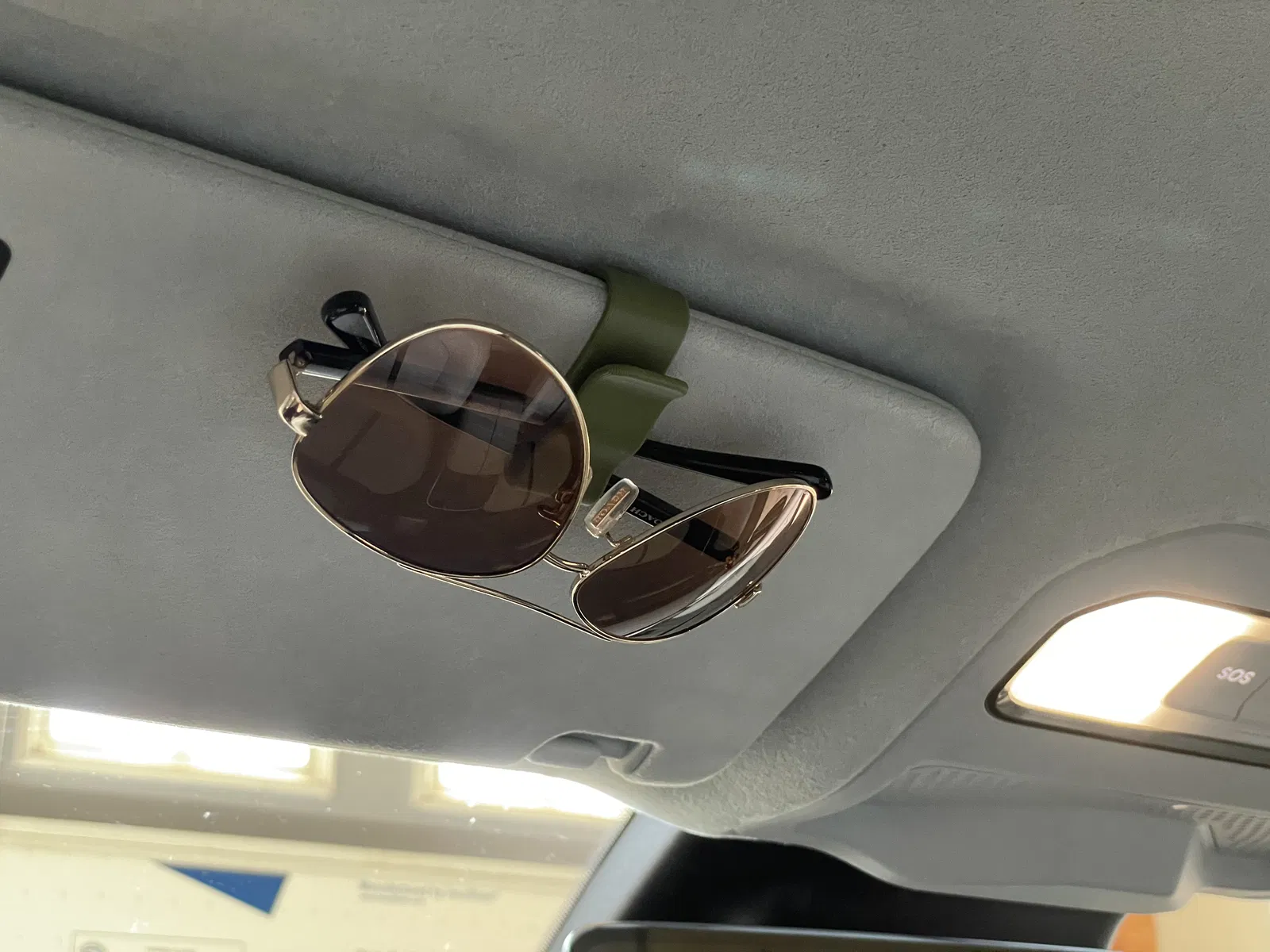 Móc này khá chắc chắn để bạn có thể rút kính râm ra mà hy vọng móc không bị rơi ra. Rivian làm mọi thứ không dễ dàng ở đây. Tôi thấy rằng nếu bạn trượt móc về phía cạnh nơi gió bắt đầu cong, nó sẽ giữ chặt hơn.
