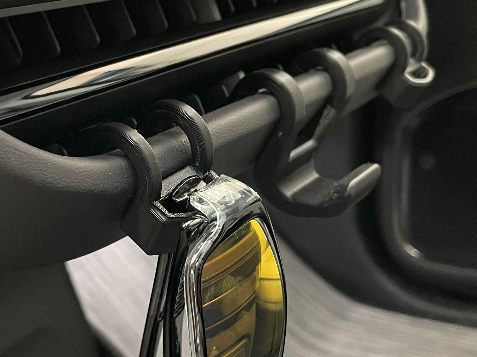 Sau khi chỉnh sửa , tôi nghĩ rằng chúng ta nên có một chỗ để treo kính râm. Tôi đã cố gắng tìm cách tích hợp nó vào móc đựng chai nước, nhưng không có cách nào thực sự không cản trở móc đựng chai nước, vì vậy tôi quyết định chỉ làm móc chuyên dụng này.