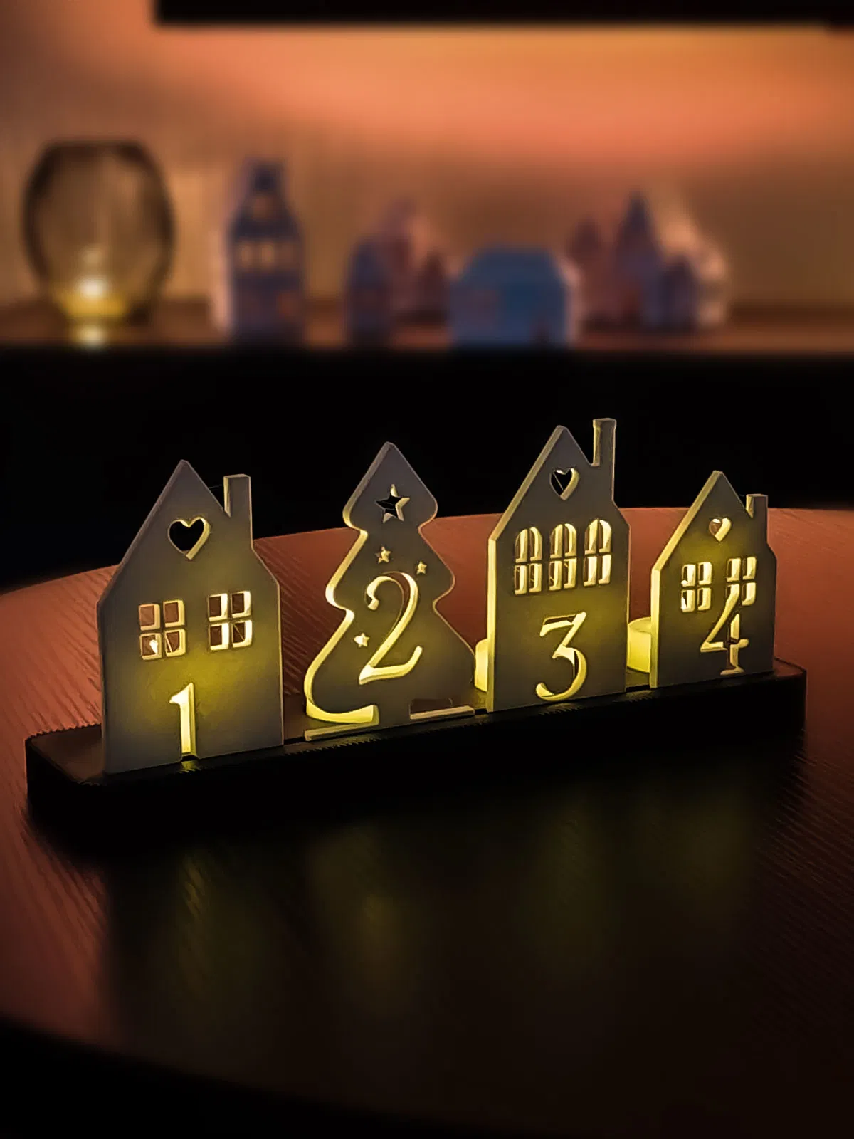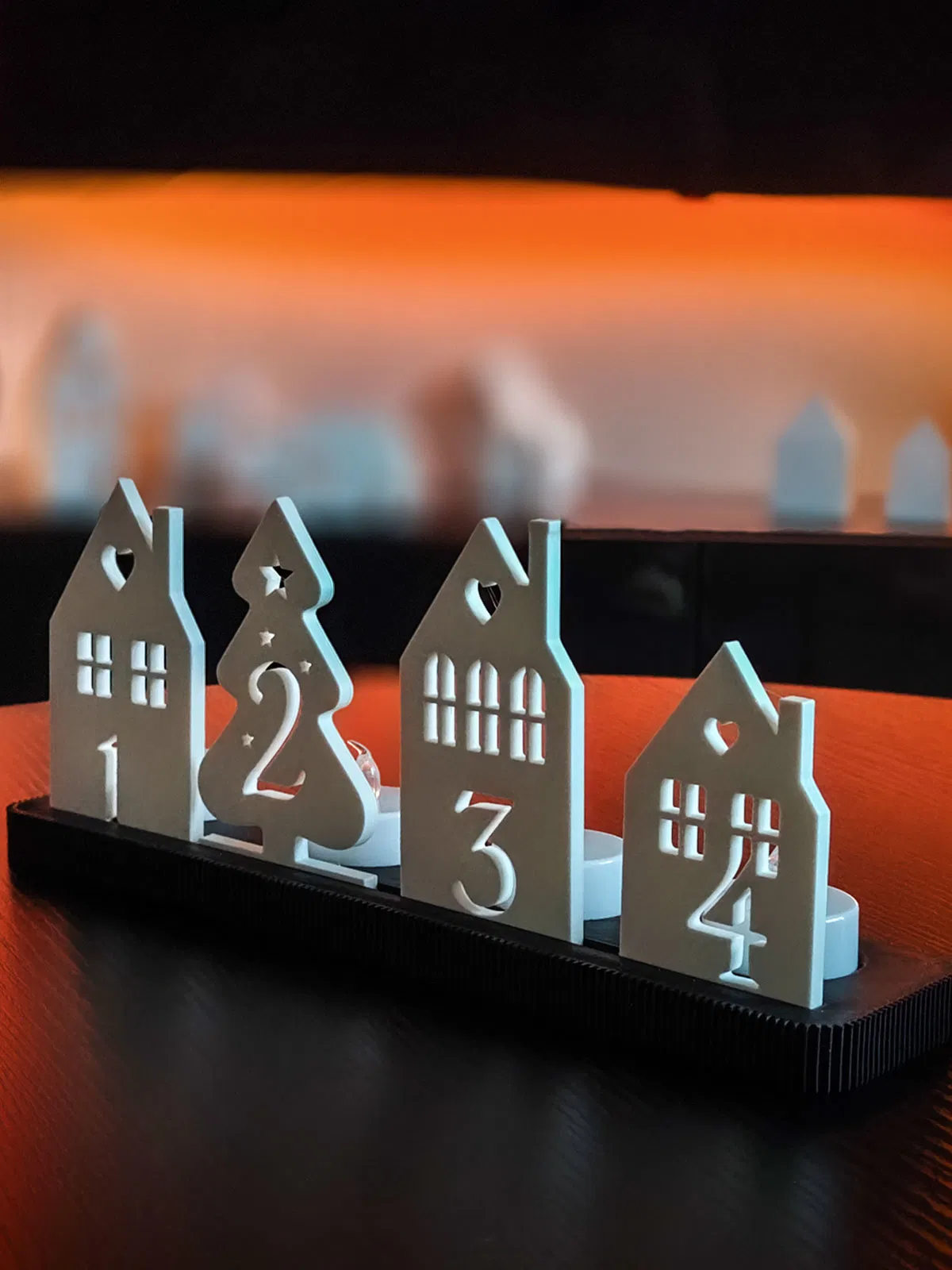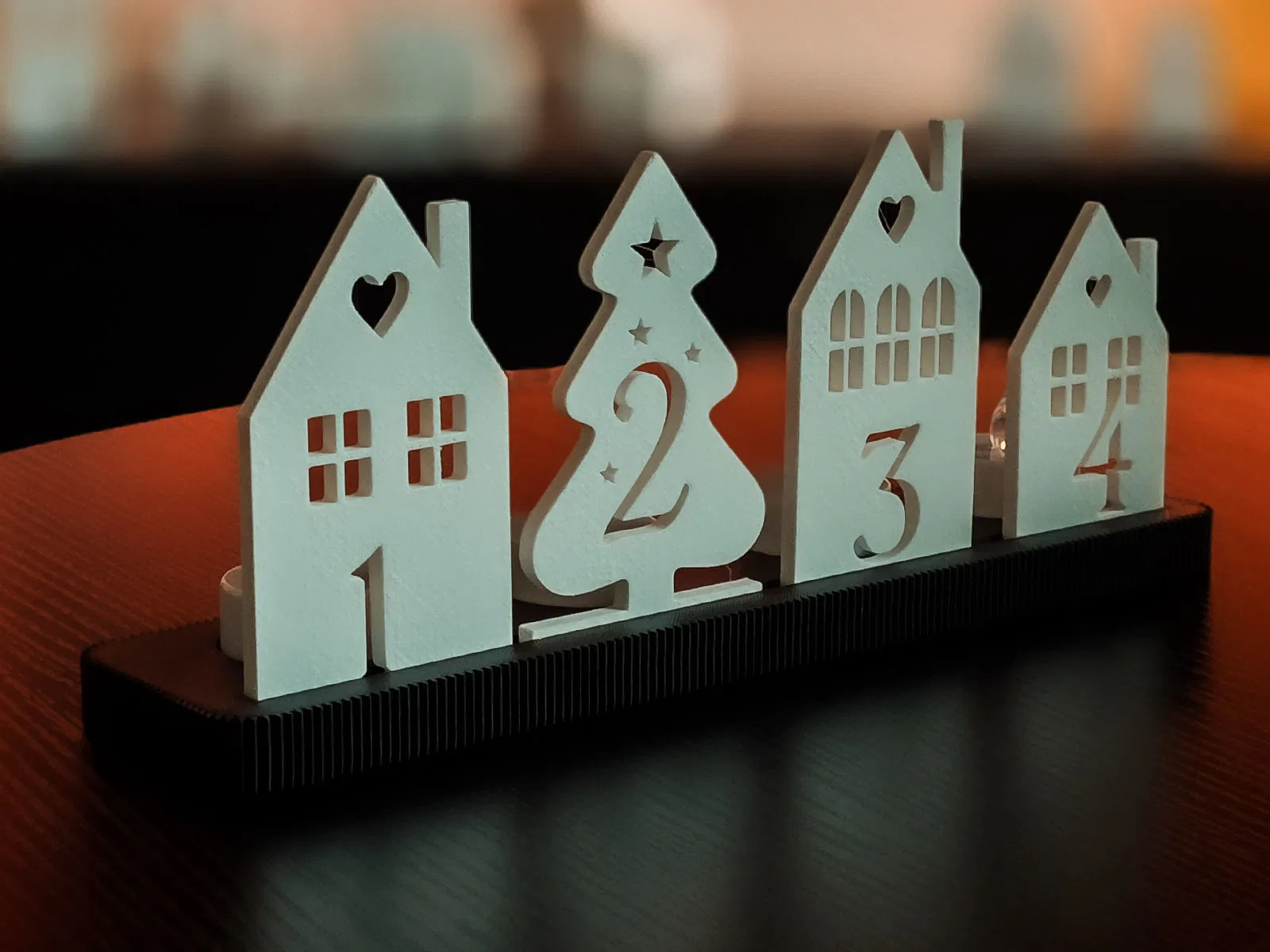 Dự án này bao gồm một đế và bốn yếu tố cắm trang trí (1–4) với hình dạng ngôi nhà và cây thông. Rất lý tưởng cho nến LED – tạo ra một bầu không khí ấm áp mà không cần lửa thật.