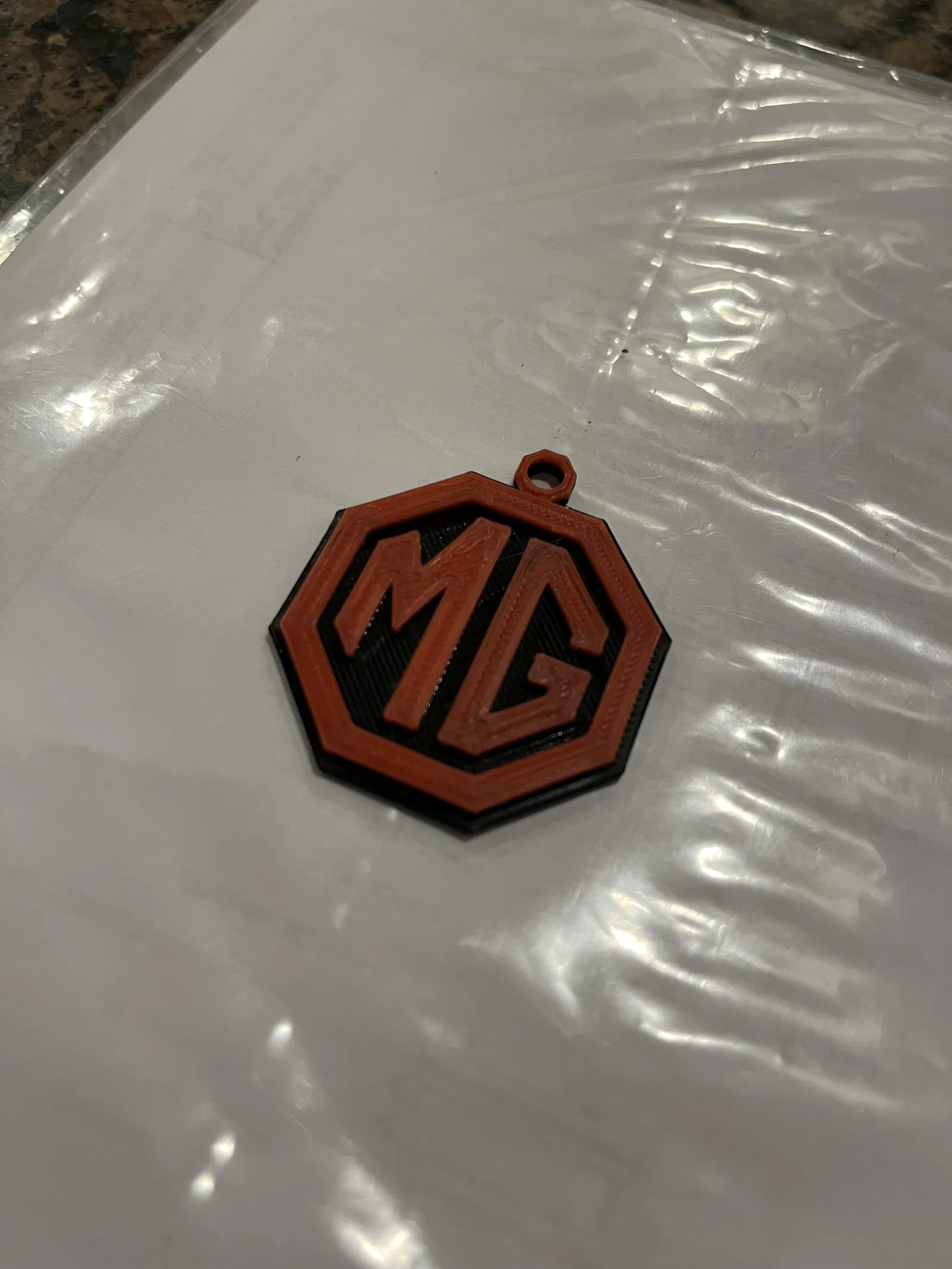 Một chiếc móc khóa đơn giản mang logo MG hình bát giác, bạn cũng có thể dùng làm đồ trang trí cây thông Noel. Có thêm phiên bản in phẳng cho phương pháp 2 màu, 1 máy đùn.