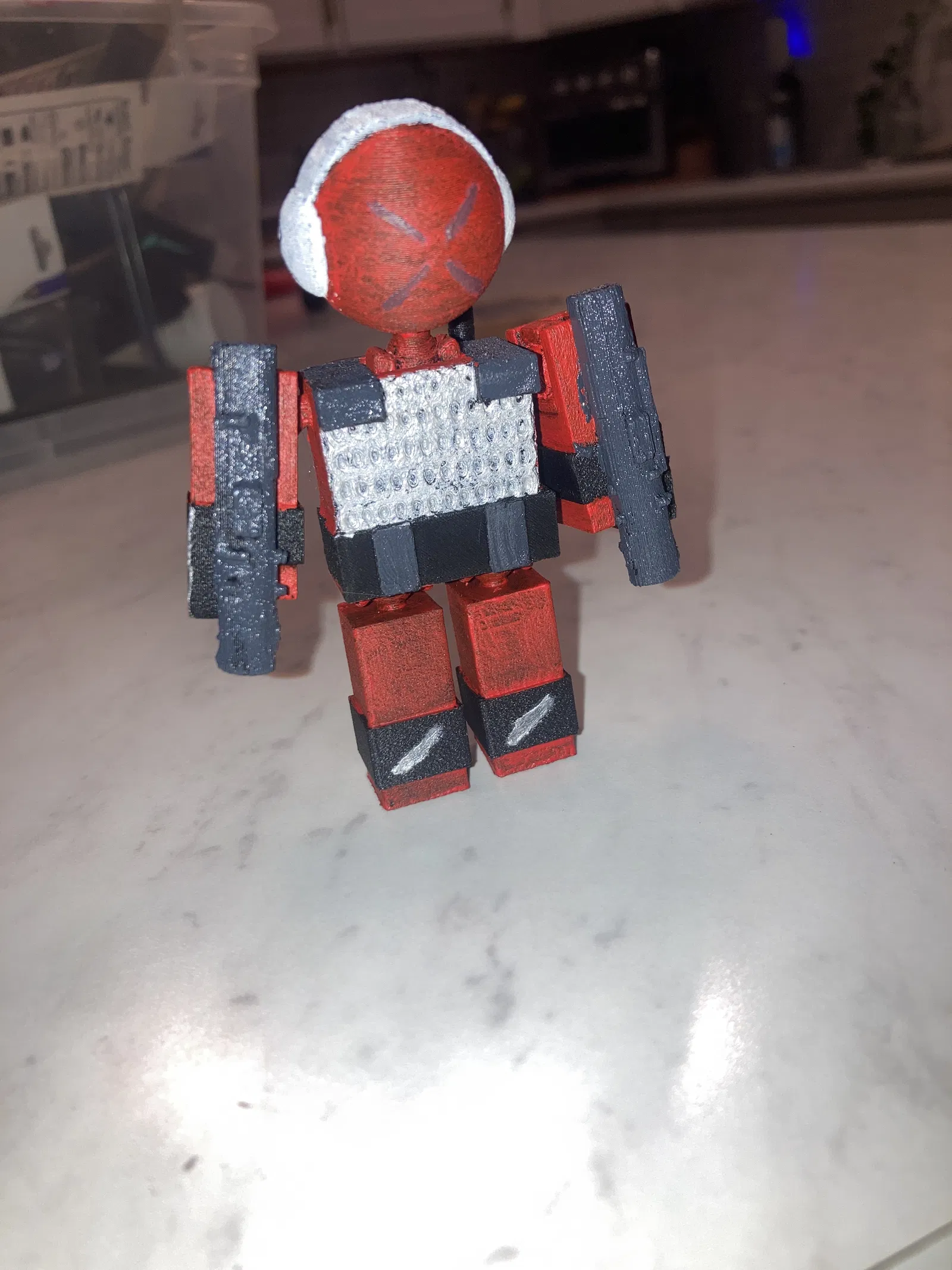 Đây là killdroid, một con robot có gắn súng phóng tên lửa ở hai tay. Mẫu này in bằng nhựa PETG là tốt nhất để khớp không bị lỏng theo thời gian. Tôi cũng không khuyên bạn nên thu nhỏ nó xuống dưới 80% kích thước ban đầu, vì một số bộ phận có thể trở nên mỏng manh và dễ gãy. Tôi đã sơn mẫu này và các bạn cũng có thể sơn nếu muốn. Vui lòng tải lên các bản in của bạn, tôi rất muốn xem các bạn làm gì với chú ta!! (À, nhân tiện thì cái ba lô phản lực không có bộ phận gắn kết thực tế nào nên tôi chỉ dùng keo nến dán nó vào lưng killdroid thôi.)
