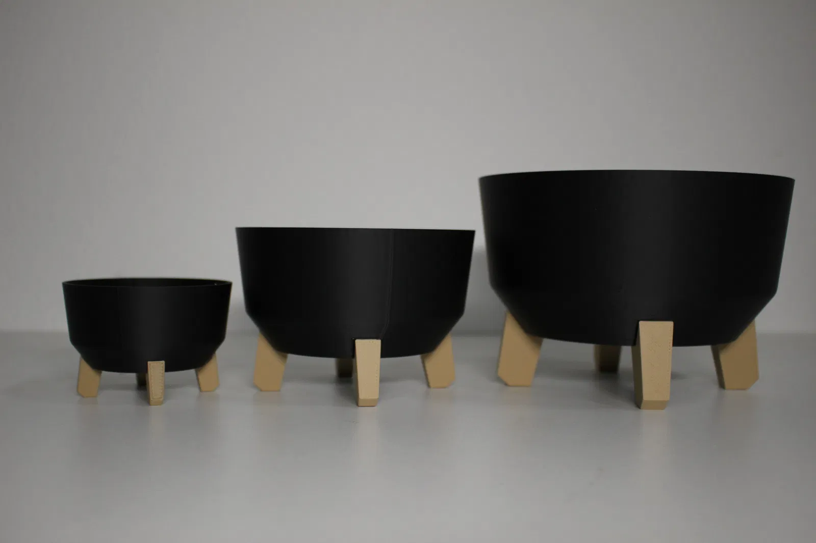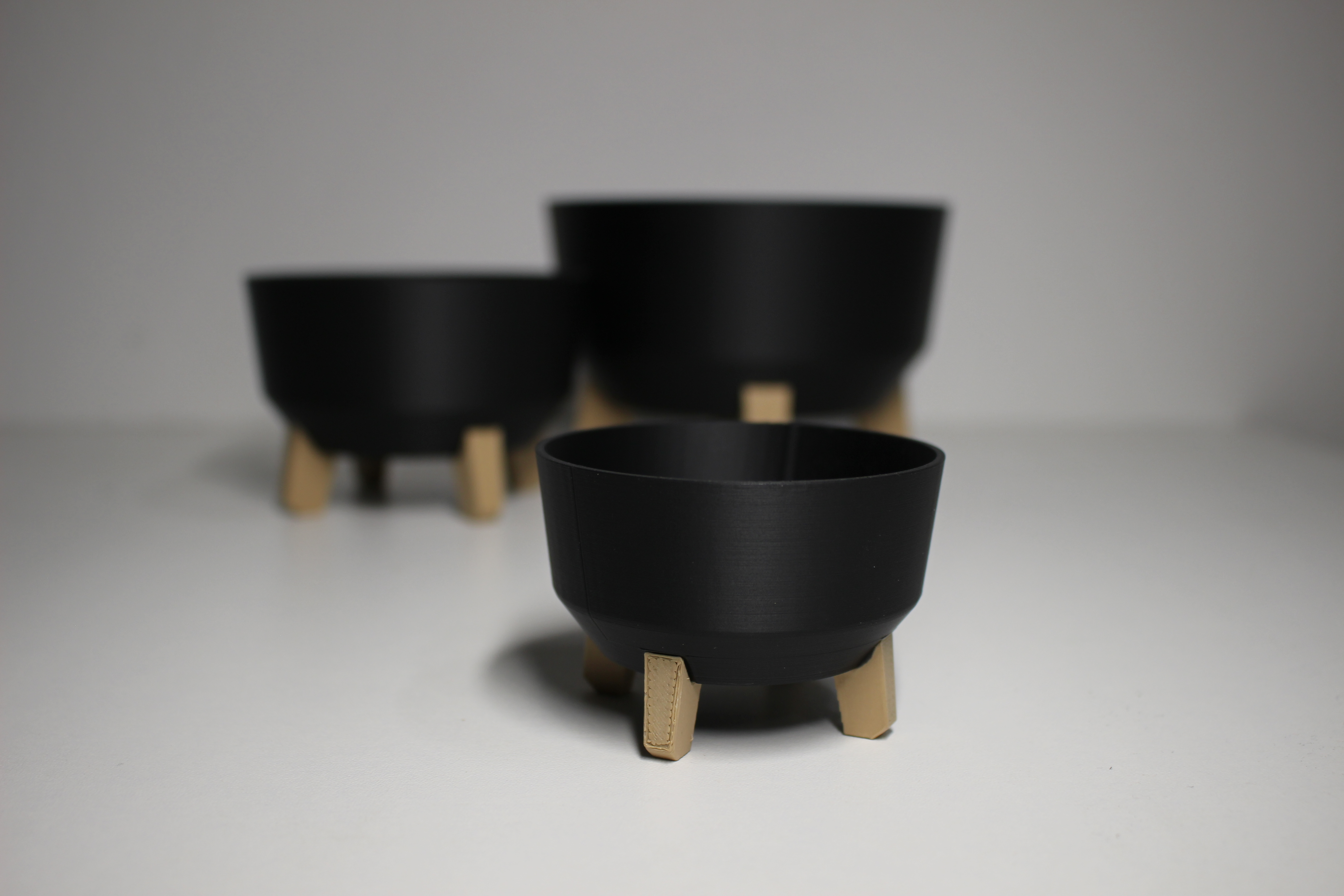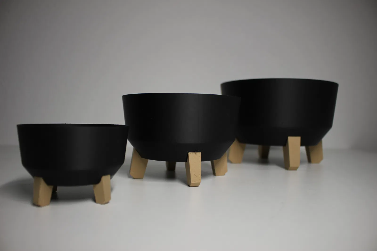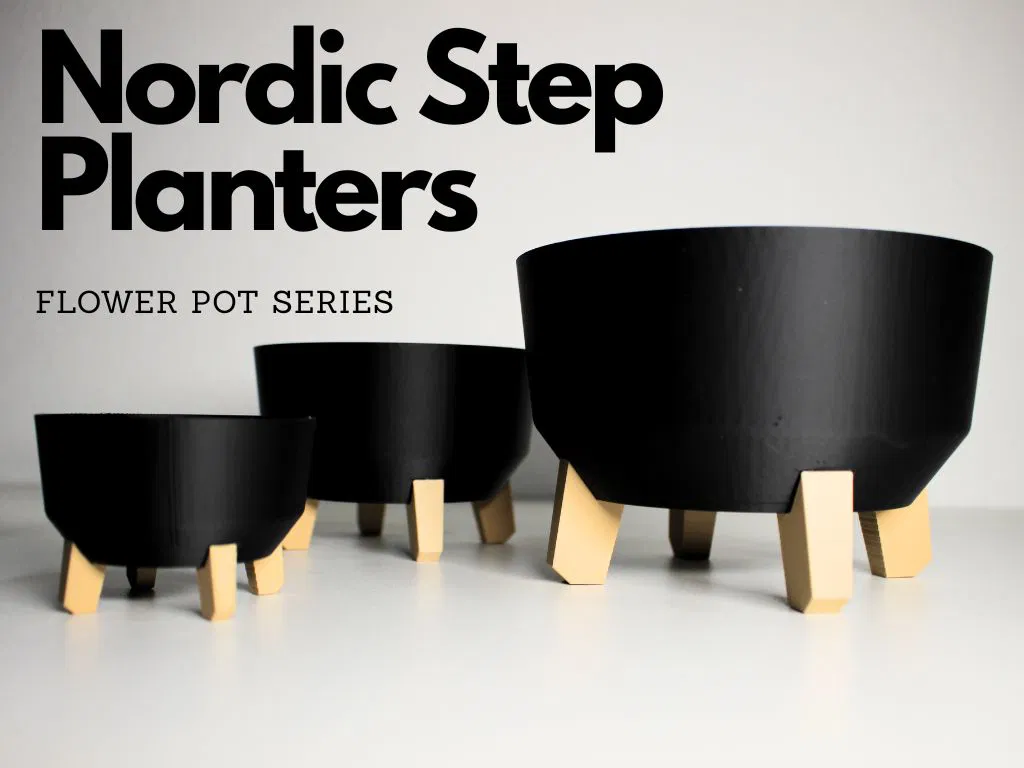 Giới thiệu bộ chậu hoa Nordic Step Planters, dòng chậu in 3D hiện đại với thiết kế Bắc Âu tối giản, sang trọng. Chậu màu đen mờ, chân giả gỗ, có 3 kích cỡ, phù hợp trồng sen đá, rau thơm, cây nhỏ. In 3D không cần supports.