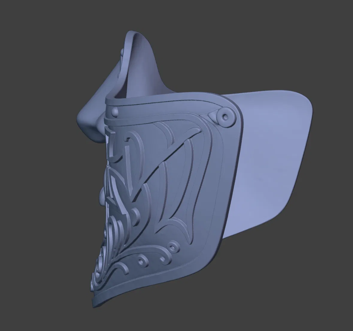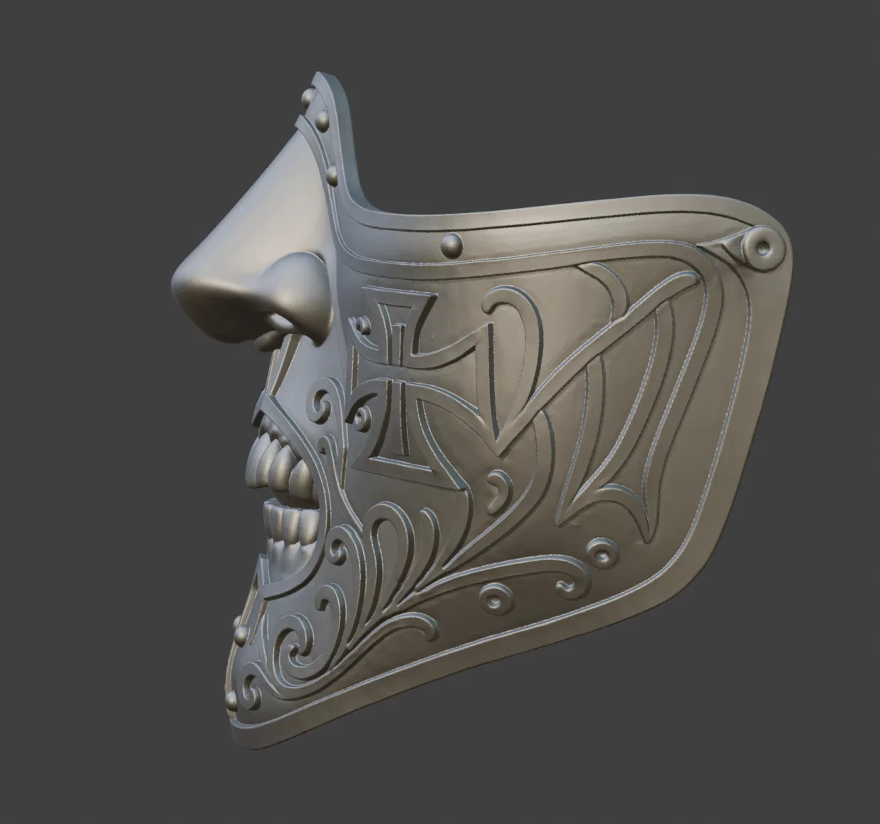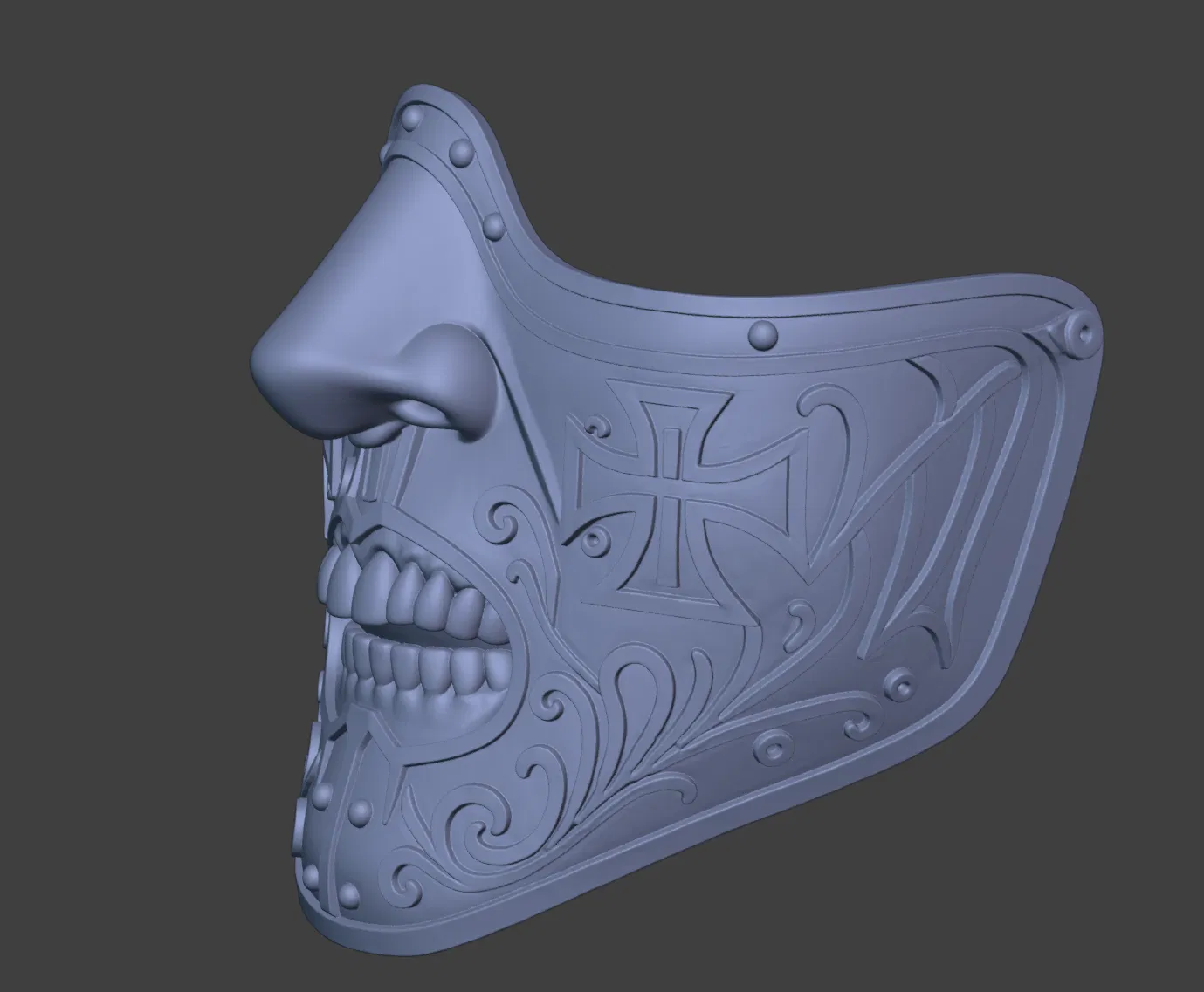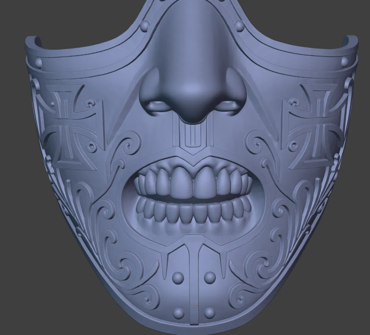 Cái mặt nạ này lấy cảm hứng từ Grimaldus, nhìn nó cầu kỳ và chi tiết lắm, có mấy hoa văn Gothic với mấy cái khắc chạm tinh xảo nữa. Thiết kế bằng Blender với ZBrush, cái mặt nạ này vừa mang nét tàn bạo thời trung cổ, vừa có nét nghệ thuật thanh lịch, đúng là một món đồ cosplay ấn tượng.