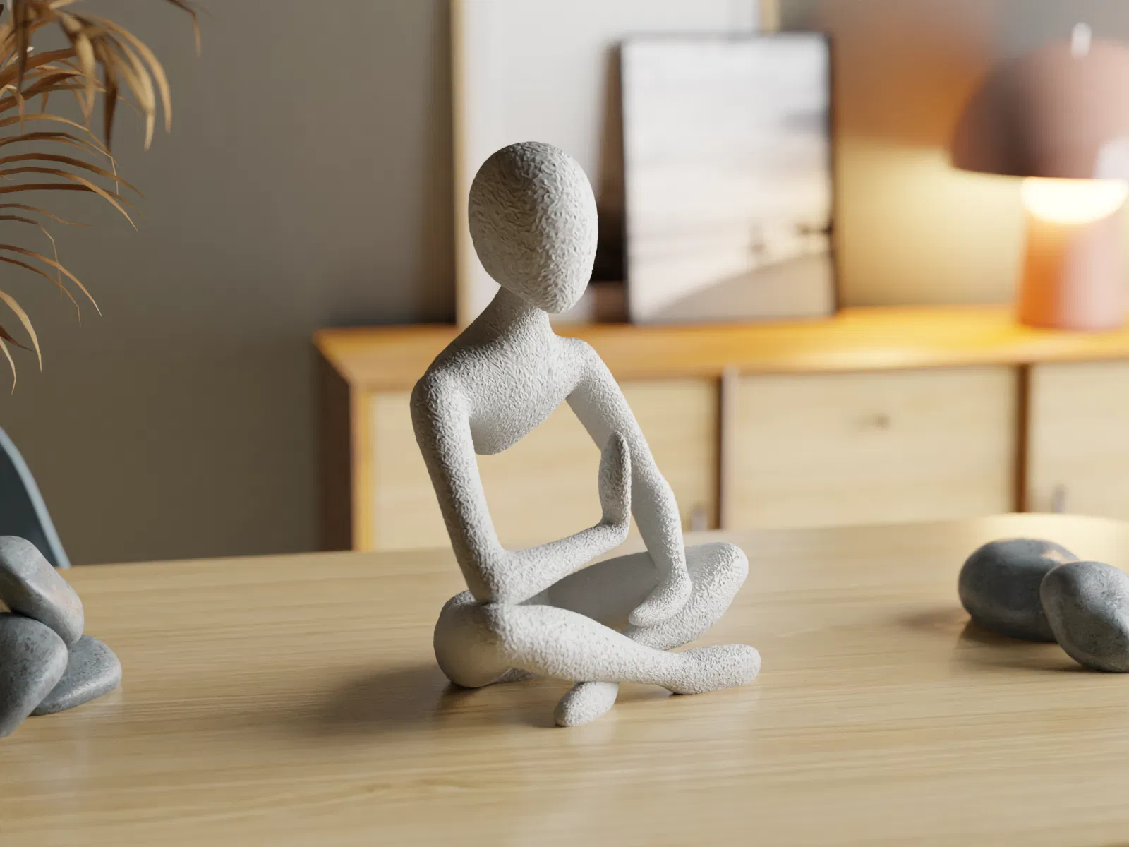 Mô hình người đang lơ lửng, được thiết kế để thể hiện sự tĩnh lặng và cân bằng yên tĩnh. Hình dáng được tối giản hóa với những đường nét gọn gàng và tư thế thiền định nhẹ nhàng, tạo ảo giác như đang trôi nổi giữa không trung. Nó hoạt động như một vật thể chiêm nghiệm, một bản in kỹ thuật và một tác phẩm điêu khắc tối giản, tương tác với ánh sáng, bóng tối và không gian trống.