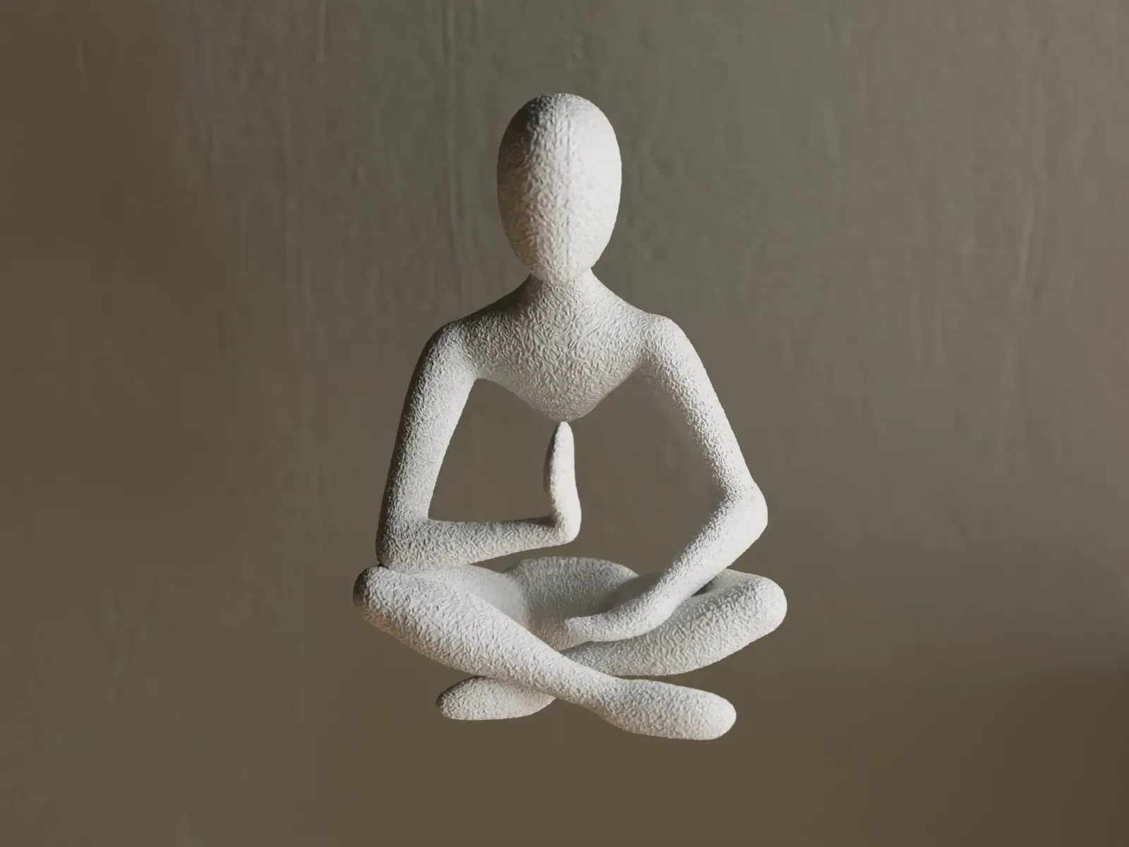Một tác phẩm điêu khắc 3D tối giản mô tả một hình người đang thiền định giữa không trung, thể hiện sự tĩnh lặng và cân bằng. Thiết kế này với những đường nét gọn gàng, tư thế thiền định nhẹ nhàng và khả năng tương tác với ánh sáng, bóng tối, không gian trống, mang lại cảm giác yên bình.