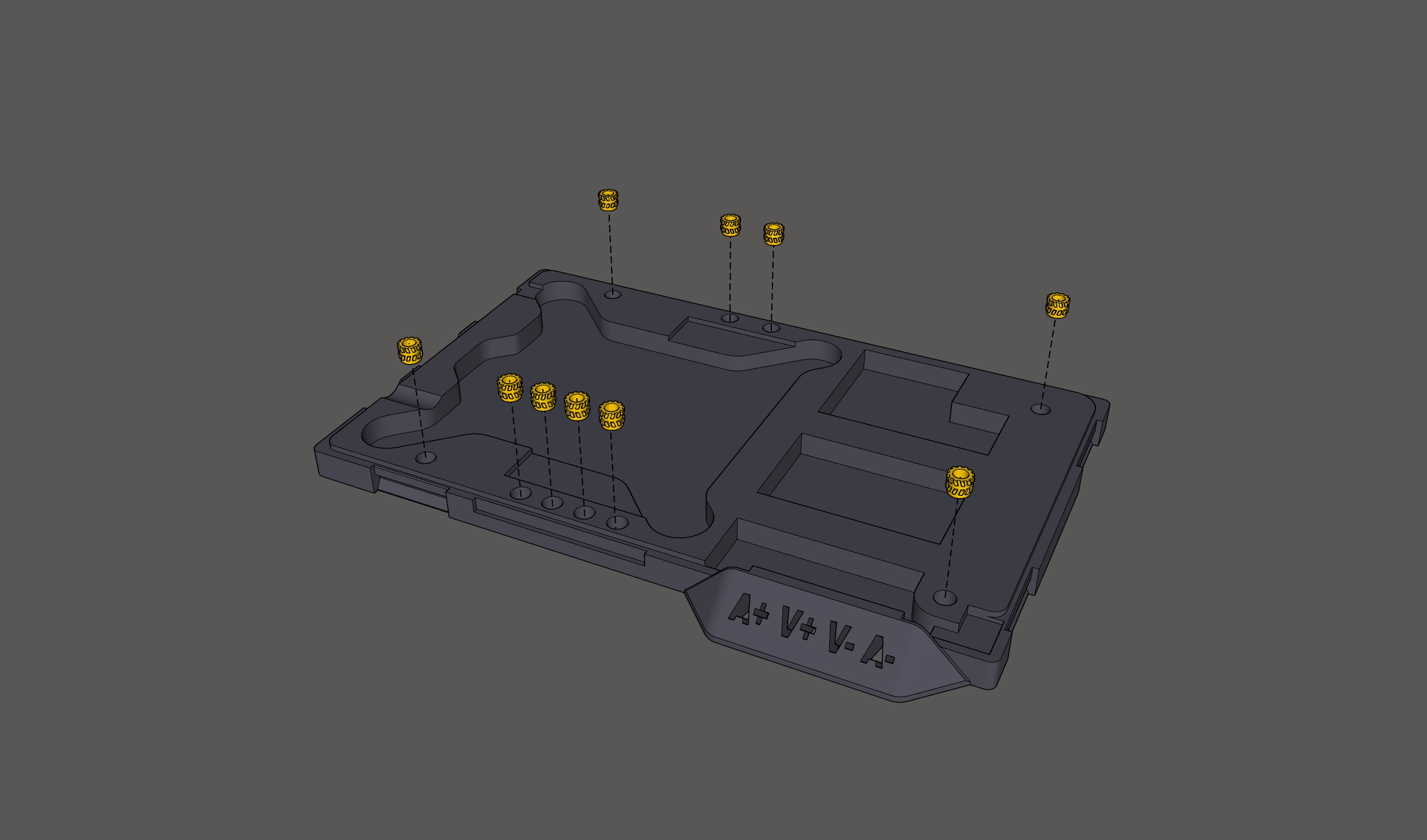 1) Đầu tiên, lắp 10 long đền ép nhiệt từ phía trên vào phần Atorch Bottom - Heat-Set nuts của vỏ hộp: