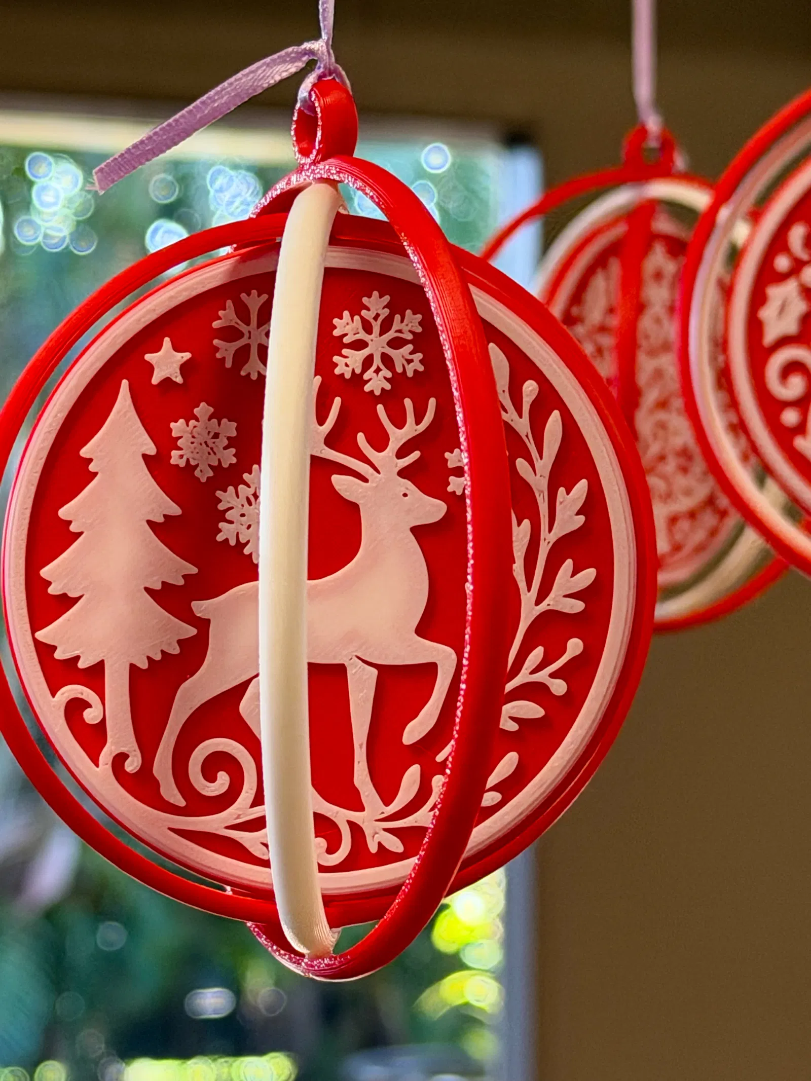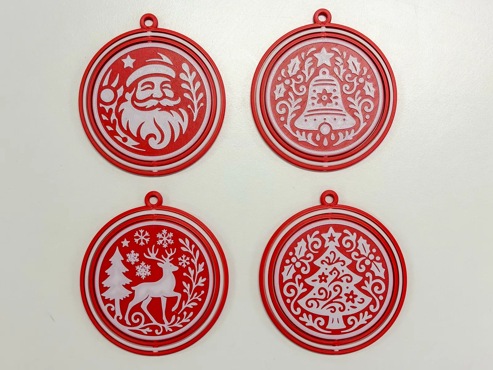 Bộ bốn món đồ trang trí Giáng sinh xoay độc đáo, dễ in nhiều màu mà không cần AMS. Tạo hiệu ứng hai tông màu bằng cách đổi màu sợi nhựa thủ công. Thích hợp để tự làm đồ trang trí lễ hội.