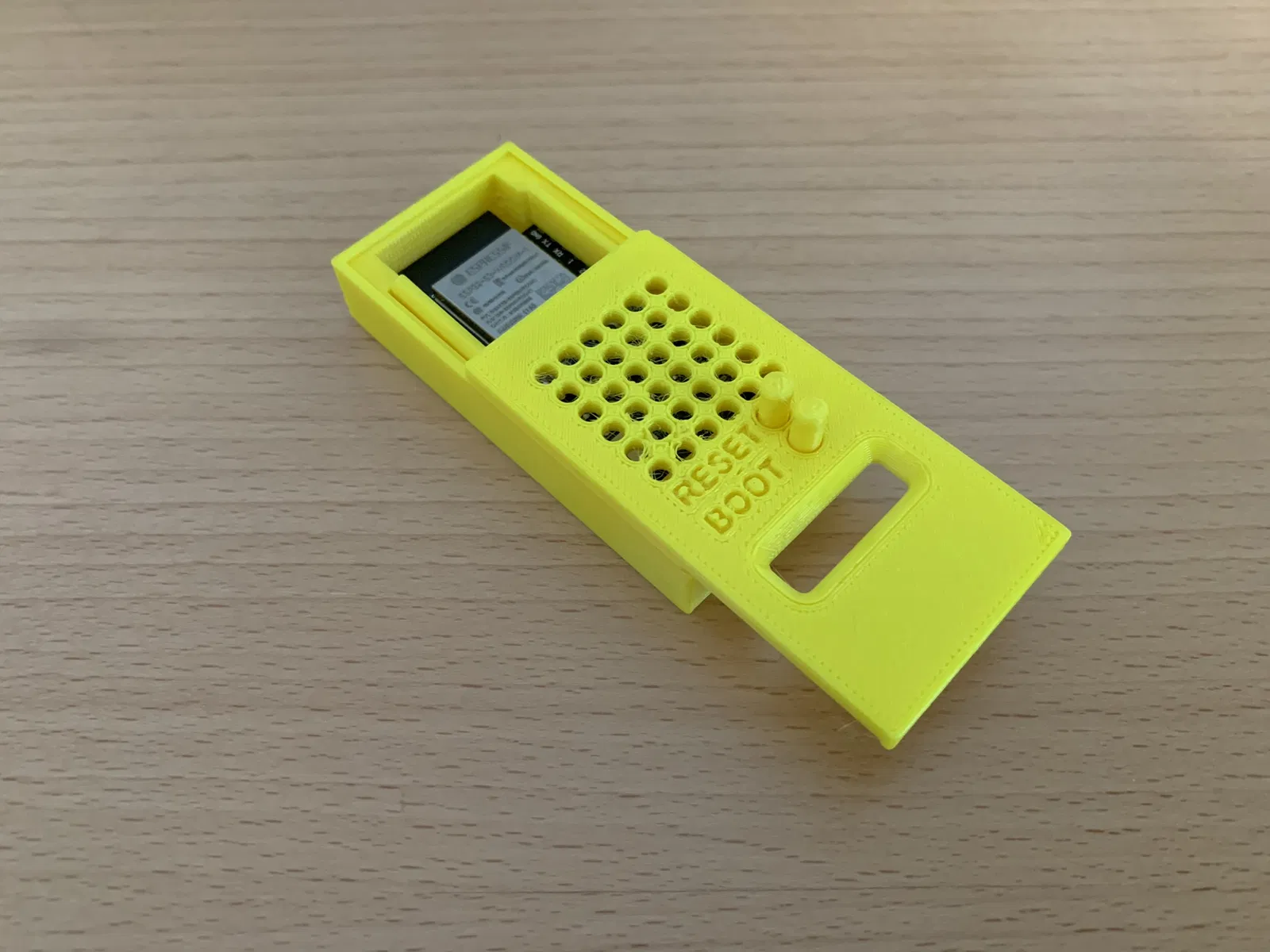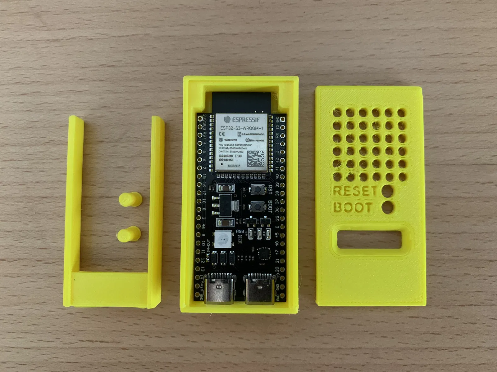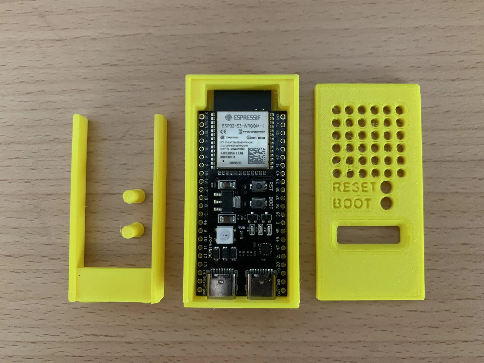 Cái vỏ này vừa với Bộ phát triển Teyleten Robot ESP32-S3 mà Amazon bán... https://www.amazon.com/dp/B0B6HT7V7P?psc=1&ref=ppx_yo2ov_dt_b_product_details Bộ phát triển này có hai cổng USB-C mà không có chân hàn sẵn trên bo mạch. Nếu bo mạch của bạn đã được hàn chân sẵn, hãy đo chiều dài và thay đổi "Height_Pins" trong mô hình Fusion 360. Nắp trượt trên đáy và các dung sai được thiết kế khít; tuy nhiên, bạn có thể cần điều chỉnh chúng cho máy in của mình. Chiều dài, chiều rộng và chiều cao bên trong có thể được tinh chỉnh bằng các tham số. Các nút bấm phải được giữ cố định khi trượt nắp vào hoặc ra. Một số bộ phận được sơn phủ hỗ trợ và in bằng PETG: * Nút bấm - Không cần vật liệu hỗ trợ.