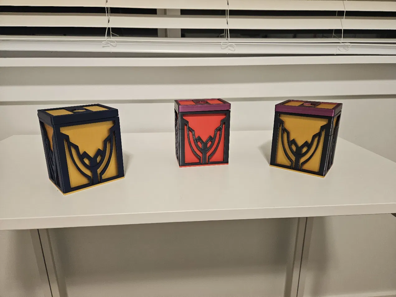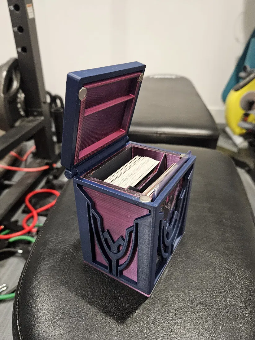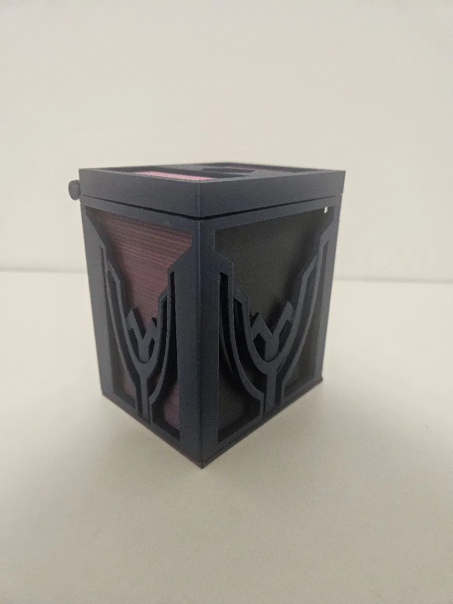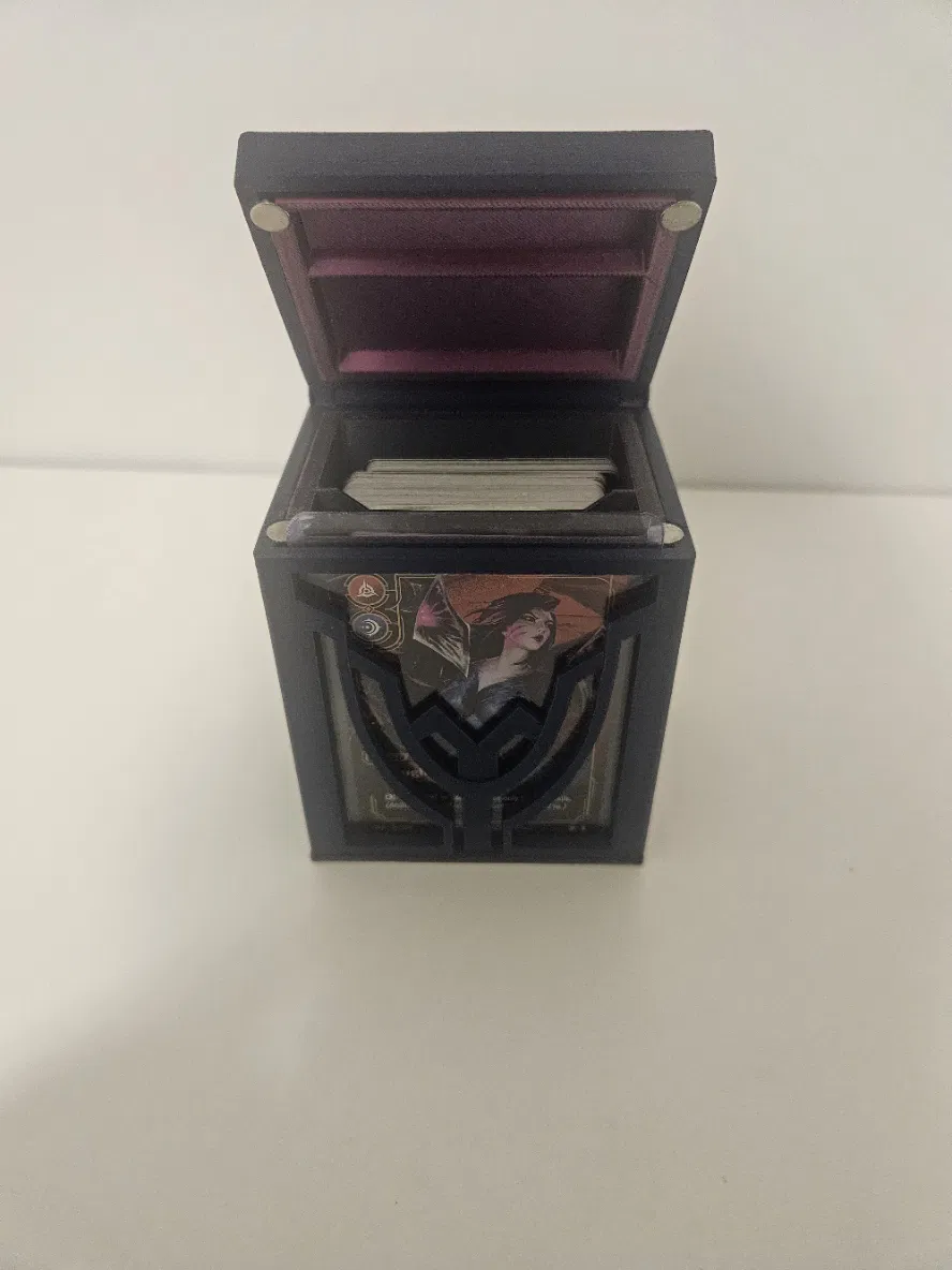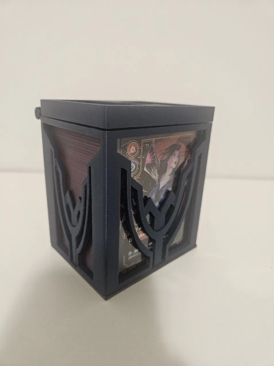 Bản remix hộp bài Hextech cho game thẻ bài Riftbound (League of Legends). Hộp được tùy chỉnh để vừa nam châm lớn hơn và có khe cắm thẻ hiển thị trong ốp cứng. Giảm chi tiết mặt trước để tăng tính thẩm mỹ.