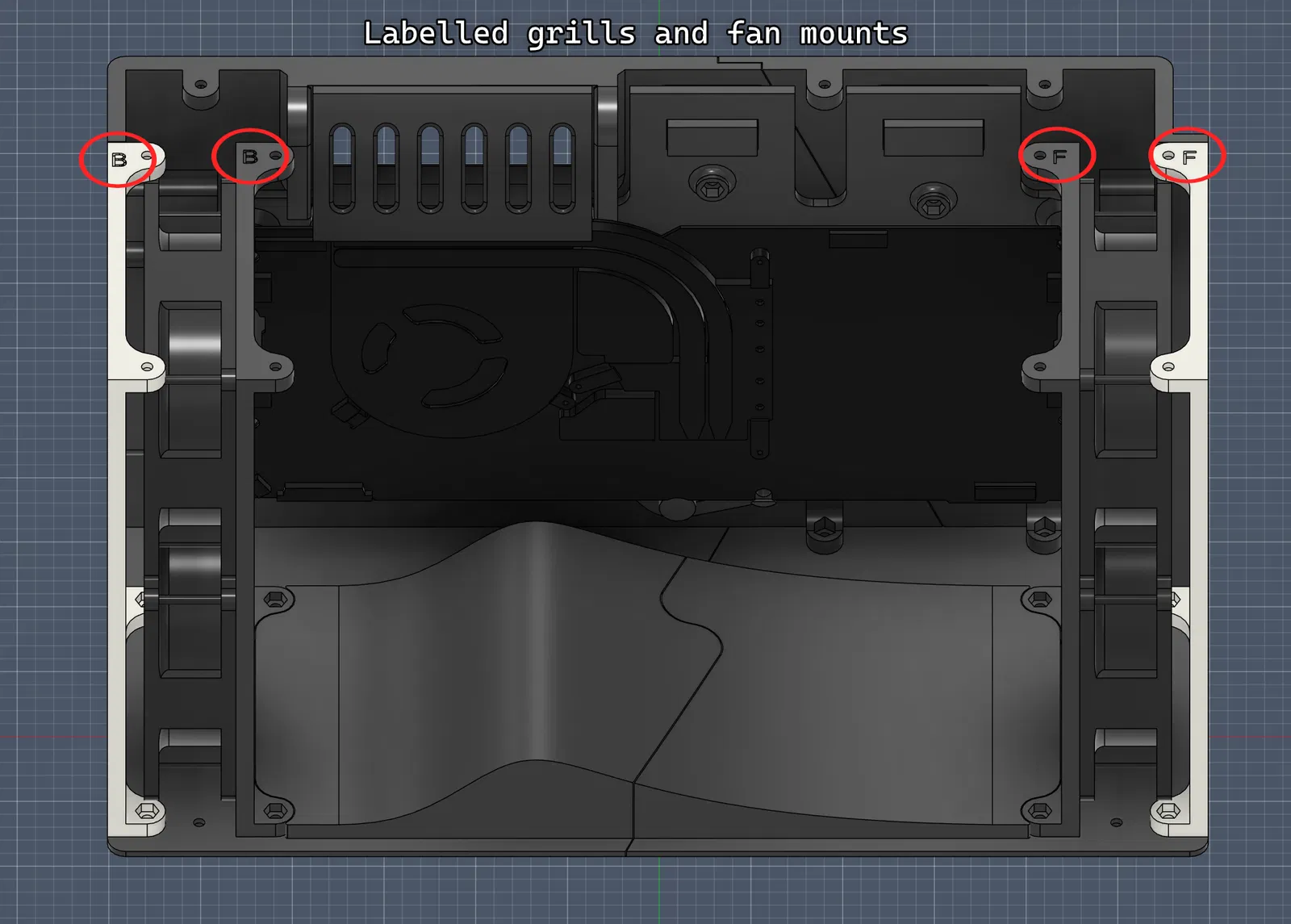 Top ← Lưới quạt x2 (hai vít M3*6 cho mỗi lưới).