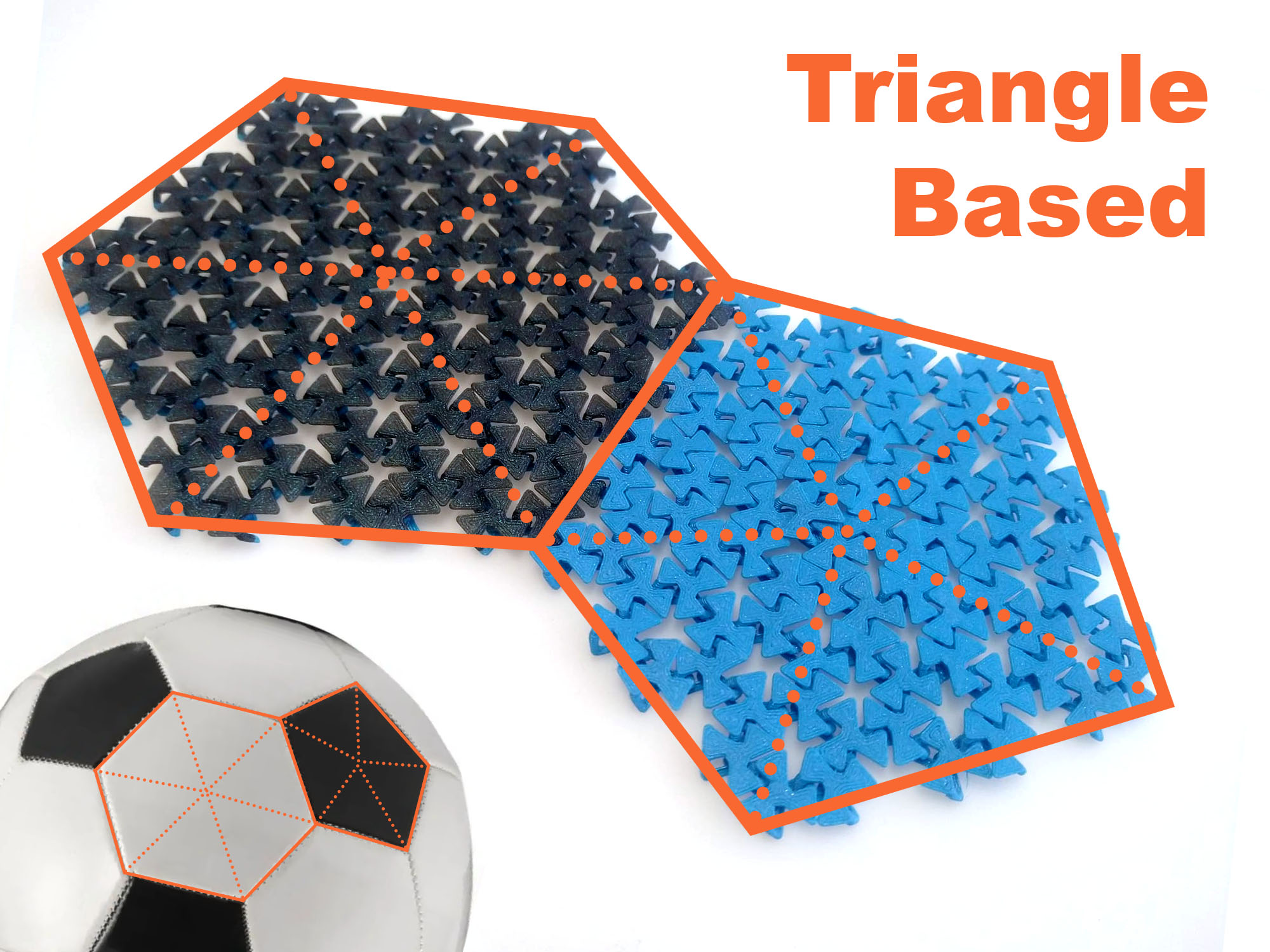 Dựa trên hình tam giác Hầu hết các loại vải in 3D đều dựa trên hình vuông hoặc lục giác, mấy cái này chỉ để lát mặt phẳng thôi. TriFlex thì dựa trên lưới hình tam giác, có thể ráp thành hình lục giác (mặt phẳng) nhưng cũng có thể thành hình ngũ giác và hình vuông cho các bề mặt cong lõm hoặc cong lồi. Mục tiêu cuối cùng của tui là làm một cái váy bằng loại vải này, nhưng ở đây bạn có thể thấy cách mà các bộ phận hình tam giác có thể tạo ra các hình dạng phức tạp như các khối xây dựng của trái bóng đá nè: