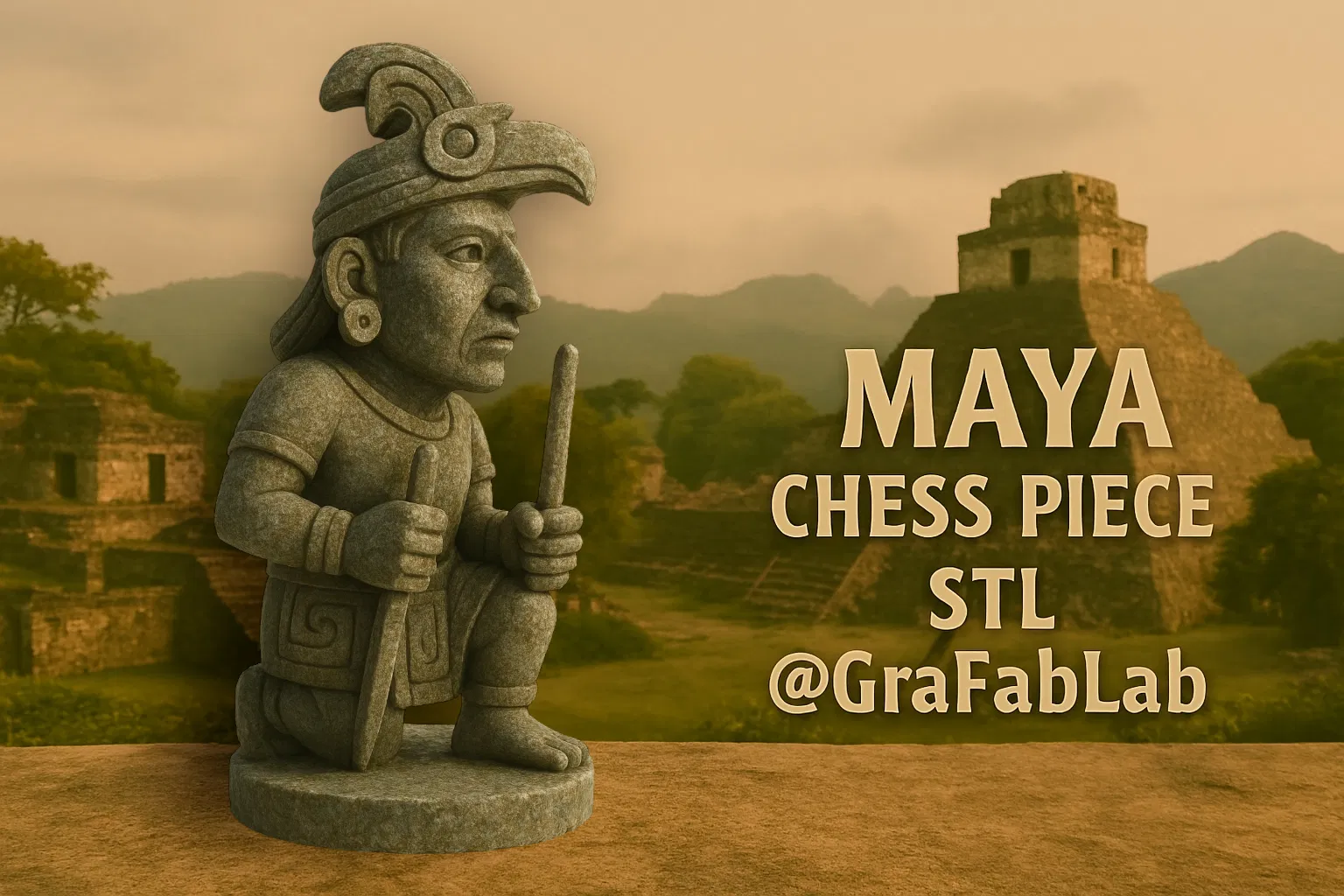 Tượng cờ vua Maya "Bishop" - một vị Trưởng Lão trên con đường chéo, kẻ du hành giữa các thế giới, người mang theo lời tiên tri. Với áo choàng lông vũ, ông vượt qua những giấc mơ và ác mộng, lặn vào sương mù thời gian để mang về những lời sấm.